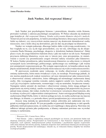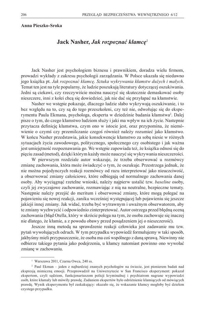 206 PRZEGLĄD BEZPIECZEŃSTWA WEWNĘTRZNEGO 6/12 Anna Pieszko-Sroka Jack Nasher, Jak rozpoznać kłamcę1 Jack Nasher jest psychologiem biznesu i prawnikiem, doradza wielu firmom, prowadzi wykłady z zakresu psychologii zarządzania. W Polsce ukazała się niedawno jego książka pt. Jak rozpoznać kłamcę. Sztuka wykrywania kłamstw dużych i małych. Temat ten jest na tyle popularny, że ludzie poszukują literatury dotyczącej oszukiwania. Jedni są ciekawi, czy rzeczywiście można nauczyć się skutecznie demaskować osoby nieszczere, inni z kolei chcą się dowiedzieć, jak nie dać się przyłapać na kłamstwie. Nasher we wstępie pokazuje, dlaczego ludzie słabo wykrywają oszukiwanie, i to bez względu na to, czy są do tego przeszkoleni, czy też nie, odwołując się do eksperymentu Paula Ekmana, psychologa, eksperta w dziedzinie badania kłamstwa2. Dalej pisze o tym, do czego kłamstwo ludziom służy i jaki ma wpływ na ich życie. Nastepnie przytacza definicję kłamstwa, czym ono w istocie jest, oraz przypomina, że niemówienie o czymś czy przemilczanie czegoś również należy rozumieć jako kłamstwo. W końcu Nasher przedstawia, jakie konsekwencje kłamstwo za sobą niesie w różnych sytuacjach życia zawodowego, politycznego, społecznego czy osobistego i jak ważna jest umiejętność rozpoznawania go. We wstępie zapowiada też, że książka odnosi się do pięciu zasad (metod), dzięki którym każdy może nauczyć się wykrywania nieszczerości. W pierwszym rozdziale autor wskazuje, że trzeba obserwować u rozmówcy zmianę zachowania, która może świadczyć o tym, że oszukuje. Przestrzega jednak, że nie można pojedynczych reakcji rozmówcy od razu interpretować jako nieuczciwość, a obserwować zmiany całościowe, które odbiegają od normalnego zachowania danej osoby. Aby wyciągnąć rzetelne wnioski, należy najpierw ustalić tzw. baseline osoby, czyli jej zwyczajowe zachowanie, rozmawiając z nią na neutralne, bezpieczne tematy. Następnie należy przejść do meritum i obserwować zmiany, które mogą polegać na pojawieniu się nowej reakcji, zaniku wcześniej występującej lub pojawieniu się jeszcze jakiejś innej zmiany. Jak widać, trzeba być wytrawnym i uważnym obserwatorem, aby te zmiany wychwycić i odpowiednio zinterpretować. Autor ostrzega przed błędną oceną zachowania (błąd Otella, który w skrócie polega na tym, że osoba zachowuje się inaczej nie dlatego, że kłamie, a z powodu obawy przed posądzeniem jej o nieszczerość). Jeszcze inną metodą na sprawdzenie reakcji człowieka jest zadawanie mu tzw. pytań wywołujących odruch. W tym przypadku wypowiedź formułujemy w taki sposób, jakbyśmy mieli przypuszczenie, że osoba ma coś wspólnego z daną sprawą. Niewinny nie odbierze takiego pytania jako podejrzenia, u kłamcy natomiast powinno ono wywołać zmianę w zachowaniu. Warszawa 2011, Czarna Owca, 240 ss. Paul Ekman – jeden z najbardziej znanych psychologów na świecie, jest pionierem badań nad ekspresją mimiczną emocji. Przeprowadził na Uniwersytecie w San Francisco eksperyment: pokazał ekspertom, czyli sędziom, funkcjonariuszom policji kryminalnej i psychiatrom nagrane wypowiedzi osób, które kłamały lub mówiły prawdę. Zadaniem ekspertów było odróżnienie kłamiących od mówiących prawdę. Wynik eksperymentu był zaskakujący: okazało się, że wskazanie kłamcy mogłoby być dziełem czystego przypadku. 1 2 VII. RECENZJE 207 W drugim rozdziale autor opisuje trzy emocje, które towarzyszą kłamaniu. Opiera się tutaj na odkryciu Ekmana. Emocje te to strach, radość z kłamania i poczucie winy3. Autor pokazuje, jak nimi manipulować, aby zaobserwować istotne zmiany w zachowaniu osoby, a także zwrócić na te reakcje uwagę wtedy, gdy pojawią się w momencie nieadekwatnym do sytuacji. Ekman w swojej kilkudziesięcioletniej pracy, badając te afekty, wykrył, że są one zauważalne nie tylko podczas bezpośredniej rozmowy, lecz także podczas wystąpień publicznych i dyplomatycznych spotkań, zawsze wtedy, gdy ktoś kłamie. Wychwycenie ich pozwala na wykrycie nieszczerości nie tylko w trakcie bezpośredniej rozmowy, lecz także wtedy, gdy jesteśmy tylko obserwatorami z zewnątrz4. Kolejną zasadą w wykrywaniu kłamstwa, którą opisuje autor, jest zasada dysharmonii. Dotyczy ona niezgodności w mimice, komunikacji niewerbalnej i zachowaniu osoby nieszczerej. Autor, przytaczając badania Ekmana, opisuje poszczególne typy dysharmonii. W tym rozdziale przybliża pojęcie mikroekspresji, które są wyrazami twarzy trwającymi zaledwie ułamki sekund, wyrażającymi autentyczne emocje. Człowiek nie jest w stanie ich kontrolować, aby ukryć prawdziwe intencje. Z drugiej strony bardzo trudno je zauważyć, bo trwają bardzo krótko. Ten rozdział autor podsumowuje stwierdzeniem, że kłamcy nie potrafią kontrolować jednocześnie wszystkich kanałów, którymi się komunikują. U ludzi szczerych widoczna jest spójność tego, co mówią z tym, jak to robią i jak się wówczas zachowują. Należy zwracać uwagę na nieścisłości w zachowaniu, wyglądzie i formułowanych treściach. W kolejnym rozdziale Nasher stwierdza, że człowiek nieszczery stale musi dostosowywać swoje zachowanie do zmieniających się warunków otoczenia. W związku z przeciążeniem poznawczym doświadcza stresu, który dla wielu psychologów jest głównym wskaźnikiem kłamstwa. Autor wskazuje, że osoby, których funkcje zawodowe wymagają dochodzenia do prawdy, jak funkcjonariusze policji, agencji dbających o bezpieczeństwo państwa, urzędnicy skarbowi, szkolą się w coraz to bardziej efektywnych technikach przesłuchań, aby wywoływać reakcję strachu u osoby przesłuchiwanej. Typowe symptomy stresu to zmiana tonu głosu i mowy oraz oznaki pozawerbalne. Pokazuje również, jak zwiększyć poziom stresu, stosując technikę zadawania pytań szczegółowych. Następnie przedstawia tę samą m