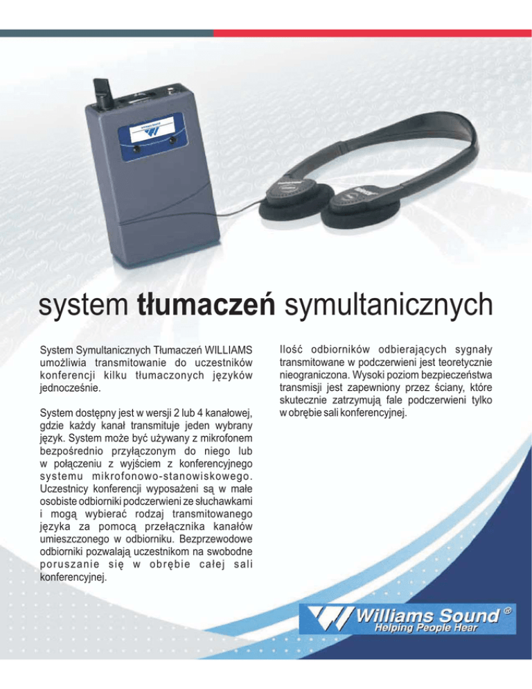 system t³umaczeñ symultanicznych System Symultanicznych T³umaczeñ WILLIAMS umo¿liwia transmitowanie do uczestników konferencji kilku t³umaczonych jêzyków jednoczeœnie. System dostêpny jest w wersji 2 lub 4 kana³owej, gdzie ka¿dy kana³ transmituje jeden wybrany jêzyk. System mo¿e byæ u¿ywany z mikrofonem bezpoœrednio przy³¹czonym do niego lub w po³¹czeniu z wyjœciem z konferencyjnego systemu mikrofonowo-stanowiskowego. Uczestnicy konferencji wyposa¿eni s¹ w ma³e osobiste odbiorniki podczerwieni ze s³uchawkami i mog¹ wybieraæ rodzaj transmitowanego jêzyka za pomoc¹ prze³¹cznika kana³ów umieszczonego w odbiorniku. Bezprzewodowe odbiorniki pozwalaj¹ uczestnikom na swobodne poruszanie siê w obrêbie ca³ej sali konferencyjnej. Iloœæ odbiorników odbieraj¹cych sygna³y transmitowane w podczerwieni jest teoretycznie nieograniczona. Wysoki poziom bezpieczeñstwa transmisji jest zapewniony przez œciany, które skutecznie zatrzymuj¹ fale podczerwieni tylko w obrêbie sali konferencyjnej. 4 kana³owa transmisja w Podczerwieni komponenty systemu Odbiorniki Ka¿dy odbiornik oferuje odbiór 4-ch jêzykowych kana³ów. Jest ³atwy w u¿yciu, lekki, miniaturowy i wygodny w noszeniu. U¿ytkownik ma mo¿liwoœæ wyboru odbierania jêzyka za pomoc¹ prze³¹cznika kana³ów umieszczonego w górnej czêœci odbiornika. G³oœnoœæ mo¿e byæ p³ynnie regulowana pokrêt³em, umo¿liwiaj¹c komfortowe s³uchanie. Najwy¿sza jakoœæ obwodów elektronicznych gwarantuje wyj¹tkow¹ zrozumia³oœæ mowy, du¿y poziom g³oœnoœci i bardzo niski pobór pr¹du dla przed³u¿enia ¿ywotnoœci baterii. Modele mog¹ byæ wyposa¿one równie¿ w ³adowalne akumulatorki. Ka¿dy z odbiorników posiada podwójne obwody wykrywania fal podczerwonych co zapewnia wysok¹ czu³oœæ. To pozwala zapewniæ prawid³owy odbiór nawet na granicach stref zasiêgu promiennika podczerwieni. S³uchawki Do wspó³pracy z odbiornikami przewidziano ró¿ne typy s³uchawek od konwencjonalnych dynamicznych do ulra-lekkich modeli typu stetoskop. W ten sposób optymalizuje siê wybór do sytuacji podczas konferencji. Promienniki Panelowe Panelowe promienniki podczerwieni emituj¹ fale w obrêbie pomieszczenia lub sali konferencyjnej. Mog¹ byæ mocowane na œcianach, suficie lub na statywach pod³ogowych. Wysoka efektywnoœæ promienników pozwala na pokrycie zasiêgiem du¿ego obszaru w sposób ekonomiczny za pomoc¹ kilku urz¹dzeñ. Modulatory Modulatory generuj¹ fale noœne dla ka¿dego z 4-ch kana³ów jêzykowych i steruj¹ nimi panelowe Promienniki Podczerwieni. Modulatory maj¹ miniaturowe rozmiary, zajmuj¹c jedynie przestrzeñ jednego 19” racka dla potrzeb transmisji 4-ch kana³ów. • T³umaczenie Jêzyków • Konferencje • Pokoje Multi-Medialne • Sale Narad • Sale S¹dowe • Szko³y • Uniwersytety • Agencje Rz¹dowe tel. 058 341 18 39 Dystrybucja: www.bel-aqustic.com.pl
