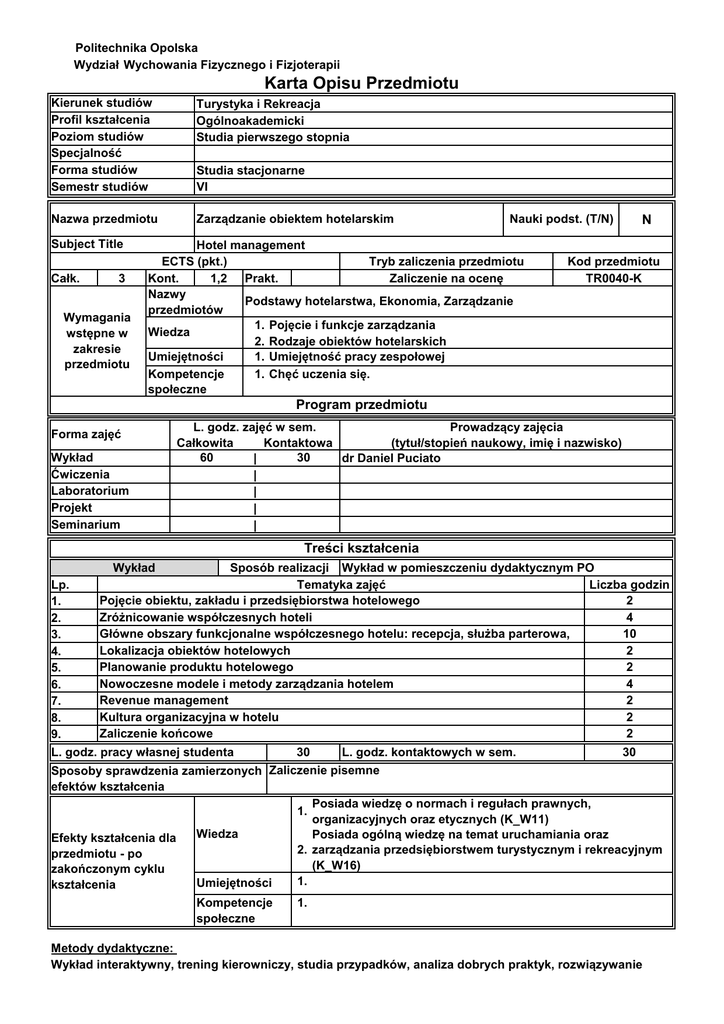 Politechnika Opolska Wydział Wychowania Fizycznego i Fizjoterapii Karta Opisu Przedmiotu Kierunek studiów Profil kształcenia Poziom studiów Specjalność Forma studiów Semestr studiów Turystyka i Rekreacja Ogólnoakademicki Studia pierwszego stopnia Nazwa przedmiotu Zarządzanie obiektem hotelarskim Subject Title Całk. 3 Wymagania wstępne w zakresie przedmiotu Studia stacjonarne VI Nauki podst. (T/N) Hotel management ECTS (pkt.) Tryb zaliczenia przedmiotu Kont. 1,2 Prakt. Zaliczenie na ocenę Nazwy Podstawy hotelarstwa, Ekonomia, Zarządzanie przedmiotów 1. Pojęcie i funkcje zarządzania Wiedza 2. Rodzaje obiektów hotelarskich Umiejętności 1. Umiejętność pracy zespołowej Kompetencje 1. Chęć uczenia się. społeczne N Kod przedmiotu TR0040-K Program przedmiotu Forma zajęć Wykład Ćwiczenia Laboratorium Projekt Seminarium L. godz. zajęć w sem. Prowadzący zajęcia Całkowita Kontaktowa (tytuł/stopień naukowy, imię i nazwisko) 60 30 dr Daniel Puciato | | | | | Treści kształcenia Sposób realizacji Wykład w pomieszczeniu dydaktycznym PO Tematyka zajęć Liczba godzin Pojęcie obiektu, zakładu i przedsiębiorstwa hotelowego 2 Zróżnicowanie współczesnych hoteli 4 Główne obszary funkcjonalne współczesnego hotelu: recepcja, służba parterowa, 10 Lokalizacja obiektów hotelowych 2 Planowanie produktu hotelowego 2 Nowoczesne modele i metody zarządzania hotelem 4 Revenue management 2 Kultura organizacyjna w hotelu 2 2 Zaliczenie końcowe Wykład Lp. 1. 2. 3. 4. 5. 6. 7. 8. 9. L. godz. pracy własnej studenta 30 L. godz. kontaktowych w sem. 30 Sposoby sprawdzenia zamierzonych Zaliczenie pisemne efektów kształcenia Posiada wiedzę o normach i regułach prawnych, 1. organizacyjnych oraz etycznych (K_W11) Wiedza Posiada ogólną wiedzę na temat uruchamiania oraz Efekty kształcenia dla 2. zarządzania przedsiębiorstwem turystycznym i rekreacyjnym przedmiotu - po (K_W16) zakończonym cyklu 1. Umiejętności kształcenia Kompetencje społeczne 1. Metody dydaktyczne: Wykład interaktywny, trening kierowniczy, studia przypadków, analiza dobrych praktyk, rozwiązywanie problemów decyzyjnych problemów decyzyjnych Forma i warunki zaliczenia przedmiotu: Zaliczenie w formie pisemnej - 5 pytań opisowych: 51-60% - 3,0, 61-70% - 3,5, 71-80% - 4,0, 81-90% - 4,5, 91100% - 5,0. Literatura podstawowa: Kachniewska M., Uwarunkowania konkurencyjności przedsiębiorstwa hotelowego, Oficyna [1] Wydawnicza Szkoły Głównej Handlowej, Warszawa 2009. [2] Konieczna-Domańska A., Gospodarka turystyczna, SGH, Warszawa 2013. Nawrocka E., Oparka S., Hotel w XXI wieku. Zarządzanie w warunkach globalizacji, Wydawnictwo [3] Wyższej Szkoły Zarządzania „Edukacja”, Wrocław 2007. [4] Panasiuk A., Szostak D., Hotelarstwo, Wydawnictwo Naukowe PWN, Warszawa 2008. Sala J., Formy współczesnego hotelarstwa, Wydawnictwo Uniwersytetu Ekonomicznego w Krakowie, [5] Kraków 2008. [6] [7] Literatura uzupełniająca: Bednarska M., Gołembski G., Markiewicz E., Olszewski M., Przedsiębiorstwo turystyczne. Ujęcie [1] statyczne i dynamiczne, Polskie Wydawnictwo Ekonomiczne, Warszawa 2007. [2] Rapacz A., Przedsiębiorstwo turystyczne, Wydawnictwo Difin, Warszawa 2007. Zawistowska H., Podejmowanie i prowadzenie działalności gospodarczej w turystyce, Oficyna [3] Wydawnicza Szkoły Głównej Handlowej, Warszawa 2010. [4] Łobos K., Puciato D., Dekalog współczesnego zarządzania, Difin, Warszawa 2013. Puciato D., Przesłanki lokalizacji wybranych przedsiębiorstw hotelowych z Opola. „Infrastruktura i [5] Ekologia Terenów Wiejskich” 2011, nr 2, s. 113-120. Puciato D., Goranczewski B., Application of relationship marketing tools by hotel companies, „Studies [6] in Physical Culture and Tourism” 2010, nr 1, s. 71-79. ………………………………………………….. ………………………………………………………. (kierownik jednostki organizacyjnej/bezpośredni przełożony: pieczęć/podpis (Dziekan Wydziału pieczęć/podpis)