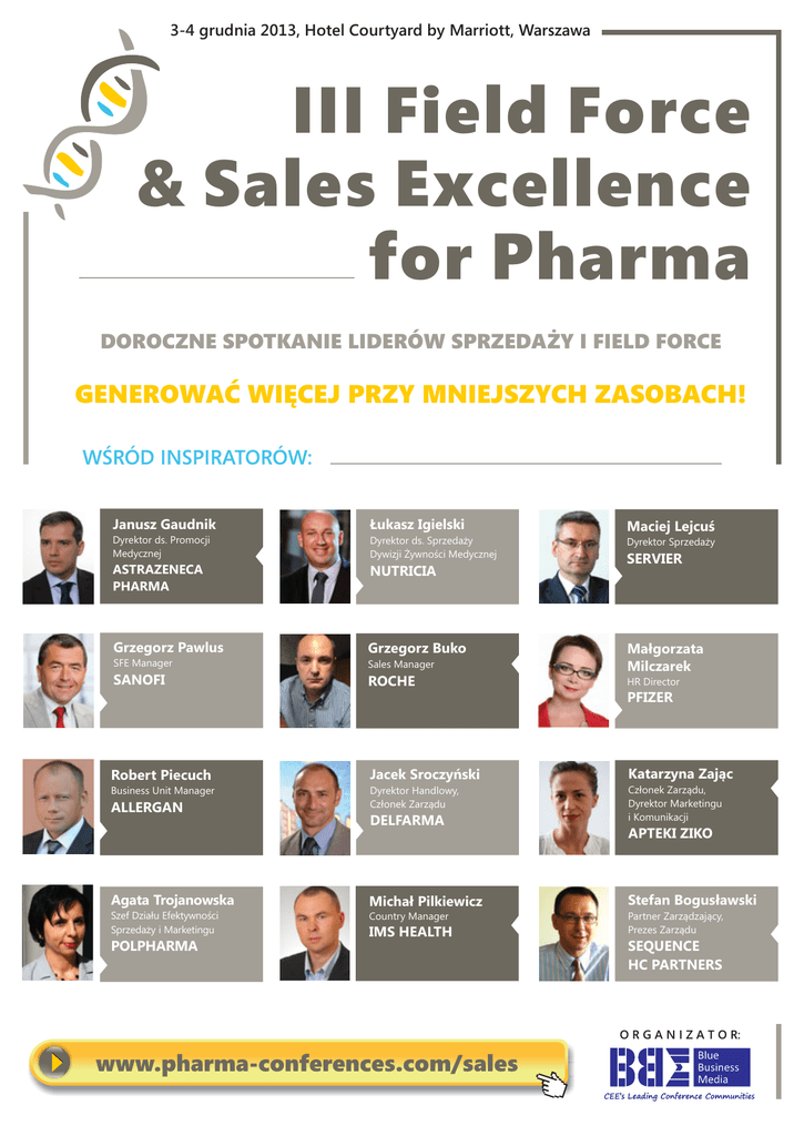 3-4 grudnia 2013, Hotel Courtyard by Marriott, Warszawa III Field Force & Sales Excellence for Pharma DOROCZNE SPOTKANIE LIDERÓW SPRZEDAŻY I FIELD FORCE GENEROWAĆ WIĘCEJ PRZY MNIEJSZYCH ZASOBACH! WŚRÓD INSPIRATORÓW: Janusz Gaudnik Łukasz Igielski Maciej Lejcuś Dyrektor ds. Promocji Medycznej Dyrektor ds. Sprzedaży Dywizji Żywności Medycznej Dyrektor Sprzedaży ASTRAZENECA PHARMA NUTRICIA Grzegorz Pawlus Grzegorz Buko SFE Manager Sales Manager SANOFI Małgorzata Milczarek ROCHE HR Director SERVIER PFIZER Robert Piecuch Jacek Sroczyński Katarzyna Zając Business Unit Manager Dyrektor Handlowy, Członek Zarządu Członek Zarządu, Dyrektor Marketingu i Komunikacji ALLERGAN DELFARMA APTEKI ZIKO Agata Trojanowska Michał Pilkiewicz Stefan Bogusławski Szef Działu Efektywności Sprzedaży i Marketingu Country Manager Partner Zarządzający, Prezes Zarządu IMS HEALTH POLPHARMA SEQUENCE HC PARTNERS O R G A N I Z A T O R: www.pharma-conferences.com/sales III Field Force & Sales Excellence for Pharma Wprowadzenie Zapraszam Państwa, jak co roku, do otwartej wymiany wzajemnych doświadczeń, innowacji, inspiracji i najlepszych praktyk podczas spotkania liderów sprzedaży i Field Force branży farmaceutycznej, ponieważ chcemy wspomóc Państwa firmy w ulepszaniu wszelkich aspektów Państwa sprzedaży! Ponad rok od rewolucji prawnej 2012 r. wciąż mówią Państwo o intensywnych poszukiwaniach sposobów na podniesienie efektywności kosztowej i dostosowywaniu firm do dynamicznie zmieniających się warunków rynkowych (np. do rosnącej pozycji sieci aptecznych!). Główne wyzwania, które Państwo obecnie wskazują, to bycie liderem w obliczu ciągłej presji KPI i targetów, utrzymywanie wyników niezależnie od zawirowań i nieustanne poszukiwanie innowacji. Konieczne jest zapewnianie motywacji i efektywności zespołu sprzedażowo-marketingowego, by pomimo ograniczonych zasobów nie pozostać w tyle za konkurencją. Podczas spotkania przedstawione zostaną cenne inspiracje i unikalne strategie oparte na autorskich zestawach taktyk, implementacji innowacyjnych rozwiązań oraz umiejętnym wykorzystaniu wsparcia systemów BI i CRM, czyli na skutecznym Sales Performance. Tu nie powinno zabraknąć żadnego z profesjonalistów sprzedaży branży farmaceutycznej, który chce rozwijać i doskonalić swoją praktykę – ku Sales Excellence! Aleksandra Schoen-Żmijowa - Project Director +48 12 35 05 424 [email protected] PS. W czasach zawirowań tym bardziej trzeba włączyć się w dialog! Tylko do 4 października najniższa cena! Dlaczego warto dołączyć do społeczności Field Force & Sales Excellence for Pharma l l l Co roku spotkanie wspiera doskonalenie procesów sprzedażowych firm z branży farmaceutycznej poprzez otwartą, interaktywną wymianę doświadczeń, inspiracji, innowacji i najlepszych praktyk Integrujemy środowisko profesjonalistów sprzedaży farmaceutycznej tworząc przestrzeń spotkania przedstawicieli różnych biznesów i unitów Wzbogacamy Państwa praktykę poprzez prezentację „gorących” tematów, które wskazali nam uczestnicy poprzednich spotkań społeczności tej konferencji! „Praktycy dla praktyków. Tak można w skrócie podsumować Konferencję Field Force & Sales Excellence for Pharma. Ponieważ żyjemy w ciekawych czasach, wartością samą w sobie staje się możliwość wymiany doświadczeń, dyskusja nad kluczowymi wyzwaniami i problemami czy też sposobność uczenia się od innych. Te trzy elementy znalazłem w tym roku podczas tej dwu dniowej konferencji skierowanej do praktyków sprzedaży oraz managerów bezpośrednio zarządzających zespołami handlowymi.” Michał Pilkiewicz Country Director, IMS Health Kto powinien wziąć udział: 36% 24% 23% 9% 8% Prezes Zarządu Dyrektor, Kierownik Sprzedaży Business Unit Director i Manager SFE, FF Director Business Support Director i Manager Dzień I 3 grudnia 2013, wtorek PROGRAM PROWADZĄCY: Radosław Chomiuk, 9:00 Rejestracja i poranna kawa 9:30 Inauguracja spotkania oraz „sesja networkingowa” Casper Haring, Managing Director, BLUE BUSINESS MEDIA Aleksandra Schoen-Żmijowa, Project Director, BLUE BUSINESS MEDIA Już na samym początku zapraszamy do otwarcia się na wzajemną wymianę inspiracji i doświadczeń! SALES PERFORMANCE 2013/2014 – STRATEGICZNE WYZWANIA I NOWE TRENDY PO ZMIANACH NA RYNKU 9:45 Obraz rynku – otoczenie sprzedaży – jak wygląda dziś rynek, jakie są wyzwania dla szefów sprzedaży Michał Pilkiewicz, Country Manager, IMS HEALTH l Jak zmienił się rynek l Nowe wyzwania – rozwój sieci aptecznych i handel równoległy l Prognozy na przyszłość 10:15 Interaktywna sesja pytań i odpowiedzi 10:25 Dyskusja panelowa: Innowacje w strategiach sprzedażowych i nowe trendy Moderator: Michał Pilkiewicz, Country Manager, IMS HEALTH Paneliści: Łukasz Igielski, Dyrektor ds. Sprzedaży, Dywizja Żywności Medycznej, NUTRICIA Maciej Lejcuś, Dyrektor Sprzedaży, SERVIER Jacek Sroczyński, Dyrektor Handlowy, Członek Zarządu, DELFARMA l Nowy model zarządzania sprzedażą – najlepsze praktyki i inspiracje l Gdzie w sprzedaży można szukać oszczędności, optymalizacji i efektywności l Elastyczność teamu – jak przy okrojonych składach realizować cele 11:05 Przerwa na kawę i na wymianę wizytówek 11:25 Nowa rola Producenta w optymalizacji efektywności sprzedaży Artur Śpiewak, Zastępca Szefa Wydziału Wdrożeń Systemów Mobilnych i Platformy Connector, ASSECO BUSINESS SOLUTIONS l Nowe wyzwania dla Producenta związane z zarządzaniem sprzedażą i dostępnością własnych produktów Budowa sprawności biznesowej przy współpracy l z dystrybutorami l Korzyści ze wzrostu zaangażowania Producenta 11:40 Interaktywna sesja pytań i odpowiedzi ROZWÓJ SIECI APTECZNYCH – NOWA REWOLUCJA NA RYNKU? 11:45 Czego sieci apteczne oczekują dziś od producentów Katarzyna Zając, Członek Zarządu, Dyrektor Marketingu i Komunikacji, APTEKI ZIKO l Czego pra