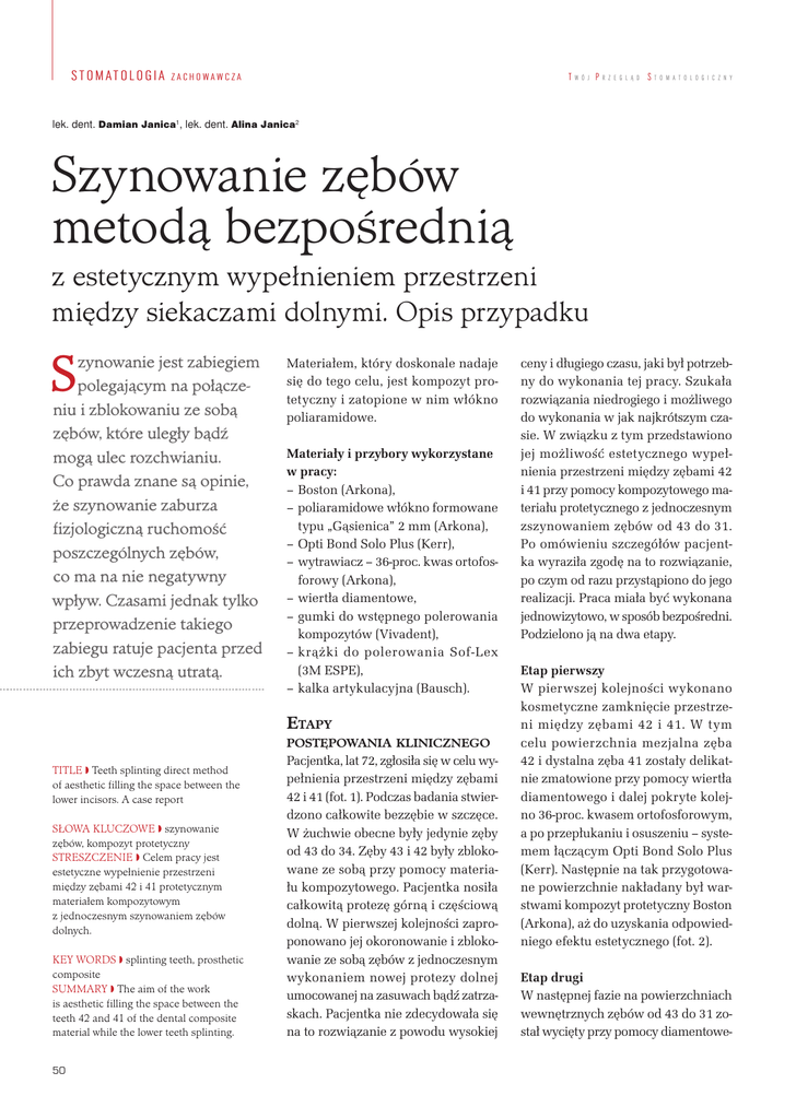 S TOMATOLOGIA T ZACHOWAWCZA W Ó J P R Z E G L Ą D S T O M A T O L O G I C Z N Y lek. dent. Damian Janica1, lek. dent. Alina Janica2 Szynowanie zębów metodą bezpośrednią z estetycznym wypełnieniem przestrzeni między siekaczami dolnymi. Opis przypadku S zynowanie jest zabiegiem polegającym na połączeniu i zblokowaniu ze sobą zębów, które uległy bądź mogą ulec rozchwianiu. Co prawda znane są opinie, że szynowanie zaburza fizjologiczną ruchomość poszczególnych zębów, co ma na nie negatywny wpływ. Czasami jednak tylko przeprowadzenie takiego zabiegu ratuje pacjenta przed ich zbyt wczesną utratą. Materiałem, który doskonale nadaje się do tego celu, jest kompozyt protetyczny i zatopione w nim włókno poliaramidowe. Materiały i przybory wykorzystane w pracy: – Boston (Arkona), – poliaramidowe włókno formowane typu „Gąsienica” 2 mm (Arkona), – Opti Bond Solo Plus (Kerr), – wytrawiacz – 36-proc. kwas ortofosforowy (Arkona), – wiertła diamentowe, – gumki do wstępnego polerowania kompozytów (Vivadent), – krążki do polerowania Sof-Lex (3M ESPE), – kalka artykulacyjna (Bausch). ETAPY POSTĘPOWANIA KLINICZNEGO TITLE Teeth splinting direct method of aesthetic filling the space between the lower incisors. A case report SŁOWA KLUCZOWE szynowanie zębów, kompozyt protetyczny STRESZCZENIE Celem pracy jest estetyczne wypełnienie przestrzeni między zębami 42 i 41 protetycznym materiałem kompozytowym z jednoczesnym szynowaniem zębów dolnych. KEY WORDS splinting teeth, prosthetic composite SUMMARY The aim of the work is aesthetic filling the space between the teeth 42 and 41 of the dental composite material while the lower teeth splinting. 50 Pacjentka, lat 72, zgłosiła się w celu wypełnienia przestrzeni między zębami 42 i 41 (fot. 1). Podczas badania stwierdzono całkowite bezzębie w szczęce. W żuchwie obecne były jedynie zęby od 43 do 34. Zęby 43 i 42 były zblokowane ze sobą przy pomocy materiału kompozytowego. Pacjentka nosiła całkowitą protezę górną i częściową dolną. W pierwszej kolejności zaproponowano jej okoronowanie i zblokowanie ze sobą zębów z jednoczesnym wykonaniem nowej protezy dolnej umocowanej na zasuwach bądź zatrzaskach. Pacjentka nie zdecydowała się na to rozwiązanie z powodu wysokiej ceny i długiego czasu, jaki był potrzebny do wykonania tej pracy. Szukała rozwiązania niedrogiego i możliwego do wykonania w jak najkrótszym czasie. W związku z tym przedstawiono jej możliwość estetycznego wypełnienia przestrzeni między zębami 42 i 41 przy pomocy kompozytowego materiału protetycznego z jednoczesnym zszynowaniem zębów od 43 do 31. Po omówieniu szczegółów pacjentka wyraziła zgodę na to rozwiązanie, po czym od razu przystąpiono do jego realizacji. Praca miała być wykonana jednowizytowo, w sposób bezpośredni. Podzielono ją na dwa etapy. Etap pierwszy W pierwszej kolejności wykonano kosmetyczne zamknięcie przestrzeni między zębami 42 i 41. W tym celu powierzchnia mezjalna zęba 42 i dystalna zęba 41 zostały delikatnie zmatowione przy pomocy wiertła diamentowego i dalej pokryte kolejno 36-proc. kwasem ortofosforowym, a po przepłukaniu i osuszeniu – systemem łączącym Opti Bond Solo Plus (Kerr). Następnie na tak przygotowane powierzchnie nakładany był warstwami kompozyt protetyczny Boston (Arkona), aż do uzyskania odpowiedniego efektu estetycznego (fot. 2). Etap drugi W następnej fazie na powierzchniach wewnętrznych zębów od 43 do 31 został wycięty przy pomocy diamentowe- S TOMATOLOGIA 6/2013 go wiertła w kształcie odwróconego stożka rowek o szerokości około 2 mm, przy czym pozostawiono na swoim miejscu doskonale utrzymaną część materiału kompozytowego, który użyty był wcześniej do zblokowania zębów 43 i 42. Dalej docięto na odpowiednią długość fragment poliaramidowego włókna formowanego typu „Gąsienica” (Arkona), pasujący długością i szerokością do wykonanego rowka (fot. 3). Opracowane wgłębienie zostało przygotowane podobnie jak wcześniej zęby 42 i 41 (36-proc. kwas ortofosforowy i system łączący). Następnie położono na całej jego długości cienką warstwę materiału protetycznego Boston, po czym zatopiono w tym materiale włókno poliaramidowe i przystąpiono do jego utwardzenia. W dalszej kolejności całość pokryto jeszcze jedną warstwą tego samego kompozytu i ponownie spolimeryzowano. Po zaakceptowaniu przez pacjentkę uzyskanego efektu przystąpio- ZACHOWAWCZA Zalety i wady szynowania zębów przy pomocy kompozytowego materiału protetycznego wzmocnionego włóknem poliaramidowym Zalety: – zachowanie w ustach zębów narażonych na utratę z powodu rozchwiania z jednoczesnym utrzymaniem pozytywnego efektu estetycznego, – krótki czas wykonania, – atrakcyjność finansowa dla pacjenta, – łatwość ewentualnej naprawy, – wytrzymałość. Wady: – możliwość odklejenia od zęba, – możliwość pęknięcia, – konieczność zachowania szczególnej dbałości o higienę szynowanej okolicy. no do wypolerowania pracy gumkami do wstępnego polerowania kompozytów (Vivadent) oraz krążkami Sof-Lex (fot. 4 i 5). Pacjentka została pouczona raz jeszcze o konieczności zachowania szczególnej dbałości o higienę w okolicy wykonanej pracy. nym. Przeprowadzone szynowanie wzmocniło nie tylko zęby, ale także wykonane z kompozytu nadbudowy na zębach 42, 41. Tak przeprowadzony zabieg nie wyklucza wykonania w późniejszym okresie na zębach dolnych zblokowanych koron i nowej protezy. PODSUMOWANIE Praca została wykonana tak, jak życzyła sobie tego pacjentka, szybko i z zadowalającym efektem estetycz- 1, 2 NZOZ MI-DENT s.c. 43-190 Mikołów, ul. Przelotowa 70 Piśmiennictwo dostępne w redakcji. 51 ZACHOWAWCZA T W Ó J P R Z E G L Ą D S T O M A T O L O G I C Z N Y 1 2 3 1 Sytuacja początkowa 2 Wypełnienie estetyczne przestrzeni między zębami 42 i 41 przed założeniem szyny 