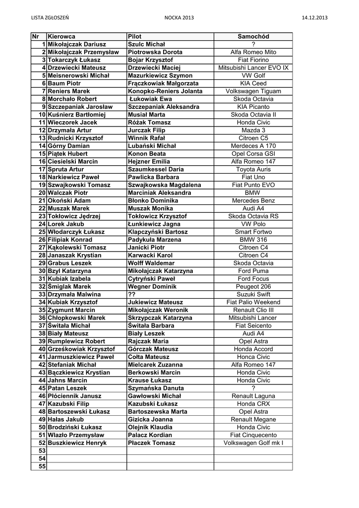LISTA ZGŁOSZEŃ Nr 1 2 3 4 5 6 7 8 9 10 11 12 13 14 15 16 17 18 19 20 21 22 23 24 25 26 27 28 29 30 31 32 33 34 35 36 37 38 39 40 41 42 43 44 45 46 47 48 49 50 51 52 53 54 55 Kierowca Mikołajczak Dariusz Mikołajczak Przemysław Tokarczyk Łukasz Drzewiecki Mateusz Meisnerowski Michał Baum Piotr Reniers Marek Morchało Robert Szczepaniak Jarosław Kuśnierz Bartłomiej Wieczorek Jacek Drzymała Artur Rudnicki Krzysztof Górny Damian Piątek Hubert Ciesielski Marcin Spruta Artur Narkiewicz Paweł Szwajkowski Tomasz Walczak Piotr Okoński Adam Muszak Marek Tokłowicz Jędrzej Lorek Jakub Włodarczyk Łukasz Filipiak Konrad Kąkolewski Tomasz Janaszak Krystian Grabus Leszek Bzyl Katarzyna Kubiak Izabela Śmiglak Marek Drzymała Malwina Kubiak Krzysztof Zygmunt Marcin Chłopkowski Marek Świtała Michał Biały Mateusz Rumplewicz Robert Grześkowiak Krzysztof Jarmuszkiewicz Paweł Stefaniak Michał Bączkiewicz Krystian Jahns Marcin Patan Leszek Płóciennik Janusz Kazubski Filip Bartoszewski Łukasz Hałas Jakub Brodziński Łukasz Wlazło Przemysław Buszkiewicz Henryk NOCKA 2013 Pilot Szulc Michał Piotrowska Dorota Bojar Krzysztof Drzewiecki Maciej Mazurkiewicz Szymon Frączkowiak Małgorzata Konopko-Reniers Jolanta Łukowiak Ewa Szczepaniak Aleksandra Musiał Marta Różak Tomasz Jurczak Filip Winnik Rafał Lubański Michał Konon Beata Hejzner Emilia Szaumkessel Daria Pawlicka Barbara Szwajkowska Magdalena Marciniak Aleksandra Błonko Dominika Muszak Monika Tokłowicz Krzysztof Łunkiewicz Jagna Klapczyński Bartosz Padykuła Marzena Janicki Piotr Karwacki Karol Wolff Waldemar Mikołajczak Katarzyna Cytryński Paweł Wegner Dominik ?? Jukiewicz Mateusz Mikołajczak Weronik Skrzypczak Katarzyna Świtała Barbara Biały Leszek Rajczak Maria Górczak Mateusz Cołta Mateusz Mielcarek Zuzanna Berkowski Marcin Krause Łukasz Szymańska Danuta Gawłowski Michał Kazubski Łukasz Bartoszewska Marta Gizicka Joanna Olejnik Klaudia Palacz Kordian Płaczek Tomasz 14.12.2013 Samochód ? Alfa Romeo Mito Fiat Fiorino Mitsubishi Lancer EVO IX VW Golf KIA Ceed Volkswagen Tiguam Skoda Octavia KIA Picanto Skoda Octavia II Honda Civic Mazda 3 Citroen C5 Merdeces A 170 Opel Corsa GSI Alfa Romeo 147 Toyota Auris Fiat Uno Fiat Punto EVO BMW Mercedes Benz Audi A4 Skoda Octavia RS VW Polo Smart Fortwo BMW 316 Citroen C4 Citroen C4 Skoda Octavia Ford Puma Ford Focus Peugeot 206 Suzuki Swift Fiat Palio Weekend Renault Clio III Mitsubishi Lancer Fiat Seicento Audi A4 Opel Astra Honda Accord Honca Civic Alfa Romeo 147 Honda Civic Honda Civic ? Renault Laguna Honda CRX Opel Astra Renault Megane Honda Civic Fiat Cinquecento Volkswagen Golf mk I