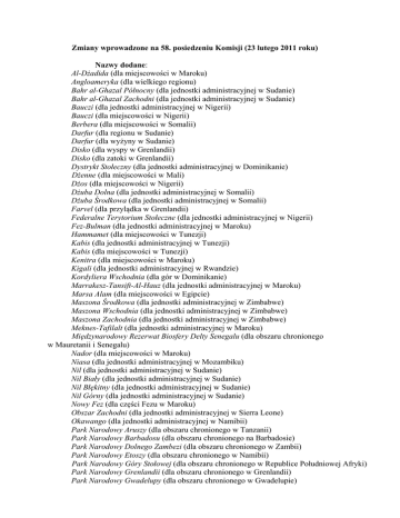 Zmiany wprowadzone na 58. posiedzeniu Komisji (23 lutego 2011 roku) Nazwy dodane: Al-Dżadida (dla miejscowości w Maroku) Angloameryka (dla wielkiego regionu) Bahr al-Ghazal Północny (dla jednostki administracyjnej w Sudanie) Bahr al-Ghazal Zachodni (dla jednostki administracyjnej w Sudanie) Bauczi (dla jednostki administracyjnej w Nigerii) Bauczi (dla miejscowości w Nigerii) Berbera (dla miejscowości w Somalii) Darfur (dla regionu w Sudanie) Darfur (dla wyżyny w Sudanie) Disko (dla wyspy w Grenlandii) Disko (dla zatoki w Grenlandii) Dystrykt Stołeczny (dla jednostki administracyjnej w Dominikanie) Dżenne (dla miejscowości w Mali) Dżos (dla miejscowości w Nigerii) Dżuba Dolna (dla jednostki administracyjnej w Somalii) Dżuba Środkowa (dla jednostki administracyjnej w Somalii) Farvel (dla przylądka w Grenlandii) Federalne Terytorium Stołeczne (dla jednostki administracyjnej w Nigerii) Fez-Bulman (dla jednostki administracyjnej w Maroku) Hammamet (dla miejscowości w Tunezji) Kabis (dla jednostki administracyjnej w Tunezji) Kabis (dla miejscowości w Tunezji) Kenitra (dla miejscowości w Maroku) Kigali (dla jednostki administracyjnej w Rwandzie) Kordyliera Wschodnia (dla gór w Dominikanie) Marrakesz-Tansift-Al-Hauz (dla jednostki administracyjnej w Maroku) Marsa Alam (dla miejscowości w Egipcie) Maszona Środkowa (dla jednostki administracyjnej w Zimbabwe) Maszona Wschodnia (dla jednostki administracyjnej w Zimbabwe) Maszona Zachodnia (dla jednostki administracyjnej w Zimbabwe) Meknes-Tafilalt (dla jednostki administracyjnej w Maroku) Międzynarodowy Rezerwat Biosfery Delty Senegalu (dla obszaru chronionego w Mauretanii i Senegalu) Nador (dla miejscowości w Maroku) Niasa (dla jednostki administracyjnej w Mozambiku) Nil (dla jednostki administracyjnej w Sudanie) Nil Biały (dla jednostki administracyjnej w Sudanie) Nil Błękitny (dla jednostki administracyjnej w Sudanie) Nil Górny (dla jednostki administracyjnej w Sudanie) Nowy Fez (dla części Fezu w Maroku) Obszar Zachodni (dla jednostki administracyjnej w Sierra Leone) Okawango (dla jednostki administracyjnej w Namibii) Park Narodowy Aruszy (dla obszaru chronionego w Tanzanii) Park Narodowy Barbadosu (dla obszaru chronionego na Barbadosie) Park Narodowy Dolnego Zambezi (dla obszaru chronionego w Zambii) Park Narodowy Etoszy (dla obszaru chronionego w Namibii) Park Narodowy Góry Stołowej (dla obszaru chronionego w Republice Południowej Afryki) Park Narodowy Grenlandii (dla obszaru chronionego w Grenlandii) Park Narodowy Gwadelupy (dla obszaru chronionego w Gwadelupie) Park Narodowy Karru (dla obszaru chronionego w Republice Południowej Afryki) Park Narodowy Kilimandżaro (dla obszaru chronionego w Tanzanii) Park Narodowy Kotliny Czadu (dla obszaru chronionego w Nigerii) Park Narodowy Małej Inagui (dla obszaru chronionego na Bahamach) Park Narodowy Obszaru Zachodniego (dla obszaru chronionego w Sierra Leone) Park Narodowy Przylądka Igielnego (dla obszaru chronionego w Republice Południowej Afryki) Park Narodowy Reunionu (dla obszaru chronionego na Reunionie) Park Narodowy Wulkanów (dla obszaru chronionego w Rwandzie) Park Wybrzeża Szkieletowego (dla obszaru chronionego w Namibii) Pemba Południowa (dla jednostki administracyjnej w Tanzanii) Pemba Północna (dla jednostki administracyjnej w Tanzanii) Prowincja Centralna (dla jednostki administracyjnej w Zambii) Prowincja Morza Czerwonego (dla jednostki administracyjnej w Sudanie) Prowincja Pasa Miedzionośnego (dla jednostki administracyjnej w Zambii) Prowincja Południowa (dla jednostki administracyjnej w Rwandzie) Prowincja Południowa (dla jednostki administracyjnej w Sierra Leone) Prowincja Południowa (dla jednostki administracyjnej w Zambii) Prowincja Północna (dla jednostki administracyjnej w Sierra Leone) Prowincja Północna (dla jednostki administracyjnej w Sudanie) Prowincja Północna (dla jednostki administracyjnej w Zambii) Prowincja Północna (dla jednostki administracyjnej w Rwandzie) Prowincja Północno-Zachodnia (dla jednostki administracyjnej w Zambii) Prowincja Północno-Zachodnia (dla jednostki administracyjnej w Republice Południowej Afryki) Prowincja Przylądkowa Północna (dla jednostki administracyjnej w Republice Południowej Afryki) Prowincja Przylądkowa Wschodnia (dla jednostki administracyjnej w Republice Południowej Afryki) Prowincja Przylądkowa Zachodnia (dla jednostki administracyjnej w Republice Południowej Afryki) Prowincja Wschodnia (dla jednostki administracyjnej w Sierra Leone) Prowincja Wschodnia (dla jednostki administracyjnej w Rwandzie) Prowincja Wschodnia (dla jednostki administracyjnej w Zambii) Prowincja Zachodnia (dla jednostki administracyjnej w Rwandzie) Prowincja Zachodnia (dla jednostki administracyjnej w Zambii) Puntland (dla obszaru separatystycznego w Somalii) Region Wschodni (dla jednostki administracyjnej w Maroku) Reunion (dla wyspy stanowiącej terytorium Reunion) Rio de Oro (dla jednostki administracyjnej w Saharze Zachodniej) Safakis (dla jednostki administracyjnej w Tunezji) Safakis (dla miejscowości w Tunezji) Safi (dla miejscowości w Maroku) Saguia el Hamra (dla regionu w Saharze Zachodniej) Santo Domingo (dla miejscowości w Dominikanie) Stary Fez (dla części Fezu w Maroku) Susa (dla jednostki administracyjnej w Tunezji) Susa (dla miejscowości w Tunezji) Tanger-Tetuan (dla jednostki administracyjnej w Maroku) Thugga (dla ruin w Tunezji) Tubkal (dla szczytu w Maroku) Volubilis (dla ruin w Maroku) Wadżda (dla miejscowości w Maroku) Wielka Casablanca (dla jednostki administracyjnej w Maroku) Wolne Państwo (dla jednostki administracyjnej w Republice Południowej Afryki) Wybrzeże Kości Słoniowej (dla wybrzeża w Wybrzeżu Kości Słoniowej) Zanzibar (dla wyspy w Tanzanii) Zanzibar Południowy (dla jednostki administracyjnej w Tanzanii) Zanzibar Północny (dla jednostki administracyjnej w Tanzanii) Zanzibar Zachodni (dla jednostki administracyjnej w Tanzanii) Nazwy zmienione: Damasz