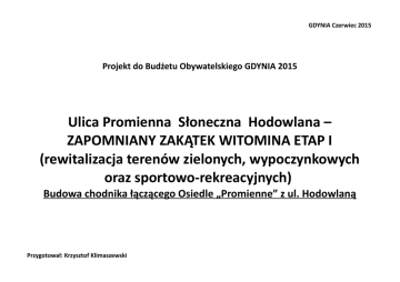 GDYNIA Czerwiec 2015 Projekt do Budżetu Obywatelskiego GDYNIA 2015 Ulica Promienna Słoneczna Hodowlana – ZAPOMNIANY ZAKĄTEK WITOMINA ETAP I (rewitalizacja terenów zielonych, wypoczynkowych oraz sportowo-rekreacyjnych) Budowa chodnika łączącego Osiedle „Promienne” z ul. Hodowlaną Przygotował: Krzysztof Klimaszewski Wstęp Szanowni Państwo Ta informacja jest bardzo ważna: Projekt w swojej złożoności skierowany jest do WSZYSTKICH mieszkańców ulic Promiennej, Słonecznej i Hodowlanej jak i całej zachodniej części Witomina-Leśniczówki. Zaczynamy od chodnika by w przyszłości wykonać pozostałe elementy projektu, które mają za zadanie służyć WSZYSTKIM mieszkańcom naszego osiedla niezależnie od tego do jakiej Wspólnoty Mieszkaniowej należą. Okolice ulic Promiennej, Słonecznej i Hodowlanej to kameralne miejsce na mapie Gdyni. Ma wpływ na to przede wszystkim położenie tej części dzielnicy Witomina w pobliżu Trójmiejskiego Parku Krajobrazowego oraz wśród terenów zielonych zachowanych podczas powstawania zabudowy dzielnicy. Niestety od lat można odnieść wrażenie, że to co było najpiękniejsze dla naszych ulic zostało zaniedbane. Miejsce gdzie lata temu mieszkańcy mogli spacerować, wypoczywać, przyjść na plac zabaw z dziećmi, skorzystać z obiektów sportowych, spotkać się z sąsiadami, itd., straciło w zasadzie tą funkcję. Jest to wynik wieloletnich zaniechań wynikających niewątpliwie z ważniejszych dla dzielnicy zadań i związanych z tym wydatków. Nasza okolica jest obecnie nieestetyczna i niefunkcjonalna, a jej potencjał, który może mieć wpływ na poprawę jakości życia mieszkańców, nie jest wykorzystany. Czas na zmiany ! Niniejszy projekt jest gotowym opracowaniem uzupełniającym i kończącym zaplanowane przez Urząd Miasta prace w naszej okolicy. Plany inwestycji Urzędu Miasta związane są z kapitalnym remontem ulicy Hodowlanej oraz pozostałym odcinkiem ulicy Słonecznej pomiędzy ulicami Hodowlaną a Promienną. Nam pozostaje postawienie przysłowiowej kropki nad „i”, czyli rewitalizacja terenów zielonych pomiędzy blokami a Trójmiejskim Parkiem Krajobrazowym. W BO 2015 dzielnica Witomino dysponuje kwotą 111 714zł. To stanowczo za mało na realizację projektu w całości. Z racji tego faktu projekt został podzielony na dwa etapy tj. ETAP I i jego część zgłaszana do realizacji na rok 2015 oraz ETAP II, który będzie zgłoszony do realizacji w kolejnych edycjach BO. W związku z powyższym chcemy rozpocząć jego realizację od elementu najważniejszego dla Osiedla „Promienna”, tj. od chodnika łączącego osiedle z ulicą Hodowlaną. To połączenie jest najkrótszą i najłatwiejszą drogą (pomijającą strome podejście ul. Promienną), do najbliższego sklepu i przystanku jak i do centrum Witomina. Obecnie mieszkańcy osiedla korzystają z tego przejścia, które jest nieutwardzone i nie posiada schodów. W porach deszczowych i zimowych przejście jest w zasadzie niemożliwe a w pozostałych przypadkach niebezpieczne przez brak schodów, co ma ogromne znaczenie szczególnie dla osób starszych i dzieci przemierzających ten odcinek w drodze do szkoły. Chodnik ten jest istotną częścią Etapu I, ponieważ oprócz powyższej funkcji będzie stanowił dojście do boiska i siłowni zewnętrznej dla WSZYSTKICH mieszkańców z najbliższej okolicy i nie tylko. Liczymy na Państwa pomoc i wsparcie w realizacji naszego WSPÓLNEGO projektu. Jesteśmy otwarci na sugestie i uwagi ale przede wszystkim liczymy na Państwa głosy w październikowym głosowaniu. Porozmawiajcie o projekcie ze swoimi rodzinami, bliskimi, sąsiadami również z osobami spoza naszej dzielnicy i przekonajcie je do oddania głosu na naszą propozycję. Z wyrazami szacunku Autor projektu Krzysztof Klimaszewski Cel Nadrzędnym celem projektu jest estetyzacja wskazanego terenu z przywróceniem pierwotnych funkcji wypoczynkowych oraz sportoworekreacyjnych. Podrzędnym celem równie istotnym jest zapewnienie bezpieczeństwa mieszkańcom poprzez likwidację widocznych na wskazanym terenie zachowań patologicznych. Szczegółowy wykaz celów z podziałem na kategorie: 1. Ład przestrzenny w zakresie estetyzacji otoczenia • • • uporządkowanie terenów zielonych z uwzględnieniem wskazań Ogrodnika Miejskiego – wycinka krzaków i drzew tzw. samosiejek, odświeżenie trawników i założenie nowych, zasadzenie nowych roślin wg wskazań Ogrodnika ławki, śmietniki, podajniki na odchody zwierząt, inne elementy małej architektury ogrodzenie zabezpieczające przed dziką zwierzyną wzdłuż granicy Trójmiejskiego Parku Krajobrazowego 2. Rekreacja • • • siłownia zewnętrzna połączona z mini placem zabaw (miejsce: zakończenie ul. Promiennej nad boiskiem ETAP I) plac zabaw odnowa i uzbrojenie boiska w dodatkowe elementy – siatki na bramki, siatki poza boiskiem „łapiące”, kosze do koszykówki, słupki na siatkę do siatkówki i tenisa, trybuny lub ławki, oświetlenie, malowanie linii z uwzględnieniem możliwych dyscyplin 3. Inwestycje i remonty w przestrzeni publicznej (w tym zapewnienie bezpieczeństwa mieszkańcom) • • • • chodniki i ścieżki rowerowe nowe schody i remonty istniejących wraz z poręczami i podjazdami dla wózków dziecięcych oświetlenie – nowe latarnie wzdłuż nowych ciągów pieszo-rowerowych, wymiana istniejących starych latarni monitoring w wybranych newralgicznych punktach Cel na BO 2015 rozpoczynający inwestycję (część Etapu I) Cel jest ściśle związany z kategorią „Inwestycje i remonty w przestrzeni publicznej” • • budowa chodnika z kostki wraz z obrzeżami, szerokość 2m x długość 125mb budowa schodów wraz z poręczami i podjazdami dla wózków dziecięcych, schody złożone z 3 odcinków o łącznej długości 12mb Lokalizacja Poniższe zdjęcie przedstawia przebieg inwestycji drogowych w Zachodniej części Witomina. Kolorem zielonym oznaczon