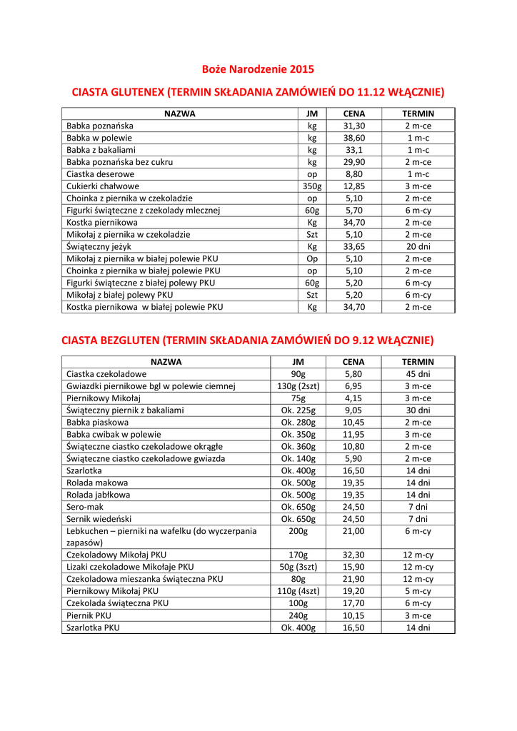 Boże Narodzenie 2015 CIASTA GLUTENEX (TERMIN SKŁADANIA ZAMÓWIEŃ DO 11.12 WŁĄCZNIE) NAZWA Babka poznańska Babka w polewie Babka z bakaliami Babka poznańska bez cukru Ciastka deserowe Cukierki chałwowe Choinka z piernika w czekoladzie Figurki świąteczne z czekolady mlecznej Kostka piernikowa Mikołaj z piernika w czekoladzie Świąteczny jeżyk Mikołaj z piernika w białej polewie PKU Choinka z piernika w białej polewie PKU Figurki świąteczne z białej polewy PKU Mikołaj z białej polewy PKU Kostka piernikowa w białej polewie PKU JM kg kg kg kg op 350g op 60g Kg Szt Kg Op op 60g Szt Kg CENA 31,30 38,60 33,1 29,90 8,80 12,85 5,10 5,70 34,70 5,10 33,65 5,10 5,10 5,20 5,20 34,70 TERMIN 2 m-ce 1 m-c 1 m-c 2 m-ce 1 m-c 3 m-ce 2 m-ce 6 m-cy 2 m-ce 2 m-ce 20 dni 2 m-ce 2 m-ce 6 m-cy 6 m-cy 2 m-ce CIASTA BEZGLUTEN (TERMIN SKŁADANIA ZAMÓWIEŃ DO 9.12 WŁĄCZNIE) NAZWA Ciastka czekoladowe Gwiazdki piernikowe bgl w polewie ciemnej Piernikowy Mikołaj Świąteczny piernik z bakaliami Babka piaskowa Babka cwibak w polewie Świąteczne ciastko czekoladowe okrągłe Świąteczne ciastko czekoladowe gwiazda Szarlotka Rolada makowa Rolada jabłkowa Sero-mak Sernik wiedeński Lebkuchen – pierniki na wafelku (do wyczerpania zapasów) Czekoladowy Mikołaj PKU Lizaki czekoladowe Mikołaje PKU Czekoladowa mieszanka świąteczna PKU Piernikowy Mikołaj PKU Czekolada świąteczna PKU Piernik PKU Szarlotka PKU JM 90g 130g (2szt) 75g Ok. 225g Ok. 280g Ok. 350g Ok. 360g Ok. 140g Ok. 400g Ok. 500g Ok. 500g Ok. 650g Ok. 650g 200g 170g 50g (3szt) 80g 110g (4szt) 100g 240g Ok. 400g CENA 5,80 6,95 4,15 9,05 10,45 11,95 10,80 5,90 16,50 19,35 19,35 24,50 24,50 21,00 32,30 15,90 21,90 19,20 17,70 10,15 16,50 TERMIN 45 dni 3 m-ce 3 m-ce 30 dni 2 m-ce 3 m-ce 2 m-ce 2 m-ce 14 dni 14 dni 14 dni 7 dni 7 dni 6 m-cy 12 m-cy 12 m-cy 12 m-cy 5 m-cy 6 m-cy 3 m-ce 14 dni