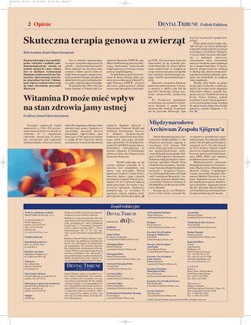 DTP0105_02-03-1 22.02.2005 13:14 Uhr Seite 1 DENTAL TRIBUNE 2 Opinie Skuteczna terapia genowa u zwierząt Robin Goodman, Dental Tribune International Pacjenci chorujący na zespół Sjögrena (choroba o podłożu autoimmunologicznym) cierpią na suchość spojówek i jamy ustnej. Jest to skutkiem wzmożonego działania zwiększonej liczby leukocytów, skierowanego przeciwko gruczołom łzowym i śliniankom. Oprócz suchości obserwuje się także obrzmienie gruczołów ślinowych. Jest to choroba ogólnoustrojowa, a przy tym jedna z najczęstszych chorób autoimmunologicznych. Może objawiać się znacznym zmęczeniem i bólem stawów. Inne narządy, które mogą być zaatakowane, to naczynia krwionośne, ośrodkowy układ nerwowy, przewód pokarmowy, nerki, wątroba, płuca i trzustka. W październiku 2003 roku National Institute of Dental and Cra- niofacial Research (NIDCR) opublikował informację prasową dotyczącą skutecznego zastosowania terapii genowej u zwierząt cierpiących na zespół Sjögrena. Zespół badaczy pod kierownictwem dr Bruca Bauma, który jest także przewodniczącym Sekcji Terapii Genowej NIDCR, stworzył tak zwany „pakiet genowy”. Pakiet zawiera gen dla ludzkiej interleuki- Witamina D może mieć wpływ na stan zdrowia jamy ustnej ny 10 (IL-10) oraz wirusa, który ma wprowadzić go do komórki gruczołu ślinowego. IL-10 jest dobrze znana naukowcom ze względu na swoje właściwości przeciwzapalne oraz zdolność powstrzymania postępu chorób autoimmunologicznych. Myszom z zespołem Sjögrena podawano pakiet genowy w postaci iniekcji w okolice uda lub do gruczołu ślinowego. Grupa kontrolna otrzymywała nieaktywny gen. Po dwudziestu tygodniach stwierdzono, że czynność wydzielnicza ślinianek w grupie, która otrzymywała iniekcję bezpośrednio do gruczołu ślinowego, była Polish Edition trzy razy wyższa niż w grupie kontrolnej. Pełna skuteczność terapii zależała od tego, czy myszy podawano materiał w iniekcji przed, czy już po rozwinięciu dysfunkcji ślinianek. U myszy, które otrzymywały iniekcję z pakietem genowym, stwierdzano także znamiennie mniejsze nasilenie stanu zapalnego niż w grupie kontrolnej. U myszy, którym przeprowadzono iniekcję w okolicę uda, obserwowano pewną poprawę funkcji ślinianek, natomiast nie dochodziło do redukcji stanu zapalnego. Wyniki tych badań są godne uwagi, gdyż wykazały, że takie podejście do terapii może złagodzić dokuczliwe objawy zespołu Sjögrena u myszy. Nadal konieczne są liczne dalsze badania, jednak uzyskane wyniki wskazują naukowcom potencjalną drogę wiodącą do opracowania skutecznej terapii genowej zespołu Sjögrena u ludzi. DT Eva Bőrner, Dental Tribune International Przegląd rządowych badań naukowych w USA (US government research service) wykazał, że witamina D w organizmie człowieka, dostarczana w diecie lub wytwarzana pod wpływem nasłoneczniania, może być istotna także dla osiągnięcia dobrego stanu zdrowia jamy ustnej. Naukowcy z Agriculture Research Service przeglądali odpowiednie dane dotyczące 11202 mężczyzn i kobiet w wieku 20 lub więcej lat, którzy uczestniczyli w trzeciej Narodowej Ankiecie Badania Zdrowia i Odżywiania (National Health and Nutrition Examination Survey) w Stanach Zjednoczonych. Naukowcy analizowali dane dotyczące utraty przyczepu przyzębnego i poziomów 25-hydroksywitaminy D3 (25OHD3-przyp. tłum.), biomarkera wskazującego na stężenia witaminy D pochodzące zarówno z diety, jak i ekspozycji na promienie słoneczne. Wyniki pokazują, że im wyższe stężenia witaminy D w surowicy krwi ochotników, tym lepszy stan przyzębia. Wśród mężczyzn i kobiet w wieku 50 lat i starszych, ludzie z grup o niskich poziomach witaminy D mieli przeciętnie o 25 do 27 procent większą utratę przyczepu, niż osoby z najwyższym stężeniem. Naukowcy podejrzewają, że witamina D ogranicza reakcję zapalną, która prowadzi do choroby przyzębia. DT Międzynarodowe Archiwum Zespołu Sjőgren’a Szkole Stomatologii przy Uniwersytecie Kalifornijskim w San Francisco przyznano nagrodę w wysokości 11,9 miliona US$ przez okres pięciu lat za stworzenie międzynarodowego archiwum dla badań nad zespołem Sjőgren’a (SS-Sjőgren’s Syndrome). Fundusze będą pochodzić z Narodowego Instytutu Chorób Oczu (National Eye Institute), Narodowego Instytutu Badań Stomatologicznych i Sczękowo-Twarzowych (National Institute of Dental and Craniofacial Research) i Narodowego Instytutu Badań Zdrowia Kobiet (National Institute of Health Office for Research on Women’s Health). Szacuje się, że 1 na 100 dorosłych w USA cierpi z powodu SS, co stanowi w przybliżeniu cztery miliony ludzi. Troy Daniels, DDS, jeden z dwóch głównych badaczy zauważył, że 9 z 10 osób chorych na SS to kobiety. Daniels współpracował z drugim głównym naukowcem, profesorem John Greenspan (DDS, PhD), nad wieloma projektami przez wiele lat. Międzynarodowe archiwum obejmuje uczestnictwo Uniwersytetu w Buenos Aires, Peking Union Medical College, Copenhagen County University Hospital i Kanazawa Medical University w Japonii. Zadaniem ich jest stworzenie standaryzowanych, objektywnych kryteriów diagnostycznych dla SS, zbieranie danych klinicznych i próbek oraz stworzenie banku danych klinicznych i tkanek. Zespól redakcyjny Wydawca polskiego wydania: Dental Tribune Polska Sp. z o.o. Al. Jerozolimskie 44, 00-024 Warszawa telefon: (22) 433 63 63 faks: (22) 433 63 64 [email protected] www.dental-tribune.com Zespół redakcyjny Konsultacja naukowa: Prof. zw. dr hab. med. Leszek Kryst Redaktor naczelna: Magdalena Wojtkiewicz, [email protected] Tłumacze: Ewa Aleksińska Marcin Aleksiński Ewa Ganowicz Marketing i reklama: Grzegorz Rosiak, [email protected] telefon: (22) 433 63 62 Informacje w sprawie prenumeraty: Dental Tribune Polska Sp. z o.o., E-mail: [email protected] telefon: (22) 433 63 62 Nakład: 10 000 egz. Wydawca i redakcja nie ponoszą odpowiedzialnoś