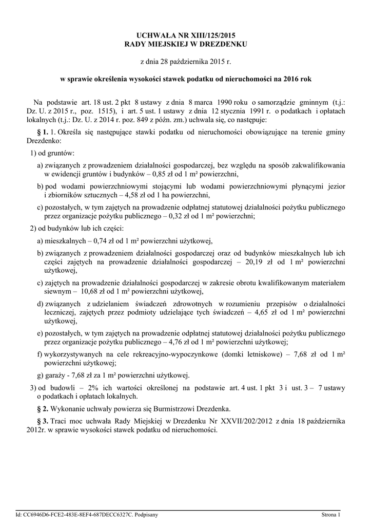 UCHWAŁA NR XIII/125/2015 RADY MIEJSKIEJ W DREZDENKU z dnia 28 października 2015 r. w sprawie określenia wysokości stawek podatku od nieruchomości na 2016 rok Na podstawie art. 18 ust. 2 pkt 8 ustawy z dnia 8 marca 1990 roku o samorządzie gminnym (t.j.: Dz. U. z 2015 r., poz. 1515), i art. 5 ust. 1 ustawy z dnia 12 stycznia 1991 r. o podatkach i opłatach lokalnych (t.j.: Dz. U. z 2014 r. poz. 849 z późn. zm.) uchwala się, co następuje: § 1. 1. Określa się następujące stawki podatku od nieruchomości obowiązujące na terenie gminy Drezdenko: 1) od gruntów: a) związanych z prowadzeniem działalności gospodarczej, bez względu na sposób zakwalifikowania w ewidencji gruntów i budynków – 0,85 zł od 1 m² powierzchni, b) pod wodami powierzchniowymi stojącymi lub wodami powierzchniowymi płynącymi jezior i zbiorników sztucznych – 4,58 zł od 1 ha powierzchni, c) pozostałych, w tym zajętych na prowadzenie odpłatnej statutowej działalności pożytku publicznego przez organizacje pożytku publicznego – 0,32 zł od 1 m² powierzchni; 2) od budynków lub ich części: a) mieszkalnych – 0,74 zł od 1 m² powierzchni użytkowej, b) związanych z prowadzeniem działalności gospodarczej oraz od budynków mieszkalnych lub ich części zajętych na prowadzenie działalności gospodarczej – 20,19 zł od 1 m² powierzchni użytkowej, c) zajętych na prowadzenie działalności gospodarczej w zakresie obrotu kwalifikowanym materiałem siewnym – 10,68 zł od 1 m² powierzchni użytkowej, d) związanych z udzielaniem świadczeń zdrowotnych w rozumieniu przepisów o działalności leczniczej, zajętych przez podmioty udzielające tych świadczeń – 4,65 zł od 1 m² powierzchni użytkowej, e) pozostałych, w tym zajętych na prowadzenie odpłatnej statutowej działalności pożytku publicznego przez organizacje pożytku publicznego – 4,76 zł od 1 m² powierzchni użytkowej; f) wykorzystywanych na cele rekreacyjno-wypoczynkowe (domki letniskowe) – 7,68 zł od 1 m² powierzchni użytkowej; g) garaży - 7,68 zł za 1 m² powierzchni użytkowej. 3) od budowli – 2% ich wartości określonej na podstawie art. 4 ust. 1 pkt 3 i ust. 3 – 7 ustawy o podatkach i opłatach lokalnych. § 2. Wykonanie uchwały powierza się Burmistrzowi Drezdenka. § 3. Traci moc uchwała Rady Miejskiej w Drezdenku Nr XXVII/202/2012 z dnia 18 października 2012r. w sprawie wysokości stawek podatku od nieruchomości. Id: CC6946D6-FCE2-483E-8EF4-687DECC6327C. Podpisany Strona 1 § 4. Uchwała wchodzi w życie po upływie 14 dni od dnia ogłoszenia w Dzienniku Urzędowym Województwa Lubuskiego i obowiązuje od dnia 1 stycznia 2016 roku. Przewodniczący Rady Miejskiej Adam Kołwzan Id: CC6946D6-FCE2-483E-8EF4-687DECC6327C. Podpisany Strona 2 UZASADNIENIE Uchylenie uchwały Nr XXVII/202/2012 Rady Miejskiej w Drezdenku z dnia 18 października 2012 r. w sprawie wysokości stawek podatku od nieruchomości, spowodowane jest zmianą stawek podatku od nieruchomości. Zmiana ta ma swoje umocowanie w art. 5 ust. 1 ustawy z dnia 12 stycznia 1991 roku o podatkach i opłatach lokalnych (tekst jednolity Dz.U. z 2014 roku, poz. 849 ze zm.), który przewiduje, iż rada gminy, w drodze uchwały, określa wysokość stawek podatku od nieruchomości, z tym, że stawki nie mogą przekroczyć rocznie górnych granic stawek kwotowych obwieszczanych przez ministra właściwego do spraw finansów publicznych. Górne granice stawek zostały podane w Obwieszczeniu Ministra Finansów z dnia 05 sierpnia 2015 r. w sprawie górnych granic stawek kwotowych podatków i opłat lokalnych w 2016 roku (M. P. z 2015 r., poz. 735). Id: CC6946D6-FCE2-483E-8EF4-687DECC6327C. Podpisany Strona 1