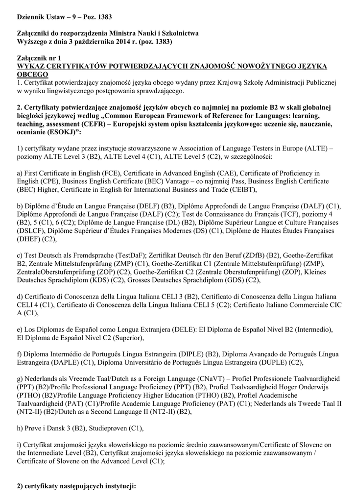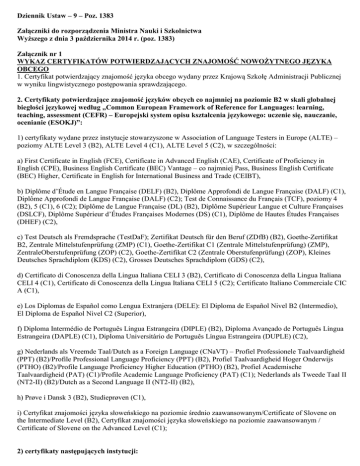Dziennik Ustaw – 9 – Poz. 1383 Załączniki do rozporządzenia Ministra Nauki i Szkolnictwa Wyższego z dnia 3 października 2014 r. (poz. 1383) Załącznik nr 1 WYKAZ CERTYFIKATÓW POTWIERDZAJĄCYCH ZNAJOMOŚĆ NOWOŻYTNEGO JĘZYKA OBCEGO 1. Certyfikat potwierdzający znajomość języka obcego wydany przez Krajową Szkołę Administracji Publicznej w wyniku lingwistycznego postępowania sprawdzającego. 2. Certyfikaty potwierdzające znajomość języków obcych co najmniej na poziomie B2 w skali globalnej biegłości językowej według „Common European Framework of Reference for Languages: learning, teaching, assessment (CEFR) – Europejski system opisu kształcenia językowego: uczenie się, nauczanie, ocenianie (ESOKJ)”: 1) certyfikaty wydane przez instytucje stowarzyszone w Association of Language Testers in Europe (ALTE) – poziomy ALTE Level 3 (B2), ALTE Level 4 (C1), ALTE Level 5 (C2), w szczególności: a) First Certificate in English (FCE), Certificate in Advanced English (CAE), Certificate of Proficiency in English (CPE), Business English Certificate (BEC) Vantage – co najmniej Pass, Business English Certificate (BEC) Higher, Certificate in English for International Business and Trade (CEIBT), b) Diplôme d’Étude en Langue Française (DELF) (B2), Diplôme Approfondi de Langue Française (DALF) (C1), Diplôme Approfondi de Langue Française (DALF) (C2); Test de Connaissance du Français (TCF), poziomy 4 (B2), 5 (C1), 6 (C2); Diplôme de Langue Française (DL) (B2), Diplôme Supérieur Langue et Culture Françaises (DSLCF), Diplôme Supérieur d’Études Françaises Modernes (DS) (C1), Diplôme de Hautes Études Françaises (DHEF) (C2), c) Test Deutsch als Fremdsprache (TestDaF); Zertifikat Deutsch für den Beruf (ZDfB) (B2), Goethe-Zertifikat B2, Zentrale Mittelstufenprüfung (ZMP) (C1), Goethe-Zertifikat C1 (Zentrale Mittelstufenprüfung) (ZMP), ZentraleOberstufenprüfung (ZOP) (C2), Goethe-Zertifikat C2 (Zentrale Oberstufenprüfung) (ZOP), Kleines Deutsches Sprachdiplom (KDS) (C2), Grosses Deutsches Sprachdiplom (GDS) (C2), d) Certificato di Conoscenza della Lingua Italiana CELI 3 (B2), Certificato di Conoscenza della Lingua Italiana CELI 4 (C1), Certificato di Conoscenza della Lingua Italiana CELI 5 (C2); Certificato Italiano Commerciale CIC A (C1), e) Los Diplomas de Español como Lengua Extranjera (DELE): El Diploma de Español Nivel B2 (Intermedio), El Diploma de Español Nivel C2 (Superior), f) Diploma Intermédio de Português Língua Estrangeira (DIPLE) (B2), Diploma Avançado de Português Língua Estrangeira (DAPLE) (C1), Diploma Universitário de Português Língua Estrangeira (DUPLE) (C2), g) Nederlands als Vreemde Taal/Dutch as a Foreign Language (CNaVT) – Profiel Professionele Taalvaardigheid (PPT) (B2)/Profile Professional Language Proficiency (PPT) (B2), Profiel Taalvaardigheid Hoger Onderwijs (PTHO) (B2)/Profile Language Proficiency Higher Education (PTHO) (B2), Profiel Academische Taalvaardigheid (PAT) (C1)/Profile Academic Language Proficiency (PAT) (C1); Nederlands als Tweede Taal II (NT2-II) (B2)/Dutch as a Second Language II (NT2-II) (B2), h) Prøve i Dansk 3 (B2), Studieprøven (C1), i) Certyfikat znajomości języka słoweńskiego na poziomie średnio zaawansowanym/Certificate of Slovene on the Intermediate Level (B2), Certyfikat znajomości języka słoweńskiego na poziomie zaawansowanym / Certificate of Slovene on the Advanced Level (C1); 2) certyfikaty następujących instytucji: a) Educational Testing Service (ETS) – w szczególności certyfikaty: Test of English as a Foreign Language (TOEFL) – co najmniej 87 pkt w wersji Internet-Based Test (iBT); Test of English as a Foreign Language (TOEFL) – co najmniej 180 pkt w wersji Computer-Based Test (CBT) uzupełnione o co najmniej 50 pkt z Test of Spoken English (TSE); Test of English as a Foreign Language (TOEFL) – co najmniej 510 pkt w wersji Paper- Based Test (PBT) uzupełnione o co najmniej 3,5 pkt z Test of Written English (TWE) oraz o co najmniej 50 pkt z Test of Spoken English (TSE); Test of English for International Communication (TOEIC) – co najmniej 700 pkt; Test de Français International (TFI) – co najmniej 605 pkt, b) European Consortium for the Certificate of Attainment in Modern Languages (ECL), Dziennik Ustaw – 10 – Poz. 1383 c) City & Guilds, City & Guilds Pitman Qualifications, Pitman Qualifications Institute – w szczególności certyfikaty: English for Speakers of Other Languages (ESOL) – First Class Pass at Intermediate Level, Higher Intermediate Level, Advanced Level; International English for Speakers of Other Languages (IESOL) – poziom „Communicator”, poziom „Expert”, poziom „Mastery”; City & Guilds Level 1 Certificate in ESOL International (reading, writing and listening) Communicator (B2) 500/1765/2; City & Guilds Level 2 Certificate in ESOL International (reading, writing and listening) Expert (C1) 500/1766/4; City & Guilds Level 3 Certificate in ESOL International (reading, writing and listening) Mastery (C2) 500/1767/6; Spoken English Test (SET) for Business – Stage B poziom „Communicator”, Stage C poziom „Expert”, Stage C poziom „Mastery”; English for Business Communications (EBC) – Level 2, Level 3; English for Office Skills (EOS) – Level 2, d) Edexcel, Pearson Language Tests, Pearson Language Assessments – w szczególności certyfikaty: London Tests of English, Level 3 (Edexcel Level 1 Certificate in ESOL International); London Tests of English, Level 4 (Edexcel Level 2 Certificate in ESOL International); London Tests of English, Level 5 (Edexcel Level 3 Certificate in ESOL International), e) Education Development International (EDI), London Chamber of Commerce and Industry Examinations Board – w szczególności certyfikaty: London Chamber of Commerce and Industry Examinations (LCCI) – English for Business Level 2, English for Business Level 3, English for Business Level 4; London Chamber of Comme