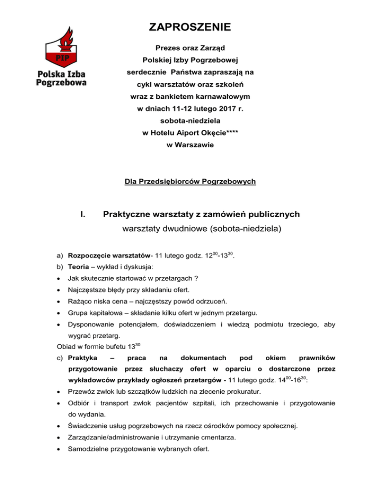 ZAPROSZENIE Prezes oraz Zarząd Polskiej Izby Pogrzebowej serdecznie Państwa zapraszają na cykl warsztatów oraz szkoleń wraz z bankietem karnawałowym w dniach 11-12 lutego 2017 r. sobota-niedziela w Hotelu Aiport Okęcie**** w Warszawie Dla Przedsiębiorców Pogrzebowych I. Praktyczne warsztaty z zamówień publicznych warsztaty dwudniowe (sobota-niedziela) a) Rozpoczęcie warsztatów- 11 lutego godz. 1200-1330. b) Teoria – wykład i dyskusja: Jak skutecznie startować w przetargach ? Najczęstsze błędy przy składaniu ofert. Rażąco niska cena – najczęstszy powód odrzuceń. Grupa kapitałowa – składanie kilku ofert w jednym przetargu. Dysponowanie potencjałem, doświadczeniem i wiedzą podmiotu trzeciego, aby wygrać przetarg. Obiad w formie bufetu 1330 c) Praktyka – praca na dokumentach pod okiem prawników przygotowanie przez słuchaczy ofert w oparciu o dostarczone przez wykładowców przykłady ogłoszeń przetargów - 11 lutego godz. 1400-1630: Przewóz zwłok lub szczątków ludzkich na zlecenie prokuratur. Odbiór i transport zwłok pacjentów szpitali, ich przechowanie i przygotowanie do wydania. Świadczenie usług pogrzebowych na rzecz ośrodków pomocy społecznej. Zarządzanie/administrowanie i utrzymanie cmentarza. Samodzielne przygotowanie wybranych ofert. d) Wspólne sprawdzenie i omówienie przygotowanych ofert – 12 lutego 1000-1300 Omówienie najczęstszych błędów. Wskazanie możliwości uzupełnienia lub poprawy błędów w już złożonych ofertach. Podsumowanie. Prowadzenie: adw. Krzysztof Sawicki – specjalista ds. zamówień publicznych z zespołem. Czas szkolenia: 11 lutego 2017 r. godz. 1200-1630, 12 lutego 2017 r. godz. 1000-1300 Ilość osób ograniczona do 20 – decyduje kolejność zgłoszeń !!! II. „Zakład Ubezpieczeń Społecznych miliony na inwestycje dla przedsiębiorców pogrzebowych” Dofinansowanie – kto może uzyskać ? Dofinansowanie – na jaki cel można uzyskać ? Warunki uzyskania dofinansowania. Czy wymagany jest wkład własny ? Wysokość dofinansowania. Procedura pozyskania dofinansowania z ZUS-u. Składanie wniosków do ZUS-u. Prowadzenie: Kancelaria ds. pozyskiwania funduszy z ZUS. Czas szkolenia: 11 lutego 2017 r. godz. 1700 – 1930 11 lutego godz. 2100 – Bankiet Karnawałowy z bogatym menu i muzyką oraz open barem 4h Szkolenia Krajowego Rejestru Zarządców i Administratorów Cmentarzy I. Jak zaprojektować cmentarz na pochówek kremacyjny ? Rozwiązania przestrzenne. Racjonalne zagospodarowanie cmentarza w związku z pochówkami kremacyjnymi. Pola urnowe. Kolumbaria. Trendy w architekturze cmentarnej – rozwiązania dla pochówków kremacyjnych. Inspiracje. Prowadzenie: dr Anna Długozima, Wydział Ogrodnictwa, Biotechnologii i Architektury Krajobrazu, Katedra Sztuki Krajobrazu, Szkoła Główna Gospodarstwa Wiejskiego Czas szkolenia: 11 lutego 2017 r. godz. 1400 – 1630 II. „Zakład Ubezpieczeń Społecznych miliony na inwestycje dla zarządców cmentarzy” Dofinansowanie – kto może uzyskać ? Dofinansowanie – na jaki cel można uzyskać ? Warunki uzyskania dofinansowania. Czy wymagany jest wkład własny ? Wysokość dofinansowania. Procedura pozyskania dofinansowania z ZUS-u. Składanie wniosków do ZUS-u. Prowadzenie: Kancelaria ds. pozyskiwania funduszy z ZUS. Czas szkolenia: 11 lutego 2017 r. godz. 1700 – 1930 III. „Prawo do grobu – problemy i pułapki”. Umowa źródłem prawa do grobu. Ustanowienie prawa do grobu. Dwoistość prawa do grobu. Wpływ rodzaju grobu na prawo do niego. Konsekwencje pochowania w grobie urny z prochami. Dysponent grobu – prawa i obowiązki. Opłata przedłużająca. Egzekwowanie opłat za groby. Użycie grobu do ponownego pochowania (likwidacja) – problematyka szczątków ludzkich. Pomnik – co z nim zrobić przy likwidacji grobu ? Ekshumacja Prowadzenie: Dariusz Dutkiewicz, Prawnik i Dyrektor Biura Polskiej Izby Pogrzebowej. Czas szkolenia: 12 lutego 2017 r. godz. 1000 - 1300 11 lutego godz. 2100 – Bankiet Karnawałowy z bogatym menu i muzyką oraz open barem 4h data i miejsce: Airport Hotel Okęcie**** w dniu 11-12 lutego 2017 r. adres: ul. 17 Stycznia 24, 02-146 Warszawa, Koszt pakietu uwidoczniony w druku zamówienia Wszyscy uczestnicy otrzymają certyfikaty ukończenia szkoleń. Podbijamy delegacje. Prosimy o zgłaszanie się najpóźniej do 3 lutego 2017 r.