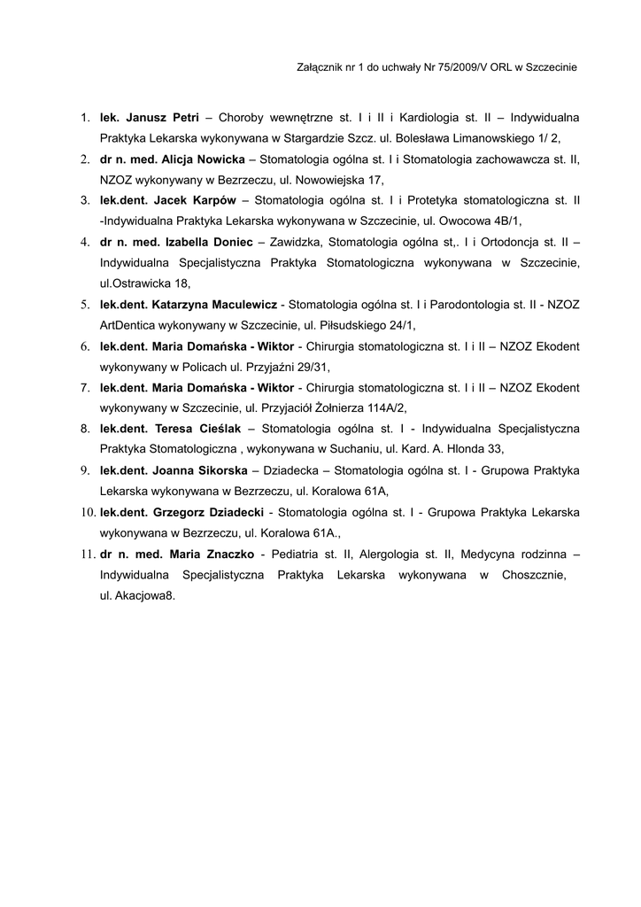 Załącznik nr 1 do uchwały Nr 75/2009/V ORL w Szczecinie 1. lek. Janusz Petri – Choroby wewnętrzne st. I i II i Kardiologia st. II – Indywidualna Praktyka Lekarska wykonywana w Stargardzie Szcz. ul. Bolesława Limanowskiego 1/ 2, 2. dr n. med. Alicja Nowicka – Stomatologia ogólna st. I i Stomatologia zachowawcza st. II, NZOZ wykonywany w Bezrzeczu, ul. Nowowiejska 17, 3. lek.dent. Jacek Karpów – Stomatologia ogólna st. I i Protetyka stomatologiczna st. II -Indywidualna Praktyka Lekarska wykonywana w Szczecinie, ul. Owocowa 4B/1, 4. dr n. med. Izabella Doniec – Zawidzka, Stomatologia ogólna st,. I i Ortodoncja st. II – Indywidualna Specjalistyczna Praktyka Stomatologiczna wykonywana w Szczecinie, ul.Ostrawicka 18, 5. lek.dent. Katarzyna Maculewicz - Stomatologia ogólna st. I i Parodontologia st. II - NZOZ ArtDentica wykonywany w Szczecinie, ul. Piłsudskiego 24/1, 6. lek.dent. Maria Domańska - Wiktor - Chirurgia stomatologiczna st. I i II – NZOZ Ekodent wykonywany w Policach ul. Przyjaźni 29/31, 7. lek.dent. Maria Domańska - Wiktor - Chirurgia stomatologiczna st. I i II – NZOZ Ekodent wykonywany w Szczecinie, ul. Przyjaciół Żołnierza 114A/2, 8. lek.dent. Teresa Cieślak – Stomatologia ogólna st. I - Indywidualna Specjalistyczna Praktyka Stomatologiczna , wykonywana w Suchaniu, ul. Kard. A. Hlonda 33, 9. lek.dent. Joanna Sikorska – Dziadecka – Stomatologia ogólna st. I - Grupowa Praktyka Lekarska wykonywana w Bezrzeczu, ul. Koralowa 61A, 10. lek.dent. Grzegorz Dziadecki - Stomatologia ogólna st. I - Grupowa Praktyka Lekarska wykonywana w Bezrzeczu, ul. Koralowa 61A., 11. dr n. med. Maria Znaczko - Pediatria st. II, Alergologia st. II, Medycyna rodzinna – Indywidualna ul. Akacjowa8. Specjalistyczna Praktyka Lekarska wykonywana w Choszcznie,