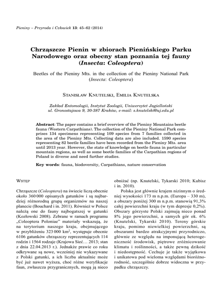 Pieniny – Przyroda i Człowiek 13: 45–62 (2014) Chrząszcze Pienin w zbiorach Pienińskiego Parku Narodowego oraz obecny stan poznania tej fauny (Insecta: Coleoptera) Beetles of the Pieniny Mts. in the collection of the Pieniny National Park (Insecta: Coleoptera) S K ,E K Zakład Entomologii, Instytut Zoologii, Uniwersytet Jagielloński ul. Gronostajowa 9, 30-387 Kraków, e-mail: [email protected] Abstract: The paper contains a brief overview of the Pieniny Mountains beetle fauna (Western Carpathians). The collection of the Pieniny National Park comprises 134 specimens representing 109 species from 7 families collected in the area of the Pieniny Mts. Collecting data are also included. 1590 species representing 82 beetle families have been recorded from the Pieniny Mts. area until 2013 year. However, the state of knowledge on beetle fauna in particular mountain regions, as well as some beetle families of the Carpathian regions of Poland is diverse and need further studies. Key words: fauna, biodoversity, Carpathians, nature conservation WSTĘP Chrząszcze (Coleoptera) na świecie liczą obecnie około 360 000 opisanych gatunków i są najbardziej różnorodną grupą organizmów na naszej planecie (Bouchard i in. 2011). Również w Polsce należą one do fauny najbogatszej w gatunki (Kozłowski 2008). Zebrane w ramach programu „Coleoptera Poloniae” materiały wskazują, że na terytorium naszego kraju, obejmującego w przybliżeniu 323 000 km2, występuje obecnie 6106 gatunków chrząszczy reprezentujących 114 rodzin i 1564 rodzaje (Krajowa Sieć… 2013; stan z dnia 22.04.2013 r.). Jednakże prawie co roku odkrywane są nowe, wcześniej nie wykazywane z Polski gatunki, a ich liczba aktualnie może być już nawet wyższa, choć różne weryfikacje faun, zwłaszcza przygranicznych, mogą ją nieco obniżać (np. Knutelski, Tykarski 2010; Kubisz i in. 2010). Polska jest głównie krajem nizinnym o średniej wysokości 173 m n.p.m. (Europa – 330 m), a obszary poniżej 300 m n.p.m. stanowią 91,3% całej powierzchni kraju (w tym depresje 0,2%). Obszary górzyste Polski zajmują nieco ponad 8% jego powierzchni, a samych gór ok. 6% (Knutelski, Tykarski 2010). Tereny górskie kraju, pomimo niewielkiej powierzchni, są obszarami bardzo atrakcyjnymi przyrodniczo, głównie ze względu na imponującą heterogeniczność środowisk, piętrowe zróżnicowanie klimatu i roślinności, a także pewną dzikość i niedostępność. Cechuje je także wyjątkowa i unikatowa pod wieloma względami bioróżnorodność, szczególnie dobrze widoczna w przypadku chrząszczy. 46 Pieniny – Przyroda i Człowiek 13, 2014 Jednym z najmniejszych, ale względnie najbardziej zasobnych w walory przyrodnicze obszarów górskich Polski są Pieniny. Przyroda tych gór należy do najcenniejszych w Europie, a jej fauna do najbogatszych i najbardziej wartościowych, zarówno pod względem koncentracji różnorodności biotycznej (hot spots), jak też walorów faunistycznych (Zarzycki 1982; Pawłowski 2000, 2008; Razowski 2000; Witkowski 2003a, 2003b). Chrząszcze obszarów górskich Polski już od początku XIX wieku budziły żywe zainteresowanie, o czym świadczy bardzo bogate piśmiennictwo liczące ok. 1800 pozycji poświęconych tej faunie. Jednakże stopień poznania koleopterofauny poszczególnych „krain” górskich jest w wielu przypadkach niewystarczający i bardzo zróżnicowany. Względnie najlepiej poznane są Coleoptera Bieszczadów (Nowicki 1858; Pawłowski i in. 2000; Wojas 2012), Beskidu Zachodniego (Petryszak 1992; Kubisz, Szafraniec 2003) oraz Pienin (Pawłowski 2000). Inne „krainy” górskie nie doczekały się dotychczas kompleksowych opracowań ogółu chrząszczy a publikacje dotyczą jedynie niektórych grup z określonych regionów (Banaszak i in. 2004), np.: kózek (Gutowski 1988), czy ryjkowców (Petryszak 1982, Knutelski 2005), bądź też opracowania faun chrząszczy obszarów górzystych Polski są zbyt ogólne i wybiórcze. Chrząszcze Pienin, pomimo pozornie dobrego poznania, są zbadane nierównomiernie i niedostatecznie (Pawłowski 2000; Sienkiewicz 2002; Knutelski, Sprick 2007; Knutelski, Tykarski 2010; Knutelski, Surowiak 2011; Ścibior 2010, 2013; Ścibior i Szafraniec 2012). Również wiele kolekcji Coleoptera Pienin, w tym także zbiory naukowe będące w posiadaniu Pienińskiego Parku Narodowego (PPN), nie zostało dotychczas opisanych. Jedynie część z nich opracował Pawłowski (2000). Chrząszczami Pienin interesowano się prawdopodobnie się już pod koniec XVI wieku, co sugeruje dokument pochodzący z 1595 roku (Dąbrowski 2008). Jednakże pierwsze publikowane wzmianki o tej faunie ukazały się dopiero w latach siedemdziesiątych XIX wieku (Nowicki 1864, 1865). Prace te informują o 32 gatunkach z Pienin (wyróżnione grecką literą „π”), bez jakichkolwiek innych danych faunistycznych (np. data zbioru, stanowiska, siedlisko, autor zbioru i inne). Z tego powodu można mieć wątpliwości, czy wszystkie te taksony zostały zebrane na obszarze Pienin Centralnych w obecnie przyjętych granicach (Kondracki 1978), zwłaszcza, że dawniej granice wielu rejonów karpackich były inaczej ujmowane niż obecnie (Knutelski 1998). Podobnie wiele późniejszych publikacji, obejmujących jedynie listy gatunków pienińskich, wymagają ostrożnego i krytycznego traktowania. Występowanie szeregu z tych gatunków w Pieninach wymaga zweryfikowania i udokumentowania. Historię badań chrząszczy Pienin do 2000 roku szczegółowo przedstawił Pawłowski (2000), opierając się głównie o dane z Katalogu Fauny Polski, zwłaszcza jego 23 części (Burakowski i in. 1973–1997, 2000) oraz innych publikacji, a także o wyniki własnych badań kilku kolekcji chrząszczy pienińskich będących w posiadaniu Instytutu Systematyki i Ewolucji Zwierząt PAN w Krakowie. Później ukazało się jeszcze szereg kolejnych prac na temat tej koleopterofauny (Sienkiewicz 2002; Knutelski, 