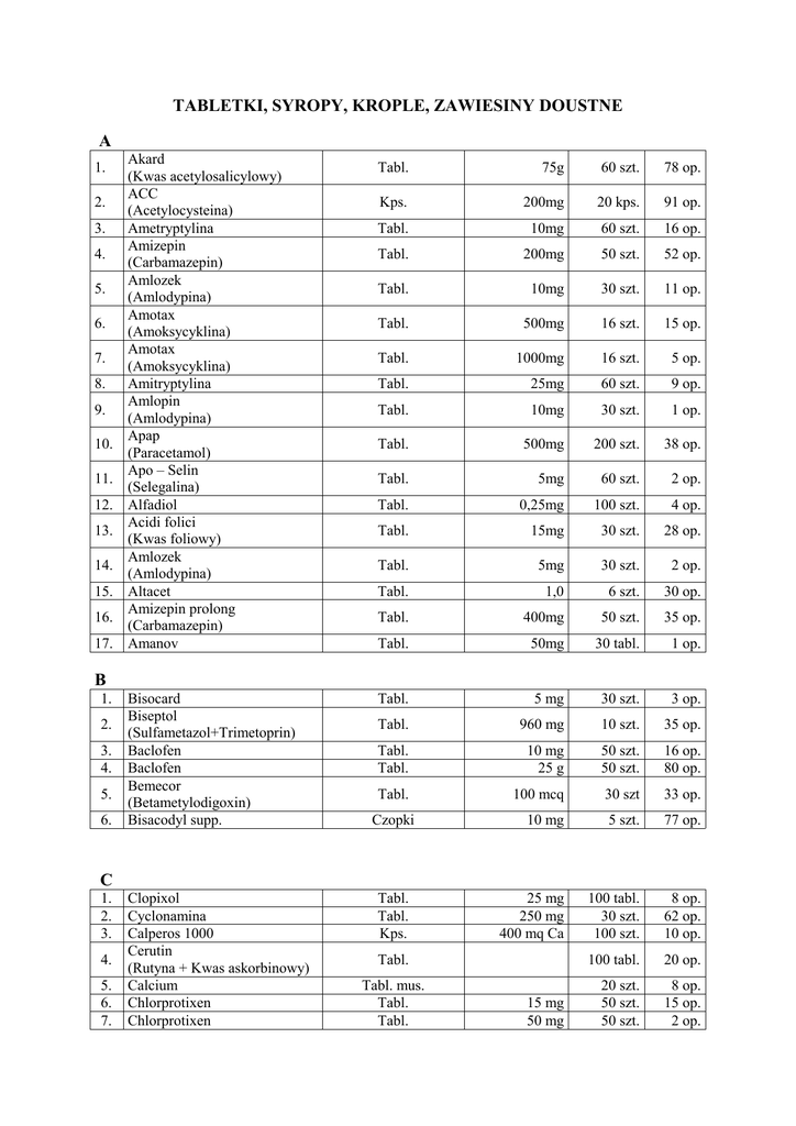 TABLETKI, SYROPY, KROPLE, ZAWIESINY DOUSTNE A 1. 2. 3. 4. 5. 6. 7. 8. 9. 10. 11. 12. 13. 14. 15. 16. 17. Akard (Kwas acetylosalicylowy) ACC (Acetylocysteina) Ametryptylina Amizepin (Carbamazepin) Amlozek (Amlodypina) Amotax (Amoksycyklina) Amotax (Amoksycyklina) Amitryptylina Amlopin (Amlodypina) Apap (Paracetamol) Apo – Selin (Selegalina) Alfadiol Acidi folici (Kwas foliowy) Amlozek (Amlodypina) Altacet Amizepin prolong (Carbamazepin) Amanov Tabl. 75g 60 szt. 78 op. Kps. 200mg 20 kps. 91 op. Tabl. 10mg 60 szt. 16 op. Tabl. 200mg 50 szt. 52 op. Tabl. 10mg 30 szt. 11 op. Tabl. 500mg 16 szt. 15 op. Tabl. 1000mg 16 szt. 5 op. Tabl. 25mg 60 szt. 9 op. Tabl. 10mg 30 szt. 1 op. Tabl. 500mg 200 szt. 38 op. Tabl. 5mg 60 szt. 2 op. Tabl. 0,25mg 100 szt. 4 op. Tabl. 15mg 30 szt. 28 op. Tabl. 5mg 30 szt. 2 op. Tabl. 1,0 6 szt. 30 op. Tabl. 400mg 50 szt. 35 op. Tabl. 50mg 30 tabl. 1 op. Tabl. 5 mg 30 szt. 3 op. Tabl. 960 mg 10 szt. 35 op. Tabl. Tabl. 10 mg 25 g 50 szt. 50 szt. 16 op. 80 op. Tabl. 100 mcq 30 szt 33 op. 10 mg 5 szt. 77 op. 25 mg 250 mg 400 mq Ca 100 tabl. 30 szt. 100 szt. 8 op. 62 op. 10 op. 100 tabl. 20 op. 20 szt. 50 szt. 50 szt. 8 op. 15 op. 2 op. B 1. 2. 3. 4. 5. 6. Bisocard Biseptol (Sulfametazol+Trimetoprin) Baclofen Baclofen Bemecor (Betametylodigoxin) Bisacodyl supp. Czopki C 1. 2. 3. 4. 5. 6. 7. Clopixol Cyclonamina Calperos 1000 Cerutin (Rutyna + Kwas askorbinowy) Calcium Chlorprotixen Chlorprotixen Tabl. Tabl. Kps. Tabl. Tabl. mus. Tabl. Tabl. 15 mg 50 mg 8. 9. 10. 11. 12. 13. 14. 15. Cipronex (Ciprofloxacyna) Coaxil Clonazepam Cipronex (Ciprofloxacyna) Clemastin Captopril Captopril Czopki glicerynowe Tabl. 500 mg 10 szt. 120 op. Tabl. Tabl. 12,5 mg 2 mg 30 szt. 30 szt. 1 op. 6 op. Tabl. 250 mg 10 szt. 24 op. Tabl. Tabl. Tabl. Czopki 1 mg 50 mg 25 mg 2,0 30 szt. 30 szt. 30 szt. 10 szt. 20 op. 5 op. 2 op. 22 op. Tabl. Tabl. Tabl. Kps. Kps. Tabl. Kps. Tabl. Tabl. zaw. do oczu i uszu 0,1 0,25 0,2 10 mg 25 mg 1 mg 0,1 g 250 mg 500 mg 30 szt. 30 szt. 60 szt. 30 szt. 30 szt. 20 szt. 10 szt. 50 szt. 60 szt. 10 ml 22 op. 11 op. 25 op. 56 op. 31 op. 65 op. 89 op. 1 op. 10 op. 6 op. Kps. 50 mg 100 szt. 9 op. Tabl. 20 mg 20 szt. 150 ml 98 op. 70 szt. Tabl. 8 mg 20 szt. 130 op. 50 mg 40 mg 20 mg 40 mg/ g 80 mg/ 100 ml 50 mg/ 10 ml 30 szt. 30 szt. 30 szt. 100 ml 120 ml 150 ml 75 op. 95 op. 1 op. 3 op. 15 op. 1 op. 100 mg 30 szt. 8 op. 10 szt. 5 ml 250 g 2 op. 7 op. 15 op. 10 ml 100 ml 11 op. 2 op. D 1. 2. 3. 4. 5. 6. 7. 8. 9. 10. 11. Digoxin Digoxin Diprophillina Doxepin Doxepin Dexamethason Doxycyklina Dopegyt Datralex Duortinett Diaprel MV – jest duŜo E 1. 2. 3. Esputicon (Dimethiconum) Estazolam Enema lub Rectanal F 1. 2. 3. 4. 5. 6. 7. Flegamina (Chlorowodorek bromhexydyny) Furagin Furosemid Fluoksetyna Fenactil 4% Flegamina Flukonazol Tabl. Tabl. Tabl. Krople Syrop Syrop G 1. 2. 3. 4. Glukobay (Akarbosum) Ginalopin Gentamycyna 0,3% Gelatum Alumini Phosph. Tabl. Tabl. dopoch. Krople do oczu Zawiesina H 1. 2. Haloperidol Haloperidol Krople Krople 2 mg/ 1ml 2 mg/ 1ml 3. 4. 5. 6. 7. 8. Hydroxyzyna Hemofer F prolong. Hydroxyzyna Hydroxyzyna Haloperidol Heminevrin Heparegen 9. (Kwas tiazonilidokarboxylowy) 10. Hemorol Syrop Tabl. Tabl. Tabl. Tabl. 10 mg 25 mg 1 mg 300 mg 250 g 30 szt. 30 szt. 30 szt. 40 szt. 100 szt. Tabl. 100 mg 100 szt. 6 op. 12 szt. 2 op. Czopki 58 op. 55 op. 22 op. 11 op. 28 op. 2 op. I 1. 2. Imipramina Imipramina Tabl. Tabl. 25 mg 10 mg 20 szt. 20 szt. 4 op. 2 op. Kreon 10.000j. Kreon 10.000j. Ketonal forte (Ketoprofen) Ketonal (Ketoprofen) Kalipoz prolong. (Kalii chlorati) Ketokonazol Kps. Kps. 150 mg 150 mg 20 szt. 50 szt. 1 op. 5 op. Tabl. 100 mg 20 szt. 67 op. Kps. 50 mg 24 szt. 117 op. Tabl. 0,75 g 30 szt. 51 op. Tabl. 200 mg 20 szt. 36 op. 30 mg 2,5 mg 1,0 mg 2 mg 100 mg 2,5 mg/ 5ml 2,5 mg/ 5ml 30 szt. 25 szt. 25 szt. 30 szt. 10 szt. 1000 ml 150 ml 10 amp. 50 amp. 3 op. 4 op. 1 op. 50 op. 2 op. 31 op. 3 op. 3 op. 1 op. 50 mg 100 mg 500 mg 1200 mg 10 mg 10 mg 20 mg 40 mg 50 mg 100 mg 2 mg 30 mg 250 mg 20 szt. 50 szt. 10 szt. 60 szt. 50 szt. 60 szt. 60 szt. 30 szt. 30 szt. 30 szt. 30 szt. 20 szt. 30 szt. 5 ml 2 op. 3 op. 4 op. 12 op. 32 op. 49 op. 13 op. 7 op. 170 op. 2 op. 5 op. 7 op. 1 op. 5 op. K 1. 2. 3. 4. 5. 6. L 1. 2. 3. 4. 5. 6. 7. 8. 9. Lenvon Lorafen Lorafen Loperamid Luminal Lactulosa Lactulosa Lakcid Lakcid Tabl. Tabl. Tabl. Tabl. Tabl. Syrop Syrop Amp. do sporz. zaw. Amp. do sporz. zaw. M 1. 2. 3. 4. 5. 6. 7. 8. 9. 10. 11. 12. 13. 14. Myolastin Milurit Metronidazol Memotropil Metoclopramid Mononit Mononit Mononit Metoprolol Metoprolol Molsidomina Mukosolvan Mefant Mibalin Tabl. Tabl. Tabl. dopoch. Tabl. Tabl. Tabl. Tabl. Tabl. Tabl. Tabl. Tabl. Tabl. Tabl. Krople do oczu N 1. 2. 3. 4. 5. 6. 7. 8. Nystatyna Nystatyna Nutrison Energy Neopancreatyna Nolicyn No – Spa Nifuroksazyd Nitrogliceryna Tabl. Zaw. doustna 500.000 j. 2400.000 j./ 5g Tabl. Tabl. Tabl. Tabl. Tabl. podj. 400 mg 40 mg 100 mg 0,5 mg 16 szt. 24 ml 500 ml 30 szt. 20 szt. 20 szt. 24 szt. 20 szt. 8 op. 27 op. 85 op. 9 op. 17 op. 29 op. 20 op. 1 op. Tabl. Tabl. Krople do uszu 120 mg 240 mg 2 g/ 10 g 30 szt. 30 szt. 10 g 11 op. 1 op. 2 op. Płyn Tabl. 10 mg 500 ml 50 szt. 116 op. 20 op. Tabl. 0,1 30 szt. 6 op. Tabl. 4 mg 90 szt. 70 op. Tabl. 75 mg 50 szt. 12 op. Tabl. 0,4 20 szt. 73 op. Tabl. 0,4 60 szt. 45 op. Tabl. 150 mg 50 szt. 30 op. Tabl. Tabl. Tabl. Tabl. Tabl. Tabl. Tabl. Tabl. 25 mg 50 mg 100 mg 1 mg 500 mg 10.000j. lipazy 25 mg 100 mg 60 szt. 60 szt. 60 szt. 30 szt. 10 szt. 20 szt. 20 szt. 20 szt. 69 op. 36 op. 23 op. 7 op. 17 op. 1 op. 2 op. 1 op. Tabl. 150 mg 60 szt. 86 op. Tabl. Tabl. 150 mg 100 mg 60 szt. 5 szt. 25 op. 65 op. Tabl. 5 mg 20 szt. 11 op. Tabl. 100 mg 20 szt. 1 op. Tabl. 25 mg 100 szt. 23 op. O 1. 2. 3. Oxycardil Oxycardil Otinum P 1. 2. 3. 4. 5. 6. 7. 8. 9. 10. 11. 12. 13. 14. 15. 16. Peptisorb Propranolol Portram retard (Tramadol) Prestarium Polocard (Ac. acetylosalicyl) Polfilin prolong. (Pentoxyfilin) Polifilin prolong. Polocard (Ac. acetylosalicyl) Pro