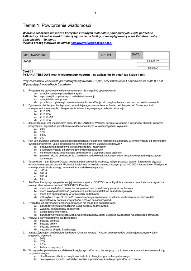 1 Temat 1: Powtórzenie wiadomości W czasie zaliczenia nie można korzystać z żadnych materiałów pomocniczych. Będą potrzebne kalkulatory. Aktualne stawki zostaną wypisane na tablicy przez wytypowaną przez Państwa osobę. Czas pisania – 60 minut. Pytania proszę kierować na adres: [email protected] IMIĘ I NAZWISKO: GRUPA: DATA Uwagi: PUNKTY OCENA Część I PYTANIA TESTOWE (test wielokrotnego wyboru) – na zaliczeniu 10 pytań (za każde 1 pkt). Przy zakreśleniu wszystkich prawidłowych odpowiedzi – 1 pkt., przy zakreśleniu 1 odpowiedzi za mało 0,5 pkt. W pozostałych wypadkach 0 punktów. 1. Ryczałtem od przychodów ewidencjonowanych nie mogą być opodatkowane: a) usługi w zakresie prowadzenia aptek, b) reprodukcji komputerowych nośników informacji c) usługi detektywistyczne, d) przychody z tytułu wykonywania wolnych zawodów, jeżeli usługi są świadczone na rzecz osób prawnych 2. Zgłoszenie płatnika (osoby fizycznej), zatrudniającego pracowników w Zakładzie Ubezpieczeń Społecznych do ubezpieczeń społecznych i ubezpieczenia zdrowotnego wymaga złożenia deklaracji: a) ZUZ ZZA b) ZUS ZFA c) ZUS ZUZIA d) ZUS ZPA 3. Janusz Barman jest właścicielem pubu „PIESZCZOSZEK” W lokalu serwuje się napoje o zawartości alkoholu znacznie powyżej 5%. Ryczałt od przychodów ewidencjonowanych w takim przypadku wyniesie: a) 20% b) 17% c) 8,5% d) 3% 4. Pan Jan Zwierzak zakłada działalność gospodarczą. Postanowił rozliczać się z podatku w formie ryczałtu od przychodów ewidencjonowanych. Jakie oświadczenie powinien złożyć w urzędzie skarbowym? a) o rezygnacji z podatkowej księgi przychodów i rozchodów, b) o wyborze ryczałtu od przychodów ewidencjonowanych c) nie musi składać dodatkowego oświadczenia o wyborze zasad ogólnych d) powinien złożyć oświadczenie o założeniu podatkowej księgi przychodów i rozchodów przed rozpoczęciem działalności 5. Taksówkarz – pan Edward Okazja, posiada jeden samochód osobowy, którym przewozi towary. Zastanawia się, jaką wybrać formę opodatkowania. Prowadzi działalność w mieście zamieszkiwanym przez 400 000 mieszkańców. Miesięczne stawki podatku dochodowego w formie karty podatkowej wynoszą: a) 160 zł b) 241 zł c) 286 zł d) 99 zł 6. Jan Domofon wynajmuje parter swojej kamienicy spółce „BORYS” z o. o. Zgodnie z umową z dnia 1 stycznia czynsz za miesiąc stanowi równowartość 3000 EURO. Pan Jan: a) może nie zakładać działalności i odprowadzać zryczałtowany podatek dochodowy b) może założyć działalność gospodarczą i obliczać podatek na zasadach ogólnych c) może być opodatkowany w formie karty podatkowej, d) jeśli wybierze ryczałt, to do 20 dnia następnego miesiąca po uzyskaniu dochodów musi odprowadzić zryczałtowany podatek w wysokości 8,5% od całości przychodu 7. Ryczałtem od przychodów ewidencjonowanych nie mogą być opodatkowane: a) przychody z tytułu świadczenia usług doradcy podatkowego,, b) wynajmu samochodów osobowych c) usługi detektywistyczne, d) przychody z tytułu wykonywania wolnych zawodów, jeżeli usługi są świadczone na rzecz osób prawnych 8. Wpływy z karty podatkowej są dochodem:: a) budżetu państwa b) budżetu gminy c) budżetu powiatu d) naczelnika Urzędu Skarbowego 9. Janusz Żyrant jest właścicielem lombardu „Ostatnia koszula” Ryczałt od przychodów ewidencjonowanych w takim przypadku wyniesie: a) 20% b) 17% c) 8,5% d) żadna z powyższych 10. W przypadku prowadzenia podatkowej księgi przychodów i rozchodów przy użyciu komputera, warunkiem uznania ksiąg za prawidłowe jest: a) określenie na piśmie szczegółowej instrukcji obsługi programu komputerowego b) dokonywanie wydruku po każdym zapisie w podatkowej księdze przychodów i rozchodów 2 11. 12. 13. 14. 15. 16. 17. 18. 19. 20. 21. 22. 23. c) możliwość przesłania danych do urzędu skarbowego przez Internet. d) dokonanie wydruku podatkowej księgi przychodów i rozchodów w wymaganych terminiach Podatnik VAT w podatkowej księdze przychodów i rozchodów wpisuje: a) zawsze kwoty brutto b) kwoty netto, jeżeli podatek VAT podlega odliczeniu c) kwoty brutto, jeżeli VAT nie podlega odliczeniu i nie stanowi kosztu uzyskania przychodu d) kwoty brutto, jeżeli VAT nie podlega odliczeniu i stanowi koszt uzyskania przychodu Wycena spisu z natury materiałów i towarów handlowych powinna być dokonywana przez podatników prowadzących podatkową księgę przychodów i rozchodów: a) według ceny zakupu b) według ceny zakupu c) według ceny zakupu lub nabycia d) w terminie 14 dni od dokonania spisu z natury W kolumnie 8 – „Pozostałe przychody” u podatników podatku VAT należy zaewidencjonować: a) kwotę odsetek od wykorzystanego kredytu bankowego b) zapłacone kary umowne c) otrzymaną od nierzetelnego kontrahenta karę umowną d) wartość sprzedaży netto towarów handlowych wynikającą z faktury sprzedaży VAT W ewidencji sprzedaży podatnik prowadzący podatkową księgę przychodów i rozchodów wpisuje przychody ze sprzedaży: a) udokumentowanej fakturami i rachunkami, b) udokumentowanej fakturami i rachunkami oraz bezrachunkowej, c) nie udokumentowanej fakturami lub rachunkami. d) nieopodatkowanej podatkiem VAT Podatkowa księga przychodów i rozchodów uznawana jest za rzetelną również wówczas, gdy: a) błędy spowodowały podwyższenie podstawy opodatkowania, z wyjątkiem błędów polegających na niewykazaniu i/ lub zaniżeniu kosztów (wydatków), b) błędy spowodowały podwyższenie podstawy opodatkowania, z wyjątkiem błędów polegających na zaniżeniu lub niewykazaniu kosztów zakupu materiałów podstawowych, towarów handlowych oraz kosztów robocizny, c) nie wpisane lub błędnie wpisane wartości przychodów nie przekraczają łącznie 0,5% przychodu wykazanego w księdze za ubiegły rok podatkowy d) nie wpisane lub błędnie wpisane wartości przychodów nie przekraczają łącznie 0,5% przychodu wykaza