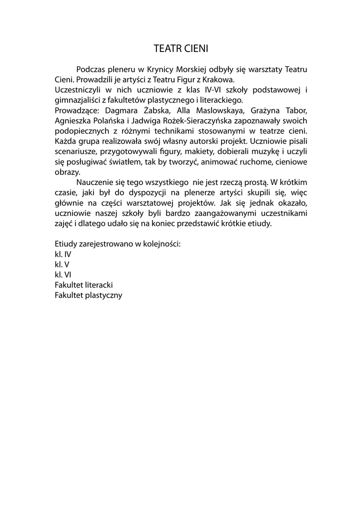 TEATR CIENI Podczas pleneru w Krynicy Morskiej odbyły się warsztaty Teatru Cieni. Prowadzili je artyści z Teatru Figur z Krakowa. Uczestniczyli w nich uczniowie z klas IV-VI szkoły podstawowej i gimnazjaliści z fakultetów plastycznego i literackiego. Prowadzące: Dagmara Żabska, Alla Maslowskaya, Grażyna Tabor, Agnieszka Polańska i Jadwiga Rożek-Sieraczyńska zapoznawały swoich podopiecznych z różnymi technikami stosowanymi w teatrze cieni. Każda grupa realizowała swój własny autorski projekt. Uczniowie pisali scenariusze, przygotowywali figury, makiety, dobierali muzykę i uczyli się posługiwać światłem, tak by tworzyć, animować ruchome, cieniowe obrazy. Nauczenie się tego wszystkiego nie jest rzeczą prostą. W krótkim czasie, jaki był do dyspozycji na plenerze artyści skupili się, więc głównie na części warsztatowej projektów. Jak się jednak okazało, uczniowie naszej szkoły byli bardzo zaangażowanymi uczestnikami zajęć i dlatego udało się na koniec przedstawić krótkie etiudy. Etiudy zarejestrowano w kolejności: kl. IV kl. V kl. VI Fakultet literacki Fakultet plastyczny