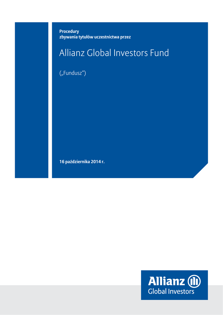 Procedury zbywania tytułów uczestnictwa przez Allianz Global Investors Fund („Fundusz“) 16 października 2014 r. Niniejsze procedury zostały przygotowane w związku z wymogiem art. 253 ust. 3 pkt 1 ustawy z dnia 27 maja 2004 r. o funduszach inwestycyjnych („Ustawa“), który zobowiązuje spółkę zarządzającą funduszem zagranicznym zamierzającym zbywać emitowane przez siebie tytuły uczestnictwa na terytorium Rzeczypospolitej Polskiej do przedstawienia Komisji Nadzoru Finansowego szczegółowego opisu sposobów zbywania na terytorium Rzeczypospolitej Polskiej tych tytułów uczestnictwa, w tym zasad i warunków wpłacania i wypłacania kwot związanych z nabywaniem i odkupywaniem tytułów uczestnictwa oraz sposobu udostępniania informacji o funduszu zagranicznym. Niniejsze procedury dotyczą wyłącznie zasad zbywania na terytorium Rzeczypospolitej Polskiej tytułów uczestnictwa funduszu Allianz Global Investors Fund i nie odnoszą się do wymogów określonych odrębnie dla podmiotów pośredniczących w zbywaniu i odkupywaniu tytułów uczestnictwa Funduszu oraz wymogów określonych dla pośredników finansowych działających na podstawie ustawy z dnia 29 lipca 2005 r. o obrocie instrumentami finansowymi, dotyczących przyjmowania i przekazywania zleceń nabycia lub zbycia instrumentów finansowych w zakresie, o którym mowa w art. 32 ust. 1 Ustawy. W szczególności niniejsze procedury nie zastępują w żadnym zakresie dokumentów określających sposób i warunki prowadzenia zbywania i odkupywania tytułów uczestnictwa, warunki dokonywania wpłat i wypłat związanych z prowadzeniem zbywania i odkupywania tytułów uczestnictwa, warunków technicznych i organizacyjnych wykonywania działalności w zakresie zbywania i odkupywania tytułów uczestnictwa, procedur zapobiegających ujawnieniu lub wykorzystaniu informacji stanowiących tajemnicę zawodową, procedur kontroli wewnętrznej oraz zasad przechowywania i archiwizowania dokumentów związanych z prowadzeniem zbywania i odkupywania tytułów uczestnictwa – obowiązujących podmioty o których mowa w zdaniu poprzednim, niezależnie od niniejszych procedur. Allianz Global Investors Fund DEFINICJE Wyrażenia używane w niniejszych Procedurach przyjmują następujące znaczenie: 1. Agent Płatności Bank Handlowy w Warszawie S.A., ul. Senatorska 16, 00-923 Warszawa, wykonujący obowiązki agenta płatności określone w Ustawie i niniejszych Procedurach. 2. Agent Transferowy RBC Dexia Investor Services Bank S.A. 14, Porte de France L-4360 Esch-sur-Alzette, Luksemburg, występujący jako agent transferowy i rejestrowy Funduszu prowadzący Rejestr Uczestników Funduszu. 3. Depozytariusz State Street Bank Luxembourg S.A., 49, Avenue J.F. Kennedy, L-1855 Luksemburg. 4. Dodatkowa Informacja dla Inwestorów Dokument, o którym mowa w art. 254 ust. 1a Ustawy. 5. Dystrybutor podmiot uprawniony na podstawie Ustawy, a także, jeżeli Ustawa tego wymaga na podstawie zezwolenia Komisji Nadzoru Finansowego, do pośredniczenia w zbywaniu i odkupywaniu tytułów uczestnictwa funduszy zagranicznych. 6. Dywidenda Dochód z tytułu uczestnictwa w Funduszu wypłacany bez konieczności odkupywania Udziałów posiadaczom tych Udziałów, z których posiadaniem łączy się prawo do otrzymania dochodu. 7. Dzień Roboczy Dzień będący jednocześnie dniem roboczym i giełdowym na giełdzie w Luksemburgu o ile co innego nie jest określone w Prospekcie. 8. Dzień Wyceny Każdy dzień, który jest Dniem Roboczym, stosowany do określenia wartości aktywów netto na Udział każdego Funduszu. 9. Fundusz Allianz Global Investors Fund z wydzielonymi Sub-Funduszami. 10. Klasy Udziałów/Klasa Wskazane w Prospekcie Kategorie Udziałów w SubFunduszu(ach), różniące się od siebie przede wszystkim opłatami związanymi z ich nabywaniem oraz innymi opłatami obciążającymi aktywa przypadające na daną Klasę Udziałów, które mogą być oferowane za pośrednictwem Dystrybutorów. W ramach tych samych Klas Udziałów mogą istnieć Udziały, z których posiadaniem łączy się prawo Uczestnika do otrzymania Dywidendy. 11. Klient Uczestnik i potencjalny Uczestnik. Uczestnikiem Sub-Funduszu w rozumieniu niniejszych Procedur nie będzie podmiot pośredniczący w zbywaniu i odkupywaniu tytułów uczestnictwa (Udziałów) na terytorium Rzeczypospolitej Polskiej – w przypadku osób nabywających tytuły uczestnictwa za pośrednictwem takiego podmiotu ani podmiot będący nierezydentem w rozumieniu ustawy z dnia 27 lipca 2002 Pawo dewizowe (Dz. U. 2002 Nr 141 poz. 1178 ze zm.). 12. Kluczowa Informacja dla Inwestorów Dokument zawierający informacje o podstawowych cechach SubFunduszu, sporządzony zgodnie z rozporządzeniem Komisji (UE) nr 583/2010 z dnia 1 lipca 2010 r. w sprawie wykonania dyrektywy Parlamentu Europejskiego i Rady 2009/65/WE w zakresie kluczowych informacji dla inwestorów i warunków, które należy spełnić w przypadku dostarczania kluczowych informacji dla inwestorów lub prospektu emisyjnego na trwałym nośniku innym niż papier lub za pośrednictwem strony internetowej. 13. Nabycie Udziałów Przydzielenie Udziałów w Sub-Funduszu(ach) wskazanych przez Klienta w Zleceniu Nabycia Udziałów w zamian za powierzone środki pieniężne. 14. Odkupienie Udziałów Odkupienie Udziałów, w Sub-Funduszu(ach) wskazanych przez Klienta w Zleceniu Odkupienia Udziałów, w wyniku którego następuje wypłata środków pieniężnych stanowiących równowartość Udziałów. 15. Opłata manipulacyjna (Opłata początkowa płatna z góry) Opłata, która może być pobierana przy Nabyciu Udziałów danej Klasy lub Odkupieniu Udziałów danej Klasy. Zasady pobierania opłat manipulacyjnych określone są w Prospekcie. 16. Osoba fizyczna nieposiadająca pełnej zdolności do czynności prawnej Ocena zdolności do czynności prawnych osoby fizycznej podlega prawu polskiemu. a) Osoba fizyczna nieposiadająca zdolności do czynności 