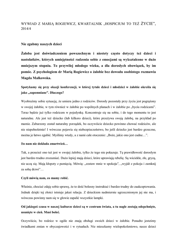 WYWIAD Z MARIĄ ROGIEWICZ, KWARTALNIK „HOSPICJUM TO TEŻ ŻYCIE”, 2014/4 Nie zgubmy naszych dzieci Żałoba jest doświadczeniem powszechnym i niestety często dotyczy też dzieci i nastolatków, których umiejętności radzenia sobie z emocjami są wykształcone w dużo mniejszym stopniu. To przywilej młodego wieku, a dla dorosłych obowiązek, by im pomóc. Z psychologiem dr Marią Rogiewicz o żałobie bez dowodu osobistego rozmawia Magda Małkowska. Spotykamy się przy okazji konferencji, w której tytule dzieci i młodzież w żałobie określa się jako „zapomniane”. Dlaczego? Wyobraźmy sobie sytuację, że umiera jedno z rodziców. Dorosły pozostały przy życiu jest pogrążony w swojej żałobie, w tym również w żałobie po wspólnych planach i w żałobie po „byciu rodzicami”. Teraz będzie już tylko rodzicem w pojedynkę. Koncentruje się na sobie, i do tego momentu to jest naturalne. Ale jest też dziecko (lub kilkoro dzieci), które przeżywa swoją żałobę, na przykład po mamie. Zaburzony został naturalny porządek, bo oczywiście dziecko powinno chować rodziców, ale nie niepełnoletnie! I wówczas pojawia się niebezpieczeństwo, bo jeśli dziecko jest bardzo grzeczne, można je łatwo zgubić. Myślimy wtedy, a z nami całe otoczenie: „Boże, jakie ono jest cudne…”. Bo nam nie dokłada zmartwień… Tak, a przecież ono też jest w swojej żałobie, tylko że tego nie pokazuje. Tę prawidłowość dorosłym jest bardzo trudno zrozumieć. Dużo lepiej mają dzieci, które uprawiają rebelię. Są wściekłe, złe, gryzą, nie uczą się. Mają kłopoty z pamięcią. Mówią: „zostaw mnie w spokoju”, „wyjdź z pokoju i zamknij za sobą drzwi”… Czyli mówią nam, co mamy robić. Właśnie, chociaż zdaję sobie sprawę, że to dość bolesny instruktaż i bardzo trudny do zaakceptowania. Jednak dzięki tej złości istnieje jakaś relacja. Z dzieckiem nadmiernie ugrzecznionym jej nie ma, i wówczas powinny nam się w głowie zapalić wszystkie lampki. Od jakiegoś czasu w naszej kulturze dzieci są w centrum świata, a tu nagle zostają odepchnięte, usunięte w cień. Musi boleć. Oczywiście, bo rodzice w ogóle nie znają obsługi swoich dzieci w żałobie. Ponadto jesteśmy świadkami zmian w obyczajowości i w rytuałach. Nie mieszkamy wielopokoleniowo, nasze dzieci separujemy od śmierci, nawet w rozmowach, bo to dla nich za trudne, a tak naprawdę to trudno jest nam. Nowe rytuały się nie wytworzyły, albo wytworzył się rytuał, żeby nie było rytuałów. Śmierć jest wciąż niewygodna i kompletnie niemedialna. Typowe, że rodzic płacze, ale przed swoim dzieckiem ukrywa te łzy i ich powód. Dziecko nie może zobaczyć słabego rodzica, dostaje instrukcję: „Masz się trzymać, nie mazać. Słabość trzeba ukrywać”. Czy istnieje różnica w przeżywaniu żałoby przez dzieci i przez dorosłych? Jeżeli chodzi o rodzaj emocji, to różnicy nie ma. Natomiast pojmowanie śmierci zmienia się wraz z przybywaniem lat i nawet u dzieci, w zależności od ich wieku, jest różne. Dla małych, 2-4-letnich, to rodzaj snu, po którym kiedyś człowiek się obudzi. U starszych dochodzi myślenie magiczne, odpowiedzialne m.in. za poczucie winy. Dzieci naprawdę czasami sądzą, że swoim zachowaniem zabiły mamę. W efekcie takich myśli pojawia się cały wachlarz zachowań: od agresji, przez płacz, po kłopoty ze snem czy z pamięcią. Dla przeżywania żałoby bardzo ważne jest branie udziału w przygotowaniach do pogrzebu, na przykład przy wyborze trumny, kwiatów czy tworzeniu nekrologu. Istotne dla dziecka są też wkładane do trumny pamiątki, które mają pomóc zmarłemu na tamtym świecie, a tak naprawdę pomagają osieroconym dzieciom. Śmierć jest dla nich wydarzeniem, które mogą różnym osobom opowiadać tak jak zwykły news. U dorosłych niejednokrotnie wzbudza to konsternację. Trudno się dziwić, ale dzieci nic nie są tu winne, a już z pewnością nie są nieczułe, jak to interpretują niektórzy. To jest kwestia odmiennego rozumienia pojęć zarówno ciężkiej choroby, jak śmierci. Dzieci mają cudowną właściwość przechodzenia ze świata swojej żałoby do świata swojego dzieciństwa i dlatego, prawie w środku wielkiego płaczu, potrafią się otrzepać i wesoło zapytać o lody. Normalne. A z kolei na tych lodach mogą znowu zacząć płakać itd. To może dezorientować. A co z nastolatkami? Z nastolatkami jest najgorzej. Dzieciństwo mają już za sobą, ale przecież nie są dorośli. Ich stan można przyrównać do zawieszonego w próżni. Nastolatki doskonale rozumieją, że zdarzyło się coś nieodwracalnego. Nigdy nie będą mogli ani się z tym rodzicem pokłócić, ani pogodzić, ani zapytać o drogę. Pamiętajmy przecież, że nastolatki zwyczajowo wyruszają na wojnę z rodzicami, i to w pełnym rynsztunku. I jak mają się czuć, kiedy nagle zabraknie im jednego „wroga”, a drugiemu są zobowiązywani przez otoczenie, by pomagać. Bo są „prawie dorośli. Zewsząd słyszą: „Nie płacz”, „Nie dokładaj swojemu tacie”. I wtedy można je zgubić. Kiedy żałoba się kończy? Tak naprawdę to nigdy. Ona jedynie przebiera się w inne jakości. Fale, które nas zalewają, są coraz rzadsze i mają inną treść. Coraz mniej bolą. Dramatyczny czas żałoby trwa od pół roku do 2 lat. Wszystko zależy od głębokości relacji, jej jakości i okoliczności śmierci. Pierwszy rok nazwałabym rodzajem testowania – czy to się da przeżyć. Po kolei obchodzi się rocznice, przerabia się różne sytuacje bez tej osoby. Drugi rok to obserwacja, że się jednak da. Człowiekiem targają skrajne emocje – od takich, że nic się nie stało i może być tak jak dawniej, do tzw. psychicznej demolki, że nic już nie będzie tak jak kiedyś. Od ściany do ściany. Przebieg żałoby w dużym stopniu zależy też od dziedzictwa w przeżywaniu emocjonalnym. W rodzinie może prz