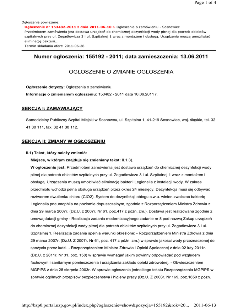 Page 1 of 4 Ogłoszenie powiązane: Ogłoszenie nr 153482-2011 z dnia 2011-06-10 r. Ogłoszenie o zamówieniu - Sosnowiec Przedmiotem zamówienia jest dostawa urządzeń do chemicznej dezynfekcji wody pitnej dla potrzeb obiektów szpitalnych przy ul. Zegadłowicza 3 i ul. Szpitalnej 1 wraz z montaŜem i obsługą. Urządzenia muszą umoŜliwiać eliminację bakterii... Termin składania ofert: 2011-06-28 Numer ogłoszenia: 155192 - 2011; data zamieszczenia: 13.06.2011 OGŁOSZENIE O ZMIANIE OGŁOSZENIA Ogłoszenie dotyczy: Ogłoszenia o zamówieniu. Informacje o zmienianym ogłoszeniu: 153482 - 2011 data 10.06.2011 r. SEKCJA I: ZAMAWIAJĄCY Samodzielny Publiczny Szpital Miejski w Sosnowcu, ul. Szpitalna 1, 41-219 Sosnowiec, woj. śląskie, tel. 32 41 30 111, fax. 32 41 30 112. SEKCJA II: ZMIANY W OGŁOSZENIU II.1) Tekst, który naleŜy zmienić: Miejsce, w którym znajduje się zmieniany tekst: II.1.3). W ogłoszeniu jest: Przedmiotem zamówienia jest dostawa urządzeń do chemicznej dezynfekcji wody pitnej dla potrzeb obiektów szpitalnych przy ul. Zegadłowicza 3 i ul. Szpitalnej 1 wraz z montaŜem i obsługą. Urządzenia muszą umoŜliwiać eliminację bakterii Legionella z instalacji wody. W zakres przedmiotu wchodzi pełna obsługa urządzeń przez okres 24 miesięcy. Dezynfekcja musi się odbywać roztworem dwutlenku chloru (CIO2). System do dezynfekcji obiegu c.w.u. winien zwalczać bakterię Legionella pneumophila na poziomie dopuszczalnym, zgodnie z Rozporządzeniem Ministra Zdrowia z dnia 29 marca 2007r. (Dz.U. z 2007r, Nr 61, poz.417 z późn. zm.). Dostawa jest realizowana zgodnie z umową dotacji gminy - Realizacja zadania modernizacyjnego zadanie nr 8 pod nazwą Zakup urządzeń do chemicznej dezynfekcji wody pitnej dla potrzeb obiektów szpitalnych przy ul. Zegadłowicza 3 i ul. Szpitalnej 1. Realizacja zadania spełnia warunki określone: - Rozporządzeniem Ministra Zdrowia z dnia 29 marca 2007r. (Dz.U. Z 2007r. Nr 61, poz. 417 z późn. zm.) w sprawie jakości wody przeznaczonej do spoŜycia przez ludzi. - Rozporządzeniem Ministra Zdrowia i Opieki Społecznej z dnia 02 luty 2011r. (Dz.U. z 2011r. Nr 31, poz. 158) w sprawie wymagań jakim powinny odpowiadać pod względem fachowym i sanitarnym pomieszczenia i urządzenia zakładu opieki zdrowotnej. - Obwieszczeniem MGPiPS z dnia 28 sierpnia 2003r. W sprawie ogłoszenia jednolitego tekstu Rozporządzenia MGPiPS w sprawie ogólnych przepisów bezpieczeństwa i higieny pracy (Dz.U. Z 2003r. Nr 169, poz.1650 z późn. http://bzp0.portal.uzp.gov.pl/index.php?ogloszenie=show&pozycja=155192&rok=20... 2011-06-13 Page 2 of 4 zm.). 2.1 Dane dotyczące przedmiotu zamówienia: Samodzielny Publiczny Szpital Miejski stanowią dwa oddalone od siebie o 7 km obiekty szpitalne. KaŜdy z nich posiada własną kotłownię, stację wymienników ciepła wraz z zasobnikami ciepłej wody uŜytkowej. Oba obiekty posiadają rozległe i nierównomiernie wykorzystywane instalacje ciepłej wody uŜytkowej. W obiekcie przy ul. Szpitalnej 1 urządzenia do likwidacji Legionelli zabudować w pobliŜu wymiennika cwu. w osobno stojącym budynku kotłowni. W obiekcie przy ul. E. Zegadłowicza 3 lokalizacja kotłowni to piwnica pawilonu B. Tam równieŜ zabudować instalację w pobliŜu wymiennika cwu. Zapotrzebowanie na cwu wynosi < 5m3 h dla ul. Szpitalnej i , niŜ 10m3 h dla ul. E. Zegadłowicza. 2.2 Zakres prac - wizja lokalna - przed złoŜeniem oferty wymagane jest dokonanie wizji lokalnej w budynkach szpitalnych w celu zapoznania się z istniejącym stanem technicznym węzła cieplnego i instalacją ciepłej wody .Wizja przeprowadzona zostanie przy udziale przedstawiciela Zamawiającego. Z dokonanej wizji lokalnej zostanie sporządzony protokół przy udziale Zamawiającego, Zamawiający ustala zebranie Wykonawców w dniu 19.05.2011r. o godz. 1000 w siedzibie Zamawiającego przy ul. Zegadłowicza 3 i przy ul. Szpitalnej 1 (Dział Realizacji Remontów i Utrzymania Ruchu Infrastruktury Technicznej, ul. Szpitalna 1) celem przeprowadzenia wizji lokalnej lub na wniosek Wykonawców w innym terminie nie późniejszym jednak niŜ na 5 dni przed datą otwarcia ofert. Termin inny niŜ wskazany wyŜej zostanie zamieszczony na stronie internetowej Zamawiającego w informacjach dotyczących przedmiotowego postępowania. - przedstawienie w ciągu tygodnia od podpisania umowy, do akceptacji przez Inwestora , projektu technologii cwu z naniesioną instalacją do zwalczania Legionelli. Po uzyskaniu zgody Inwestora, która nastąpi w ciągu 3 dni roboczych realizacja zadania: - wykonanie prac przygotowawczych instalacyjnych w kotłowniach przy ul. Szpitalnej 3 i Zegadłowicza 1, ( wykonanie przyłączy instalacji wodnej , doprowadzenie zasilania elektrycznego), transport urządzeń do budynków Zamawiającego, - podłączenie urządzeń w dopasowanych dla nich, zgodnych z instrukcją producenta miejscach - uruchomienie i regulację urządzeń, - przedłoŜenie niezbędnych protokołów potwierdzających bezpieczeństwo i prawidłowe podłączenie układu, przeszkolenie pracowników, - wykonanie, w uprawnionej przez WIS jednostce, pomiaru wody na obecność bakterii Legionelli dla jednego wskazanego przez Inwestora miejsca w kaŜdym obiekcie. 2.3 Dane techniczne, elementy systemu uzdatniania: -Generator do wytwarzania ClO2 o stęŜeniu min. 2g l i wydajności generatora dwutlenku chloru min. 10g h wraz z niezbędnym wyposaŜeniem koniecznym do uruchomienia urządzenia. - Zbiorniki na odczynniki chemiczne - NaCLO2, HCL 2.4 Dokumentacja (naleŜy dołączyć do protokołu odbioru) 1. Dokumentacja powykonawcza. 2. Atesty Narodowego Instytutu Zdrowia Publicznego - Państwowego Zakładu Higieny lub dokumenty równowaŜne na uŜywane środki chemiczne. 3. Atest PZH urządzenia. 4. Dokumenty potwierdzające spełnianie przez oferowany produkt wymogów Unii Europejskiej - Deklaracja Zgodności CE. 5. Instrukcja obsługi. 6. Karta charakterystyki zastosowanych środków chemiczn