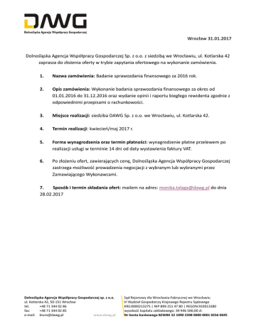 Wrocław 31.01.2017 Dolnośląska Agencja Współpracy Gospodarczej Sp. z o.o. z siedzibą we Wrocławiu, ul. Kotlarska 42 zaprasza do złożenia oferty w trybie zapytania ofertowego na wykonanie zamówienia. 1. Nazwa zamówienia: Badanie sprawozdania finansowego za 2016 rok. 2. Opis zamówienia: Wykonanie badania sprawozdania finansowego za okres od 01.01.2016 do 31.12.2016 oraz wydanie opinii i raportu biegłego rewidenta zgodnie z odpowiednimi przepisami o rachunkowości. 3. Miejsce realizacji: siedziba DAWG Sp. z o.o. we Wrocławiu, ul. Kotlarska 42. 4. Termin realizacji: kwiecień/maj 2017 r. 5. Forma wynagrodzenia oraz termin płatności: wynagrodzenie płatne przelewem po realizacji usługi w terminie 14 dni od daty wystawienia faktury VAT. 6. Po złożeniu ofert, zawierających cenę, Dolnośląska Agencja Współpracy Gospodarczej zastrzega możliwość prowadzenia negocjacji z wybranym lub wybranymi przez Zamawiającego Wykonawcami. 7. Sposób i termin składania ofert: mailem na adres: [email protected] do dnia 28.02.2017 Dolnośląska Agencja Współpracy Gospodarczej sp. z o.o. ul. Kotlarska 42, 50-151 Wrocław tel. +48 71 344 02 86 fax: +48 71 344 02 85 e-mail: [email protected] www.dawg.pl Sąd Rejonowy dla Wrocławia-Fabrycznej we Wrocławiu VI Wydział Gospodarczy Krajowego Rejestru Sądowego KRS:0000213275 | NIP:899 251 47 80 | REGON:933013380 wysokość kapitału zakładowego: 39 946 500,00 zł. Nr konta bankowego BZWBK 32 1090 2398 0000 0001 0256 0695