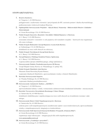 STOWARZYSZENIA: 1. Bractwo Kurkowe; ul. Targowa 1, 63-900 Rawicz; pielęgnowanie i zachowanie wierności i przywiązania do RP, szerzenie postaw i ducha obywatelskiego, podtrzymywanie wiekowych tradycji Bractwa; 2. Ogólnopolskie Stowarzyszenie Więźniów – Byłych Dzieci, Niemowląt – Hitlerowskich Obozów i Zakładów Eksterminacji; ul. Grota Roweckiego 11b, 63-900 Rawicz; 3. Polski Związek Emerytów, Rencistów i Inwalidów Oddział Rejonowy w Rawiczu; ul. I. Buszy 5, 63-900 Rawicz; zrzeszanie emerytów i rencistów w celu poprawy ich warunków socjalno – bytowych oraz organizacja ich czasu wolnego; 4. Polski Związek Diabetyków Zarząd Rejonowy Leszno Koło Rawicz; ul. Sobieskiego 1/9, 63-900 Rawicz; działalność na rzecz osób chorych na cukrzycę; 5. Polski Związek Niewidomych Zarząd Koła Rawicz; ul. I. Buszy 5 63-900 Rawicz; 6. Zarząd Rejonowy Polskiego Komitetu Pomocy Społecznej; ul. I. Buszy 5 63-900 Rawicz; wypożyczalnia sprzętu rehabilitacyjnego, usługi opiekuńcze; 7. Stowarzyszenie Polaków Poszkodowanych przez III Rzeszę; Urząd Miejski Gminy Rawicz ul. Piłsudskiego 21 pokój 102; 8. Polski Związek Filatelistów koło Rawicz; Muzeum Ziemi Rawickiej Rynek Ratusz; wspieranie lokalnych filatelistów, upowszechnianie wiedzy o historii filatelistyki; 9. Rawickie Stowarzyszenie Kupców; ul. Wojska Polskiego 26, 63-900 Rawicz; wspieranie lokalnej przedsiębiorczości; 10. Stowarzyszenie Animatorów Kultury „AKiMRA”; ul. Targowa 1, 63-900 Rawicz; upowszechnianie kultury i sztuki, wzmacnianie zainteresowania działaniami kulturalno - artystycznymi; 11. Rawickie Towarzystwo Stwardnienia Rozsianego i Udaru Mózgu; ul. Sarnowska 9a, 63-900 Rawicz; działalność rehabilitacyjna i uspołeczniająca na rzecz osób chorych na stwardnienie rozsiane i udar mózgu; 12. Stowarzyszenie Dzieci i Osób Niepełnosprawnych w Rawiczu; ul. Sarnowska 9a, 63-900 Rawicz; ochrona praw osób niepełnosprawnych, kształtowanie opinii i ocen środowiskowych, upowszechnianie wiedzy o niepełnosprawnych, integracja ze środowiskiem; 13. Stowarzyszenie Osób Sprawnych Inaczej Ich Rodzin i Przyjaciół „Pomocna Dłoń”; ul. Grota Roweckiego 6 63-900 Rawicz; organizacja zajęć rekreacyjno – integracyjnych dla osób niepełnosprawnych; www.pomocnadlon.rawicz.pl 14. Stowarzyszenie „Z nadzieją w przyszłość”; ul. Grota Roweckiego 9, 63-900 Rawicz; działalność na rzecz wyrównywania szans osób niepełnosprawnych, tworzenie warunków przestrzegania wobec nich praw człowieka, prowadzenie ich ku aktywnemu uczestnictwu w życiu społecznym; 15. Stowarzyszenie „Zgoda na trzeźwość”; ul. Mikołajewicza 12, 63-900 Rawicz; prowadzenie dział. aktywizującej osoby uzależnione od alkoholu; 16. Związek Kombatantów RP i Byłych Więźniów Politycznych; ul. Marszałka Józefa Piłsudskiego 21, 63-900 Rawicz; 17. Towarzystwo Przyjaciół Rawicza; Rawicka Biblioteka Publiczna, ul. Targowa 1, 63-900 Rawicz; popularyzacja wiedzy o historii Rawicza, wzmacnianie patriotyzmu lokalnego; 18. Związek Inwalidów Wojennych RP (ZBOWiD); ul. Marszałka Józefa Piłsudskiego 21, 63-900 Rawicz; 19. Stowarzyszenie Nauczycieli Edukacji Początkowej; Szkoła Podstawowa w Masłowie, ul. Śląska 58, 63-900 Rawicz; popularyzacja edukacji wczesnoszkolnej i wiedzy o jej nauczaniu, prezentowanie opinii i potrzeb nauczycieli, wymiana doświadczeń; 20. Związek Sybiraków koło Rawicz; ul. Kopernika 2, 63-900 Rawicz; 21. Stowarzyszenie Zespołu Regionalnego „Wisieloki”; Szymanowo 101, 63-900 Rawicz; kultywowanie lokalnej tradycji, ochrona dorobku kulturalnego i artystycznego zespołu i rozwój dorobku kulturalnego wsi polskiej południowo – zachodniej Wielkopolski; 22. Stowarzyszenie Rawicki Klub "Amazonka"; ul. Sarnowska 9a, 63-900 Rawicz; działania na rzecz kobiet chorych na raka piersi zmierzające do ułatwienia im powrotu do normalnego życia w stanie sprawności fizycznej i psychicznej; 23. Bank Żywności przy parafii p.w. Chrystusa Króla i NMP; ul. Wyszyńskiego 10, 63-900 Rawicz; udzielanie pomocy żywnościowej i rzeczowej dla rodzin i osób ubogich lub znajdujących się w trudnej sytuacji życiowej; 24. Polski Związek Hodowców Gołębi Pocztowych o/Rawicz sekcja Rawicz; Sierakowo ul. Wzgórze 12, 63-900 Rawicz; zrzeszanie osób interesujących się hodowlą gołębi pocztowych, racjonalny rozwój hodowli gołębi pocztowych; 25. Związek Harcerstwa Polskiego Chorągiew Wielkopolska Hufiec Rawicz; ul. Przyjemskiego 35; 63-900 Rawicz; www.rawicz.zhp.wlkp.pl stwarzanie warunków do wszechstronnego rozwoju człowieka, nieskrępowane kształtowanie osobowości człowieka odpowiedzialnego, upowszechnianie i umacnianie w społeczeństwie przywiązania do wartości: wolności, prawdy, sprawiedliwości, demokracji, samorządności, równouprawnienia, tolerancji i przyjaźni, stwarzanie warunków do nawiązywania i utrwalania silnych więzi międzyludzkich, upowszechnianie wiedzy o świecie przyrody. 26. Stowarzyszenie Rawicki Uniwersytet Trzeciego Wieku ul. Wały Jarosława Dąbrowskiego 29a, 63-900 Rawicz; www.rutw.eu, [email protected] organizacja pożytku publicznego, której cele statutowe to: stymulowanie rozwoju osobistego oraz sprawności intelektualnej i fizycznej, aktywizacja społeczna, upowszechnianie profilaktyki gerontologicznej 27. Związek Ochotniczych Straży Pożarnych RP Zarząd Oddziału Miejsko - Gminnego w Rawiczu ul. Scherwentkego 13, 63-900 Rawicz; działania na rzecz ochrony życia, zdrowia, mienia i środowiska przed pożarami, klęskami żywiołowymi, zagrożeniami ekologicznymi lub innymi miejscowymi zagrożeniami. 28. Zarząd Rejonowy PCK w Rawiczu; ul. Buszy 5, 63-900 Rawicz; pomoc humanitarna, pomoc w przypadkach kataklizmów żywiołowych, pomoc osobom w trudnej sytuacji życiowej; 29. Rawickie Koło Związku Żołnierzy Wojska Polskiego 63-900 Rawicz, ul. Gen. Grota Roweckiego 2a/20, integracja środowiska byłych i obecnych żołnierzy Wojska Polskiego