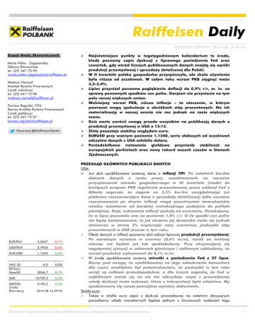 BIULETYN DZIENNY, 2016-08-16 09:06 Zespół Analiz Ekonomicznych: Marta Petka - Zagajewska. Główny Ekonomista tel. (22) 347 75 95 [email protected] Mateusz Namysł Analityk Rynków Finansowych (rynek walutowy) tel. (22) 347 75 96 [email protected] Tomasz Regulski, CFA Starszy Analityk Rynków Finansowych (rynek giełdowy) tel. (22) 347 75 97 [email protected] EUR/PLN 4,2647 -0,1% USD/PLN 3,7934 -0,6% EUR/USD 1,1242 0,5% 0,0 0,0% 3046,7 0,1% 10739,2 0,2% 2190,2 0,3% WIG 20 DJ Euro Stoxx50 DAX S&P500 Źródło: Bloomberg 2016-08-16 09:04 Najistotniejsze punkty w tegotygodniowym kalendarium to środa, kiedy poznamy zapis dyskusji z lipcowego posiedzenia Fed oraz czwartek, gdy wśród licznych publikowanych danych znajdą się wyniki produkcji przemysłowej i sprzedaży detalicznej dla Polski. W II kwartale polska gospodarka przyspieszyła, ale skala ożywienia była niższa od oczekiwań. W całym roku wzrost PKB sięgnąć może 3,3-3,4%. Lipiec przyniósł ponowne pogłębienie deflacji do 0,9% r/r, m. in. za sprawą ponownych spadków cen paliw. Sierpień nie przyniesie na tym polu raczej większych zmian. Wolniejszy wzrost PKB, niższa inflacja – to otoczenie, w którym powracać mogą spekulacje o obniżkach stóp procentowych. Na ich materializację w naszej ocenie nie ma jednak na razie większych szans. Dziś warto zwrócić uwagę przede wszystkim na publikację danych o produkcji przemysłowej w USA o 15:15. Złoty pozostaje stabilny względem euro. EURUSD przy ważnym poziomie 1,1240, seria słabszych od oczekiwań odczytów danych z USA osłabiła dolara. Poniedziałkowe notowanie giełdowe przyniosły stabilność ne europejskich parkietach oraz nowy rekord wszech czasów w Stanach Zjednoczonych. PRZEGŁĄD GŁÓWNYCH PUBLIKACJI DANYCH USA: Już dziś opublikowane zostaną dane o inflacji CPI. Po ostatnich bardzo dobrych danych z rynku pracy, oczekiwaniach na wyraźne przyspieszenie wzrostu gospodarczego w III kwartale (model do bieżących prognoz PKB regularnie prezentowany przez oddział Fed z Atlanty sugeruje, że sięgnie on 3,5% kw/kw uwzględniając już piątkowe rozczarowujące dane o sprzedaży detalicznej) tylko wyraźne rozczarowania po stronie inflacji mogą powstrzymać amerykańskie władze monetarne od bardziej restrykcyjnego podejścia do polityki pieniężnej. Stąd, wskazania inflacji zyskują na znaczeniu. Oczekujemy, że w lipcu pozostała ona na poziomie 1,0% r/r. O ile spadki cen paliw nie będą kontynuowane, to już sierpniu jej dynamika może się jednak skierować w stronę 2% wspierając nasz scenariusz podwyżki stóp procentowych w USA jeszcze w tym roku. Obok danych o inflacji poznamy dziś odczyt lipcowej produkcji przemysłowej. Po wyraźnym wzroście w czerwcu (0,6% m/m), wynik za miniony miesiąc nie będzie już tak spektakularny. Przy utrzymującej się negatywnej sytuacji w sektorach górniczym i naftowym zakładamy, że wzrost produkcji wyhamował do 0,1% m/m. W środę opublikowane zostaną minutki z posiedzenia Fed z 27 lipca. Biorąc pod uwagę, że opublikowany na jego zakończenie komentarz dla części analityków był potwierdzeniem, że podwyżki w tym roku wciąż są całkiem prawdopodobne, a dla innych sugestią, że Fed w najbliższym czasie się na nie nie zdecyduje, zapis z prowadzonej wtedy dyskusji może wskazać, która z interpretacji była właściwa. My spodziewamy się raczej jastrzębiej wymowy dokumentu. Strefa euro Także w strefie euro zapis z dyskusji prowadzonej na ostatnim decyzyjnym posiedzeniu władz monetarnych będzie jednym z kluczowych wydarzeń tego Klauzula ograniczenia odpowiedzialności znajduje się na ostatniej stronie. 1 EUR/PLN 4,2647 -0,1% USD/PLN 3,7934 -0,6% EUR/USD 1,1242 0,5% WIG 20 DJ Euro Stoxx50 DAX S&P500 0,0 0,0% 3046,7 0,1% 10739,2 0,2% 2190,2 0,3% BIULETYN DZIENNY, 16 sierpnia 2016, GODZ 9.10 tygodnia. Minutki z posiedzenia EBC z 21 lipca poznamy w czwartek i mogą zawierać wskazania odnośnie tego czy, oraz ewentualnie jakie modyfikacje w programie nabywania obligacji są brane po uwagę przez władze monetarne. Dziś opublikowany zostanie indeks koniunktury ZEW dla Niemiec i dla strefy euro. W obydwu przypadkach, podobnie jak wcześniej miało to miejsce z indeksem Sentix, oczekujemy wyraźnej poprawy nastrojów w stosunku do poziomów sprzed miesiąca. Polska Jutro poznamy comiesięczne dane z rynku pracy. Oczekujemy dalszego przyspieszenia dynamiki zatrudnienia (do 3,2% r/r). Po dynamicznym wzroście w czerwcu spodziewamy się wyhamowania dynamiki wynagrodzeń do 3,7% r/r. Czwartek przyniesie publikacje najistotniejszych comiesięcznych danych. W centrum uwagi znajdą się wyniki produkcji przemysłowej, które naszym zdaniem wpiszą się w nieco rozczarowującą wymowę danych o PKB za II kwartał wskazując na wyhamowanie produkcji. Nasza prognoza (1,8% r/r) plasuje się wyraźnie poniżej rynkowego konsensusu (+1,3% r/r). Także w przypadku wyników sprzedaży detalicznej jesteśmy mniej optymistyczni od rynkowej mediany. Zakładamy jej wzrost o 3,0% r/r wobec konsensusu na poziomie 4,2% r/r. KOMENTARZ EKONOMICZNY W II kwartale polska gospodarka wzrosła o 3,1% r/r wobec 3,0% r/r. Chociaż więc drugi kwartał przyniósł pewną poprawę koniunktury po odnotowanym na początku roku zaskakująco silnym wyhamowaniu wzrostu (do 3,0% r/r), to jej skala uplasowała się poniżej oczekiwań (nasza prognoza i rynkowy konsensus wskazywały na 3,3% r/r). Nieco lepiej skala tej poprawy wygląda w danych oczyszczonych z wahań sezonowych. Wg nich w samym II kwartale wzrost sięgnął 0,9% kw/kw wobec -0,1% kw/kw kwartał wcześniej oraz 3,0% r/r wobec 2,6% r/r kwartał wcześniej. O tym, która ze składowych PKB stała za słabszymi od założeń wynikami gospodarki możemy na razie jedynie spekulować – dane obrazujące strukturę wzrostu gospodarczego GUS opublikuje dopiero 30 sierpnia. Można jednak podejrzewać, że ponownie achillesową piętą okazać się mogły inwestycje, a