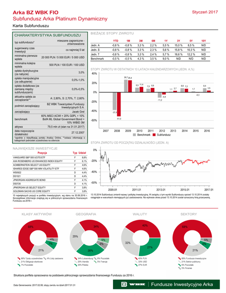 Styczeń 2017 Arka BZ WBK FIO Subfundusz Arka Platinum Dynamiczny Karta Subfunduszu BIEŻĄCE STOPY ZWROTU CHARAKTERYSTYKA SUBFUNDUSZU mieszane zagraniczne zrównoważone typ subfunduszu* sugerowany czas co najmniej 5 lat inwestycji minimalna pierwsza 20 000 PLN / 5 000 EUR / 5 000 USD wpłata minimalna kolejna 500 PLN / 100 EUR / 100 USD wpłata opłata dystrybucyjna 3,0% (za nabycie) opłata manipulacyjna 0,0%-1,0% (za odkupienie) opłata dodatkowa (za 0,0%-0,5% zamianę między subfunduszami) aktualna opłata za A: 2,80%, S: 2,70%, T: 2,60% zarządzanie** BZ WBK Towarzystwo Funduszy podmiot zarządzający Inwestycyjnych S.A. zarządzający Jacek Grel 60% MSCI ACWI + 20% G0PL + 10% benchmark BofA ML Global Government Bond + 10% WIBID 3M aktywa 79,5 mln zł (stan na 31.01.2017) data rozpoczęcia 27.12.2007 działalności *zgodnie z klasyfikacją portalu Analizy Online, **zobacz informację o kategoriach jednostek uczestnictwa na odwrocie YTD 1M 3M 6M 1Y 3Y 5Y 10Y Jedn. A -0,8 % -0,8 % 3,3 % 2,2 % 5,5 % 15,0 % 8,5 % N/D Jedn. S -0,8 % -0,8 % 3,3 % 2,3 % 5,6 % 15,8 % 10,3 % N/D Jedn. T -0,8 % -0,8 % 3,3 % 2,4 % 5,7 % 16,6 % 12,2 % N/D Benchmark -0,5 % -0,5 % 4,3 % 3,5 % 9,0 % N/D N/D N/D STOPY ZWROTU W OSTATNICH 10 LATACH KALENDARZOWYCH (JEDN. A,%) STOPA ZWROTU OD POCZĄTKU DZIAŁALNOŚCI (JEDN. A) NAJWIĘKSZE INWESTYCJE Pozycja Typ Udział VANGUARD S&P 500 UCITS ETF F 8,8% AXA ROSENBERG US ENHANCED INDEX EQUITY F 6,1% ACMBERNSTEIN SELECT US EQUITY F 4,6% ISHARES EDGE S&P 500 MIN VOLATILITY ETF F 4,6% WS0922 D 4,4% DS1021 D 4,4% JPMORGAN AGGREGATE BOND F 4,1% DS0726 D 4,1% JPMORGAN US SELECT EQUITY F 3,8% GOLDMAN SACHS US CORE EQUITY F 3,8% 10 największych pozycji w portfelu inwestycyjnym, wg stanu na 30.06.2016 r. Szczegółowe informacje znajdują się w półrocznym sprawozdaniu finansowym Funduszu za 2016 r. KLASY AKTYWÓW 13.10.2014 Subfundusz zmienił nazwę i politykę inwestycyjną. W związku z tym wyniki Subfunduszu sprzed 13.10.2014 zostały osiągnięte w warunkach niemających już zastosowania. Na wykresie okres przed 13.10.2014 został oznaczony linią przerywaną. GEOGRAFIA WALUTY Struktura portfela opracowana na podstawie półrocznego sprawozdania finansowego Funduszu za 2016 r. Data Generowania: 2017.02.06; stopy zwrotu na dzień:2017.01.31 SEKTORY ZASADY POLITYKI INWESTYCYJNEJ n n n od 40% do 70% aktywów mogą stanowić jednostki lub tytuły uczestnictwa funduszy trzecich, które inwestują głównie w akcje, a także inwestycje bezpośrednie w akcje subfundusz lokuje max.60% aktywów bezpośrednio w instrumenty rynku pieniężnego i dłużne papiery wartościowe denominowane głównie w PLN, emitowane przez Skarb Państwa i przedsiębiorstwa oraz w jednostki lub tytuły uczestnictwa funduszy trzecich, które koncentrują swoje inwestycje na rynku dłużnym subfundusz może inwestować max. 20% aktywów w inne aktywa niż wskazane powyżej ZARZĄDZAJĄCY Jacek Grel ukończył studia na wydziale ekonomicznym Uniwersytetu Opolskiego, specjalność: zarządzanie i organizacja przedsiębiorstw. Dodatkowo uzyskał również dyplom z makroekonomii w ramach Central European University. W latach 2004-2008 zdobywał doświadczenie w bankach inwestycyjnych w Londynie (m.in. Morgan Stanley i Deutsche Bank) oraz w funduszu hedgingowym. W lipcu 2008 r. rozpoczął pracę w firmie na stanowisku analityka. W lipcu 2009 r. objął stanowisko młodszego zarządzającego. W kwietniu 2010 r. objął stanowisko zarządzającego funduszami. Od października 2014 jest kierownikiem ds. alokacji aktywów. Jest posiadaczem prestiżowego tytułu CFA (Chartered Financial Analyst), przyznawanego przez CFA Institute. Proces inwestycyjny w BZWBK TFI opiera się on zarówno na kompetencjach Komitetu Inwestycyjnego jak i zarządzających poszczególnymi subfunduszami. Komitet Inwestycyjny, w skład którego wchodzą wszyscy zarządzający, akceptuje instrumenty finansowe, które mogą znajdować się portfelach subfunduszy oraz podejmuje decyzje kierunkowe dotyczące zarządzanych portfeli. Zarządzający subfunduszami podejmują decyzje inwestycyjne dotyczące docelowych udziałów poszczególnych instrumentów finansowych w portfelu. INFORMACJA O TFI BZ WBK Towarzystwo Funduszy Inwestycyjnych S.A. to jedno z największych i najbardziej doświadczonych TFI działających na polskim rynku. Działamy na rynku od 1998 roku, zarządzając cieszącymi się uznaniem Klientów i ekspertów Funduszami Inwestycyjnymi Arka. Powierzone przez naszych Klientów środki lokujemy, w zależności od wybranego funduszu i subfunduszu, w instrumenty rynku kapitałowego i finansowego: akcje, obligacje, instrumenty pieniężne. Informacje kontaktowe: BZ WBK TFI S.A. www.arka.pl pl. Wolności 16 email: [email protected] 61-739 Poznań tel. 801 123 801 KATEGORIE JEDNOSTEK UCZESTNICTWA W Funduszu Arka BZ WBK FIO istnieją trzy kategorie jednostek uczestnictwa: A, S i T. Poszczególne kategorie jednostek uczestnictwa różnią się między sobą wysokością opłaty za zarządzanie: najniższa opłata naliczana jest w przypadku jednostek kategorii T, najwyższą – kategorii A. W konsekwencji, jednostki poszczególnych kategorii w odpowiednio długim terminie różnią się między sobą rentownością inwestycji (im niższa opłata, tym wyższa stopa zwrotu). Kategoria przyznanych jednostek uczestnictwa zależy od łącznej wartości środków powierzonych przez danego Uczestnika, ustalonej według ceny nabycia, powiększonej o ewentualną bieżącą wpłatę. Jeśli wartość ta: n nie przekracza kwoty 100 000 zł – przyznawane są jednostki kategorii A, n wynosi co najmniej 100 000 zł, lecz nie więcej niż 1 000 000 zł – przyznawane są jednostki kategorii S, n wynosi co najmniej 1 000 000 zł – przyznawane są jednostki kategorii T. OBJAŚNIENIA DOTYCZĄCE POJĘĆ I SKRÓTÓW UŻYTYCH W DOKUMENCIE W kolumnie Typ w tabeli „Największe inwestycje” wskazany jest typ, do jakiego zalicza się dana pozycja; wa