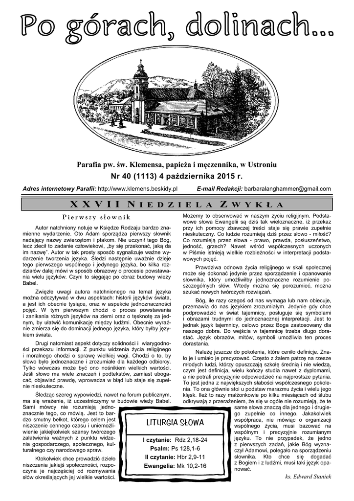 Parafia pw. św. Klemensa, papieża i męczennika, w Ustroniu Nr 40 (1113) 4 października 2015 r. Adres internetowy Parafii: http://www.klemens.beskidy.pl E-mail Redakcji: [email protected] X X V I I N I E D Z I E L A Z W Y K Ł A Pierwszy słownik Autor natchniony notuje w Księdze Rodzaju bardzo znamienne wydarzenie. Oto Adam sporządza pierwszy słownik nadający nazwy zwierzętom i ptakom. Nie uczynił tego Bóg, lecz zlecił to zadanie człowiekowi, „by się przekonać, jaką da im nazwę”. Autor w tak prosty sposób sygnalizuje ważne wydarzenie tworzenia języka. Śledzi następnie uważnie dzieje tego pierwszego wspólnego i jedynego języka, bo kilka rozdziałów dalej mówi w sposób obrazowy o procesie powstawania wielu języków. Czyni to sięgając po obraz budowy wieży Babel. Zwięzłe uwagi autora natchnionego na temat języka można odczytywać w dwu aspektach: historii języków świata, a jest ich obecnie tysiące, oraz w aspekcie jednoznaczności pojęć. W tym pierwszym chodzi o proces powstawania i zanikania różnych języków na ziemi oraz o tęsknotę za jednym, by ułatwić komunikację między ludźmi. Obecnie wyraźnie zmierza się do dominacji jednego języka, który byłby językiem świata. Drugi natomiast aspekt dotyczy solidności i wiarygodności przekazu informacji. Z punktu widzenia życia religijnego i moralnego chodzi o sprawę wielkiej wagi. Chodzi o to, by słowo było jednoznaczne i zrozumiałe dla każdego odbiorcy. Tylko wówczas może być ono nośnikiem wielkich wartości. Jeśli słowo ma wiele znaczeń i podtekstów, zamiast ubogacać, objawiać prawdę, wprowadza w błąd lub staje się zupełnie nieskuteczne. Możemy to obserwować w naszym życiu religijnym. Podstawowe słowa Ewangelii są dziś tak wieloznaczne, iż przekaz przy ich pomocy zbawczej treści staje się prawie zupełnie nieskuteczny. Co ludzie rozumieją dziś przez słowo - miłość? Co rozumieją przez słowa - prawo, prawda, posłuszeństwo, jedność, grzech? Nawet wśród współczesnych uczonych w Piśmie istnieją wielkie rozbieżności w interpretacji podstawowych pojęć. Prawdziwa odnowa życia religijnego w skali społecznej może się dokonać jedynie przez sporządzenie i opanowanie słownika, który umożliwiłby jednoznaczne rozumienie poszczególnych słów. Wtedy można się porozumieć, można szukać nowych twórczych rozwiązań. Bóg, ile razy czegoś od nas wymaga lub nam obiecuje, przemawia do nas językiem zrozumiałym. Jedynie gdy chce podprowadzić w świat tajemnicy, posługuje się symbolami i obrazami trudnymi do jednoznacznej interpretacji. Jest to jednak język tajemnicy, celowo przez Boga zastosowany dla naszego dobra. Do wejścia w tajemnicę trzeba długo dorastać. Język obrazów, mitów, symboli umożliwia ten proces dorastania. Należę jeszcze do pokolenia, które ceniło definicje. Znało je i umiało je precyzować. Często z żalem patrzę na rzesze młodych ludzi, którzy opuszczają szkołę średnią i nie wiedzą, czym jest definicja, wielu kończy studia nawet z dyplomami, a nie potrafi precyzyjnie odpowiedzieć na najprostsze pytania. To jest jedna z największych słabości współczesnego pokolenia. To ona głównie stoi u podstaw marazmu życia i wielu jego Śledząc szereg wypowiedzi, nawet na forum publicznym, klęsk. Ileż to razy małżonkowie po kilku miesiącach od ślubu ma się wrażenie, iż uczestniczymy w budowie wieży Babel. odkrywają z przerażeniem, że się w ogóle nie rozumieją, że te Sami mówcy nie rozumieją jednosame słowa znaczą dla jednego i drugieznacznie tego, co mówią. Jest to bargo zupełnie co innego. Jakakolwiek dzo smutny bełkot, którego celem jest współpraca, nie mówiąc o organizacji LITURGIA SŁOWA niszczenie cennego czasu i uniemożliwspólnego życia, musi bazować na wienie jakiejkolwiek szansy twórczego wspólnym i precyzyjnie rozumianym załatwienia ważnych z punktu widzejęzyku. To nie przypadek, że jedno I czytanie: Rdz 2,18-24 nia gospodarczego, społecznego, kulz pierwszych zadań, jakie Bóg wyznaPsalm: Ps 128,1-6 turalnego czy narodowego spraw. czył Adamowi, polegało na sporządzeniu słownika. Kto chce się dogadać II czytanie: Hbr 2,9-11 Ktokolwiek chce prowadzić dzieło z Bogiem i z ludźmi, musi taki język opaniszczenia jakiejś społeczności, rozpoEwangelia: Mk 10,2-16 nować. czyna je najczęściej od rozmywania określających jej wielkie 4słów października 2015 r. wartości. PO GÓRACH, DOLINACH... ks. Edward Staniek 1 Z ŻYCIA P ARAFI i w OKRESIE 01. 07 2015 - 30. 09. 2015 - Szeląg Radosław Łukasz i Janota Magdalena Joanna; - Łuniew Michał Piotr i Tschuk Martyna Jadwiga; - Sobański Michał Piotr i Marczak Anna Renata; - Prokopiuk Patryk Arkadiusz i Sędera Anna Maria; - Pieńkowski Mariusz Aleksander i Kryska Aleksandra Joanna; - Serwatka Andrzej Adam i Czuba Aurelia Mirela; - Szymura Mariusz Tomasz i Frajfeld Paula Bernadeta; - Gibas Tomasz i Kamińska Teresa Weronika; - Podżorski Rafał Jan i Malinowska Aldona Joanna; - Tomica Iga Zofia; - Kantor Martyna Hanna; - Mazurek Liwia Emilia; - Wojtyła Kinga; - Sokoliński Adam Jakub; - Szeja Oliwia Natalia; - Rozkoszny Olaf Wiktor; - Rozkoszny Oskar Jan; - Dobrzańska Nadzieja; - Urbaniak Ryszard; - Dyszlewski Jerzy; - Zawada Helena; - Kozieł Antoni; - Rauk Zenon; - Chrapek Marta; - Matlińska Marta; - Wądolny Leszek; - Pęcherz Piotr; - Żebrowski Jerzy; - Górniak Gertruda; 4 października 2015 r. Miłosierdzie moje dusze ogarnia (Dzienniczek) W pierwszym czytaniu z księgi Rodzaju, liturgia dwudziestej siódmej niedzieli zwykłej, wprowadza nas w dzieło stworzenia, a bliżej w scenę stworzenia niewiasty, tę, która, jak wyrzekł mężczyzna: „ jest kością z moich kości i ciałem z mego ciała...” Bóg, w swoim nieskończonym miłosierdziu, stworzył mężczyźnie pomoc, aby nie był sam, pomimo, że otaczało go mnóstwo stworzonych „istot żywych”. Zatroszczył się, b