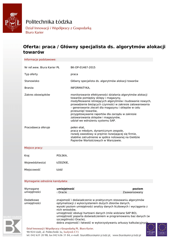 Oferta: praca / Główny specjalista ds. algorytmów alokacji towarów Informacje podstawowe: Nr ref.wew. Biura Karier PŁ BK-OP-01467-2015 Typ oferty praca Stanowisko Główny specjalista ds. algorytmów alokacji towarów Branża INFORMATYKA, Zakres obowiązków monitorowanie efektywności działania algorytmów alokacji towarów pomiędzy sklepy i magazyny, modyfikowanie istniejących algorytmów i budowanie nowych, prowadzenie bieżących czynności w zakresie zatowarowania – generowanie zleceń dla magazynu i sklepów w celu przesunięć towarów, przygotowywanie raportów dla zarządu w zakresie zatowarowania sklepów i magazynów, udział we wdrożeniu systemu SAP. Pracodawca oferuje pełen etat, praca w młodym, dynamicznym zespole, rozwój zawodowy w prężnie rozwijającej się firmie, stabilne zatrudnienie w spółce notowanej na Giełdzie Papierów Wartościowych w Warszawie. Miejsce pracy: Kraj POLSKA, Województwo(a) ŁÓDZKIE, Miejscowość Łódź Wymaganie odnośnie kandydata: Wymagane umiejętności umiejętność - Oracle Dodatkowe umiejętności znajomość i doświadczenie w praktycznym stosowaniu algorytmów optymalizacji z wykorzystaniem dużych zbiorów danych, wysoki poziom umiejętności analizy danych liczbowych i wyciągania z nich wniosków, umiejętność obsługi hurtowni danych (mile widziane SAP BO), umiejętność poparta doświadczeniem w programowaniu baz danych (w szczególności Oracle), dobra znajomość i łatwość w wykorzystywaniu arkuszy kalkulacyjnych, poziom Zaawansowany wskazane jest zainteresowanie zagadnieniami z zakresu programowania, baz danych, narzędzi statystycznych i ekonometrycznych, mile widziana umiejętność programowania w VBA, skrupulatność, dokładność, dociekliwość i wytrwałość, wykształcenie w zakresie ekonometrii, statystyki, informatyki (przetwarzanie danych) lub matematyki, Preferowana forma studiów - II (studia magisterskie stacjonarne dzienne), studia doktoranckie stacjonarne dzienne, II (studia magisterskie niestacjonarne zaoczne), studia doktoranckie niestacjonarne zaoczne, II (studia magisterskie niestacjonarne wieczorowe), studia jednolite magistersko-inżynierskie niestacjonarne wieczorowe, studia doktoranckie niestacjonarne wieczorowe, studia podyplomowe, Preferowane wydziały - KOLEGIUM TOWAROZNASTWA, - WYDZIAŁ ELEKTROTECHNIKI, ELEKTRONIKI, INFORMATYKI I AUTOMATYKI, - WYDZIAŁ FIZYKI TECHNICZNEJ, INFORMATYKI I MATEMATYKI STOSOWANEJ, - WYDZIAŁ MECHANICZNY, Dane kontaktowe: Nazwa firmy/Pracodawcy Kraj Województwo Miasto Top Secret POLSKA ŁÓDZKIE Łódź Sposób aplikacji: Za pośrednictwem portalu ShareHire.pl klikając przycisk aplikuj i załączając swoje CV https://sharehire.pl/offer/3b3c1792 Data umieszczenia: Oferta ważna od 19-05-2015 do 16-06-2018 Politechnika Łódzka, jest wpisana pod numerem 2414 do rejestru podmiotów prowadzących agencje zatrudnienia.