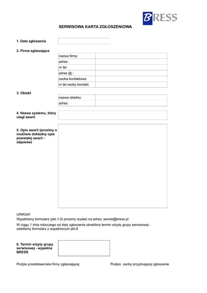 SERWISOWA KARTA ZGŁOSZENIOWA 1. Data zgłoszenia 2. Firma zgłaszająca nazwa firmy: adres: nr tel. adres @ : osoba kontaktowa nr tel osoby kontakt. 3. Obiekt nazwa obiektu: adres: 4. Nazwa systemu, który uległ awarii 5. Opis awarii (prosimy o możliwie dokładny opis powstałej awarii objawów) UWAGA! Wypełniony formularz (pkt.1-5) prosimy wysłać na adres: [email protected] W ciągu 1 dnia roboczego od daty zgłoszenia określimy termin wizyty grupy serwisowej odeślemy formularz z wypełnionym pkt.6 6. Termin wizyty grupy serwisowej - wypełnia BRESS Podpis przedstawiciela firmy zgłaszającej Podpis osoby przyjmującej zgłoszenie