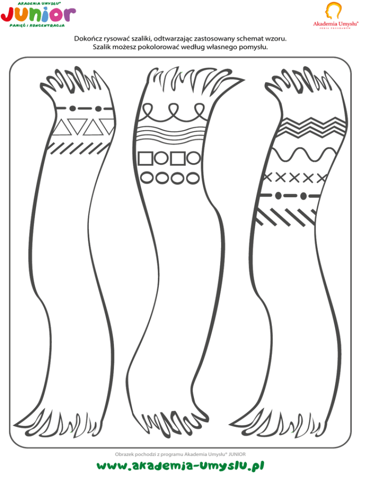 Dokończ rysować szaliki, odtwarzając zastosowany schemat wzoru. Szalik możesz pokolorować według własnego pomysłu. Obrazek pochodzi z programu Akademia Umysłu® JUNIOR