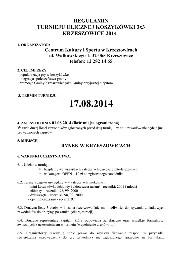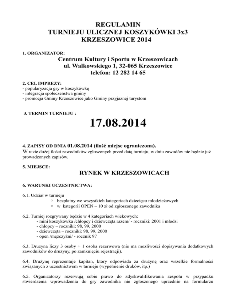 REGULAMIN TURNIEJU ULICZNEJ KOSZYKÓWKI 3x3 KRZESZOWICE 2014 1. ORGANIZATOR: Centrum Kultury i Sportu w Krzeszowicach ul. Walkowskiego 1, 32-065 Krzeszowice telefon: 12 282 14 65 2. CEL IMPREZY: - popularyzacja gry w koszykówkę - integracja społeczeństwa gminy - promocja Gminy Krzeszowice jako Gminy przyjaznej turystom 3. TERMIN TURNIEJU : 17.08.2014 4. ZAPISY OD DNIA 01.08.2014 (ilość miejsc ograniczona). W razie dużej ilości zawodników zgłoszonych przed datą turnieju, w dniu zawodów nie będzie już prowadzonych zapisów. 5. MIEJSCE: RYNEK W KRZESZOWICACH 6. WARUNKI UCZESTNICTWA: 6.1. Udział w turnieju ◦ bezpłatny we wszystkich kategoriach dziecięco młodzieżowych ◦ w kategorii OPEN – 10 zł od zgłoszonego zawodnika 6.2. Turniej rozgrywany będzie w 4 kategoriach wiekowych: - mini koszykówka /chłopcy i dziewczęta razem/ - roczniki: 2001 i młodsi - chłopcy – roczniki: 98, 99, 2000 - dziewczęta – roczniki: 98, 99, 2000 - open /mężczyźni/ - rocznik 97 6.3. Drużyna liczy 3 osoby + 1 osoba rezerwowa (nie ma możliwości dopisywania dodatkowych zawodników do drużyny, po zamknięciu rejestracji). 6.4. Drużynę reprezentuje kapitan, który odpowiada za drużynę oraz wszelkie formalności związanych z uczestnictwem w turnieju (wypełnienie druków, itp.) 6.5. Organizatorzy rezerwują sobie prawo do zdyskwalifikowania zespołu w przypadku stwierdzenia wprowadzenia do gry zawodnika nie zgłoszonego uprzednio na formularzu zgłoszeniowym, bądź podania przez kapitana zespołu danych niezgodnych z prawdą. Tylko gracze zgłoszeni w formularzu są upoważnieni do gry. 7. SYSTEM ROZGRYWEK 7.1 Rozgrywki prowadzone są w czterech kategoriach: - mini koszykówka / chłopcy i dziewczęta razem/ - roczniki: 2001 i młodsi - chłopcy- roczniki: 98, 99, 2000 (junior) - dziewczęta – roczniki: 98, 99, 2000 (junior) - open /mężczyźni/ - rocznik 97 Według harmonogramu: 9.30 – 10.00 - zgłoszenia drużyn w kategoriach mini i junior (dokonuje kapitan) 10.00 – 12.00 - rozgrywki grup mini i junior 12.00 – 12.45 - zgłoszenia drużyn w kategoriach open (dokonuje kapitan) 12.00 – 13.00 - konkursy oraz występy artystyczne 13.00 – 16.00 - rozgrywki open 7.2. Eliminacje – system grupowy: • o podziale drużyn na grupy zdecyduje losowanie; • o kolejności miejsc w grupach decyduje: - większa ilość zwycięskich meczów - wynik bezpośredniego meczu - korzystniejsza różnica punktów 7.3. Finały – system pucharowy (w zależności od ilości zgłoszeń) 8. ZASADY GRY: 8.1. Mecze koszykówki 3x3 rozgrywane są na boiskach o wymiarach od 9x9 do 12x12 m, na jeden kosz. Na boisku zaznaczona jest linia przerywana w odległości 6,75 m. 8.2. Każda gra musi rozpocząć się udziałem dwóch trzyosobowych drużyn składających się z graczy uprzednio zgłoszonych do turnieju, a zakończyć, posiadając w składzie co najmniej 2 zawodników. 8.3. O tym, która drużyna będzie w posiadaniu piłki jako pierwsza, decyduje losowanie. 8.4. Każdy uzyskany kosz to 1 punkt. Za kosz uzyskany z dystansu (zza linii od kosza 6,75m tzw. linii dystansowej) zalicza się 2 punkty. Graczowi niewolno w trakcie rzutu dotknąć tej linii. 8.5. Gra toczy się do zdobycia przez jedną z drużyn 11 punktów lub przez 10 minut ciągłej gry. 8.6. W przypadku zakończenia 10 minutowego czasu gry i nie uzyskania przez którąś z drużyn 11 punktów, mecz jest przerywany i zapisywany jest wynik uzyskany przez drużyny w czasie 10 minut. 8.7. W przypadku, gdy po 10 minutach gry wynik jest remisowy, zarządzana jest dogrywka – „Złoty kosz”, czyli gra się do zdobycia przez którąkolwiek z drużyn jednego kosza. Grę rozpoczyna się od rzutu sędziowskiego. 8.8. Zabronione jest dobijanie piłki po rzucie drużyny przeciwnej. Dobitka po rzucie własnej drużyny jest dozwolona. 8.9. Każdej drużynie przysługuje do wykorzystania jeden 30-sekundowy czas w trakcie meczu. 8.10. Mecz sędziuje sędzia wyznaczony przez organizatora. 8.11. Należy dążyć do polubownego załatwiania wszelkich sporów w imię przyjacielskiej i serdecznej atmosfery zawodów. Sędzia ma werdykt ostateczny. 8.12. Złośliwe faule, zauważone przez sędziego gry, będą karane rzutem za 1 punkt z linii 5 m oraz przekazaniem piłki po rzucie drużynie pokrzywdzonej. 8.13. Brutalność w grze lub złe zachowanie całej drużyny podczas turnieju może doprowadzić do wykluczenia jej z rywalizacji. 8.14. Limit fauli na drużynie – 4, przy piątym i kolejnych faulach - rzut wolny. 8.15. Przepisy gry obowiązują wg. przepisów PZKOSZ chyba, że organizator zastrzega to w regulaminie. 9. NAGRODY: 9.1 Dla trzech pierwszych drużyn w poszczególnych kategoriach wiekowych: medale, dyplomy, nagrody finansowe lub rzeczowe. 9.2. W konkursach indywidualnych: statuetka dla najlepszego zawodnika/zawodniczki, nagroda rzeczowa. 10. POSTANOWIENIA OGÓLNE: 10.1. Zawodnicy odpowiadają materialnie za szkody wyrządzone w wyniku użytkowania koszy do gry niezgodnie z regulaminem. 10.2. Organizatorzy turnieju nie biorą odpowiedzialności za wszelkie urazy i kontuzje zawodników powstałe w trakcie turnieju. 10.3. Organizatorzy zastrzegają sobie prawo do zmiany regulaminu. W przypadku istotnych zmian zobowiązują się do powiadomienia zawodników o zmianach w regulaminie. 10.4. Uczestnicy zawodów przystępujący do rozgrywek zapoznali się z regulaminem i akceptują jego założenia. 10.5. Za rzeczy pozostawione bez opieki organizator nie odpowiada. 10.6. Organizator zapewnia: sprzęt sportowy, opiekę medyczną.