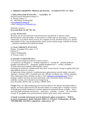 V MIĘDZYNARODOWY PRZEGLĄD SZTUKI - ALTERNATYWY 33 / 2016 1. ORGANIZATOR WYSTAWY - GALERIA 33 Stowarzyszenie Niezależna Galeria 33 ul. Wiosny Ludów 17 63 - 400 Ostrów Wielkopolski www.galeria33-ostrow.pl e-mail: [email protected] Komisarz wystawy: Krzysztof Ryfa, tel. 667 781 126 2. CEL WYSTAWY Wystawa ma na celu pokazanie różnych obszarów poszukiwań w zakresie sztuki. Różnorodności, która powoduje, że obcowanie ze sztuką staje się ekscytujące i świadome . Zapraszamy wszystkich, którzy tworzą, bez względu na wiek, dorobek artystyczny, sposób postrzegania świata i jego przedstawiania, formę wyrazu artystycznego, technikę tworzenia, …jedynym warunkiem jest miłość do Sztuki. 3. CZAS I MIEJSCE WYSTAWY Sobota, 10 grudnia 2016, godz. 17.33 Galeria 33 Ostrów Wielkopolski ul. Wiosny Ludów 17 4. ZASADY UCZESTNICTWA 1) W wystawie mogą uczestniczyć wszyscy artyści . 2) Ustanawia się kategorie: I – techniki malarskie II – rysunek III – techniki graficzne (grafika warsztatowa) IV – fotografia i grafika komputerowa V – rzeźba i ceramika 3) Jeden autor może nadesłać maksymalnie 3 prace. Zastrzega się możliwość zredukowania ilości prac wystawionych z uwagi na ogólną ilość prac zakwalifikowanych do wystawy. 4) Zgłoszenie winno zawierać: wypełnioną kartę zgłoszeniową, dowód wpłaty oraz prace zapisane w formacie JPG o rozdzielczości min. 300 dpi i wielkości min. 1500 px (mniejszy bok). Zgłoszenia należy nadesłać na adres e-mail: [email protected]. Nazwa każdego z plików powinna zawierać informacje: imię i nazwisko artysty, tytuł pracy, technika, wymiar, rok wykonania oraz kategoria np. Ewa_Kowalska_BUSZ_olej_na_plotnie_100x80_2016 Uwaga! Prace nie odpowiadającego powyższemu opisowi, nie opisane lub nieprawidłowo opisane, bez karty zgłoszeniowej lub dowodu wpłaty nie zostaną ujęte w katalogu wystawy. 5) Każdą pracę należy dostarczyć czytelnie opisaną na odwrotnej stronie, podając: - imię i nazwisko bądź pseudonim artystyczny, - tytuł pracy, - technikę, - wymiar, - rok wykonania. Uwaga! W przypadku form przestrzennych miejsce opisu może zostać zmienione. 6) Każdy uczestnik zobowiązany jest do dokonania opłaty uczestnictwa – 70,00 zł na konto organizatora: Bank Zachodni WBK S.A. O/Ostrów Wielkopolski., 28 1090 2590 0000 0001 2210 8622 z dopiskiem „Alternatywy 33”. 7) Wszyscy autorzy, którzy nadeślą prace spełniające warunki regulaminu otrzymają katalog wystawy oraz zwrot przekazanych prac po zamknięciu wystawy. 8) Organizatorzy zastrzegają sobie prawo do bezpłatnego publikowania nadesłanych prac w mediach do celów promocji wystawy, co zostaje potwierdzone przez uczestnika własnoręcznym podpisem w karcie zgłoszeniowej. 9) Za ewentualne uszkodzenia powstałe w wyniku transportu organizator nie ponosi odpowiedzialności. 5. TERMINY Prace zatwierdzone do wystawy należy przesłać w usztywnionych, podpisanych opakowaniach lub dostarczyć osobiście do siedziby Organizatora. Nadsyłanie zgłoszeń drogą mailową wraz z potwierdzeniem wpłaty oraz plikami prac, przygotowanymi zgodnie z pkt. 4.4. do 10 listopada 2016r. Nadsyłanie oryginałów prac wraz z podpisanym oryginałem zgłoszenia do 25 listopada 2016r. Wernisaż – 10 grudnia 2016r. godz. 17.33. Ekspozycja prac od 10 grudnia 2016r. do 29 stycznia 2017r. Zwrot prac od 29 stycznia 2017r. Nadesłanie prac na wystawę „Alternatywy 33” jest równoznaczne z uznaniem warunków niniejszego Regulaminu oraz akceptacją na publikowanie danych osobowych. 6. POSTANOWIENIA KOŃCOWE Prace przygotowane na wystawę prosimy nadsyłać na adres: Stowarzyszenie Niezależna Galeria 33, ul. Wiosny Ludów 17, 63 - 400 Ostrów Wielkopolski, z dopiskiem: „ALTERNATYWY 33” Lub dostarczać osobiście do siedziby Galerii 33, wtorek i piątek od 16.00 – 18.00, sobota niedziela 11.00 – 14.00. Tel. Kontaktowy: Krzysztof Ryfa - 667 781 126 Przesłane prace należy zabezpieczyć przed uszkodzeniem. Odsyłanie prac po wystawie odbywać się będzie na koszt autora pracy, po uprzednim uzgodnieniu wysyłki z kuratorem wystawy.