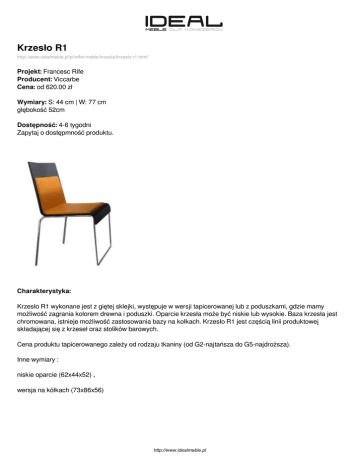 Krzesło R1 http://www.idealmeble.pl/pl/offer/meble/krzesla/krzeslo-r1.html/ Projekt: Francesc Rife Producent: Viccarbe Cena: od 620.00 zł Wymiary: S: 44 cm | W: 77 cm głębokość 52cm Dostępność: 4-6 tygodni Zapytaj o dostępmność produktu. Charakterystyka: Krzesło R1 wykonane jest z giętej sklejki, występuje w wersji tapicerowanej lub z poduszkami, gdzie mamy możliwość zagrania kolorem drewna i poduszki. Oparcie krzesła może być niskie lub wysokie. Baza krzesła jest chromowana, istnieje możliwość zastosowania bazy na kołkach. Krzesło R1 jest częścią linii produktowej składającej się z krzeseł oraz stolików barowych. Cena produktu tapicerowanego zależy od rodzaju tkaniny (od G2-najtańsza do G5-najdroższa). Inne wymiary : niskie oparcie (62x44x52) , wersja na kółkach (73x86x56) http://www.idealmeble.pl Dostępne wersje produktu: nazwa produktu Krzesło R1 Krzesło R1 Krzesło R1 warianty cena baza na kółkach 620.00zł fornir, niskie oparcie 1099.00zł fornir, wysokie oparcie1099.00zł dostępne Na zamówienie Dostępny Na zamówienie Krzesło R1 lakierowane, niskie oparcie lakierowane, wysokie oparcie tapicerowane, niskie oparcie tapicerowane, wysokie oparcie 1175.00zł Na zamówienie 1175.00zł Na zamówienie 1321.00zł Na zamówienie 1321.00zł Na zamówienie Krzesło R1 Krzesło R1 Krzesło R1 http://www.idealmeble.pl Zdjęcia produktu: http://www.idealmeble.pl Powered by TCPDF (www.tcpdf.org)