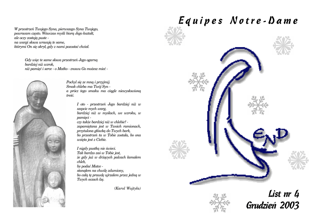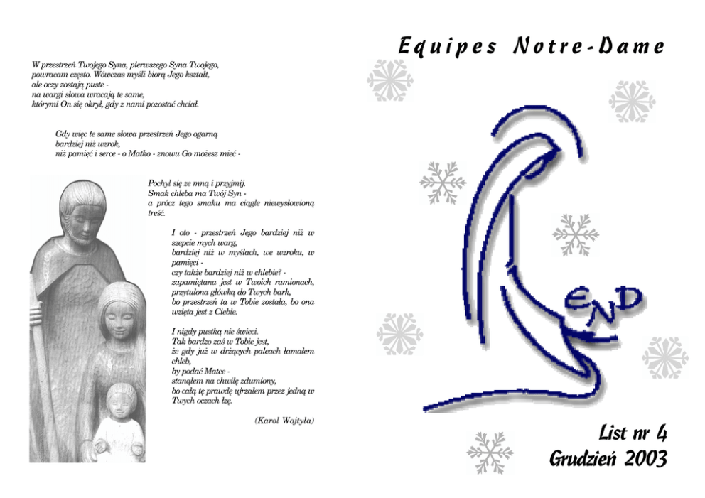 Equipes Notre-Dame List nr 4 - Grudzień 2003 Equipes Notre-Dame W przestrzeń Twojego Syna, pierwszego Syna Twojego, powracam często. Wówczas myśli biorą Jego kształt, ale oczy zostają puste na wargi słowa wracają te same, którymi On się okrył, gdy z nami pozostać chciał. Gdy więc te same słowa przestrzeń Jego ogarną bardziej niż wzrok, niż pamięć i serce - o Matko - znowu Go możesz mieć - Pochyl się ze mną i przyjmij. Smak chleba ma Twój Syn a prócz tego smaku ma ciągle niewysłowioną treść. I oto - przestrzeń Jego bardziej niż w szepcie mych warg, bardziej niż w myślach, we wzroku, w pamięci czy także bardziej niż w chlebie? zapamiętana jest w Twoich ramionach, przytulona główką do Twych bark, bo przestrzeń ta w Tobie została, bo ona wzięta jest z Ciebie. I nigdy pustką nie świeci. Tak bardzo zaś w Tobie jest, że gdy już w drżących palcach łamałem chleb, by podać Matce stanąłem na chwilę zdumiony, bo całą tę prawdę ujrzałem przez jedną w Twych oczach łzę. (Karol Wojtyła) 24 List nr 4 Grudzień 2003 1 Equipes Notre-Dame List nr 4 - Grudzień 2003 Spis treści Słowo Pary Odpowiedzialnej Sektora 3 Zostawili wszystko i ... (F.Fleischmann) SESJE I REKOLEKCJE W ROKU 2004 5 Reguła życia (H.Caffarel) 7 Zostawili wszystko i ... (J.E.Cogavin) 8 Małżeństwo to dawanie się sobie nawzajem 12 Starajcie się umocnić wasze powołanie 14 *** 16 Dziedzictwo H.Caffarela 18 Żyjąc dla Chrystusa 09 - 11.01.2004 - Kazimierz Biskupi Sesja dla Par Pilotujących 20 - 22.02.2004 - Zamek Bierzgłowski Reguła życia 26 - 28.02.2004 - Popowo k/Warszawy Kapłan - Doradca duchowy 19 - 21.03.2004 - Kluczbork Miłość małżeńska obrazem miłości Bożej 23 Wypłyń na głębię 24 Mając życie od Ducha ... 25 Duchowość małżeńska 26 Plan rekolekcji 2004 27 19 - 21.03.2004 - Zamek Bierzgłowski Szkoła Modlitwy 17 - 24.07.2004 - Kluczbork (*) Życie małżeńskie uczynić Eucharystią 17 - 23.07.2004 - Zaborówiec (*) Mężczyzną i niewiastą stworzył ich [z o.Karolem Meissnerem] 07 - 14.08.2004 - Zamek Bierzgłowski (*) (temat w opracowaniu) Strona internetowa Equipes Notre-Dame Polska: www.end.win.pl e-mail Pary Odpowiedzialnej: [email protected] Redakcja Listu - Urszula i Janusz Sklepowicz: [email protected] 14 - 24. 08.2004 - Krzeszów (*) Osiem błogosławieństw 21 - 27.08.2004 - Zaborówiec Rekolekcje dla młodzieży z o. Karolem Meissnerem List jest pismem do użytku wewnętrznego Equipes Notre-Dame Polska Wszelkie prawa zastrzeżone. Materiały tłumaczone z j. francuskiego wykorzystane za zgodą ERI END. 2 23 Equipes Notre-Dame List nr 4 - Grudzień 2003 do niej Bogu - odpowiada, Bogu, który się ofiarował - oddaje się. Między Bogiem i duszą zawiązuje się żywy dialog, komunia, do której dąży wszelka miłość. I powoli całe życie tego, kto się modli i właśnie dzięki temu, że się modli, staje się modlitwą.” (s. 128-130) Żyjąc dla Chrystusa, w Chrystusie i przez Chrystusa. Dzięki łasce Chrztu świętego jesteś cząstką Mistycznego Ciała Chrystusa, którym jest Kościół. Nie zapominaj: Chrystus jest Głową Kościoła. Chrystus jest także twoją Głową. Ty zaś jesteś razem z Kościołem cząstką Jego Ciała. Na tym polega życie w Chrystusie, z Chrystusem i dla Chrystusa, który jest twoim i wszystkich Zbawicielem. Jeśli miłość największa w prostocie, a pragnienie najprostsze w tęsknocie, więc nie dziw, że pragnął Bóg aby najprostsi Go przyjęli, ci, którzy dusze mają z bieli, a dla miłości swej nie znają słów. Sam, gdy nas umiłował, prostotą nas oczarował, biedą, biedą, i siankiem Wtedy Matka Dziecinę brała, na rękach Go kołysała i otulała Mu stopy w sukmankę. ( Karol Wojtyła ) On, cierpiąc w ludzkim ciele, cierpienia grzechu człowieka wziął na siebie. Stanowiąc jedno ciało z całą naturą ludzką, jakby nadal cierpi w swoim Ciele, którym jest Kościół. Cierpi w tobie. Cierpi w Twoich braciach i siostrach. Całe Jego Ciało cierpi. Nie możesz o tym nie wiedzieć czy zapominać. Stanowisz jedno z Chrystusem. Oznacza to, że jesteś razem z Nim powołany do współzbawiania i podobnie jak Chrystus nie możesz nie wiedzieć o udrękach Ciała Kościoła. Wszak jesteś Jego cząstką. Nie wszyscy stanowiący Mistyczne Ciało Chrystusa zdają sobie sprawę z dokonanego zbawienia oraz z tego, że ich zbawienie nieustannie się dokonuje. Nie wszyscy wiedzą, że mogą swym cierpieniem, którego nikomu nie brakuje dopomóc w zbawieniu braci, że mogą wespół cierpieć z Chrystusem i tak przyczyniać się do zbawienia świata. Mając świadomość naszego powołania do życia w jedności z Chrystusem, wspomagani przez miłość Ducha Świętego powinniśmy bardziej świadomie niż inni żyć i cierpieć dla Chrystusa i Jego Ciała. /Dominik Wider OCD "Zapatrzeni w Chrystusa"/ 22 PARA ODPOWIEDZIALNA SEKTORA Małgorzata i Joachim GRZONKOWIE _______________________________ Kochani Przyjaciele pary małżeńskie i doradcy duchowi END Za nami kolejna rocznica ogłoszenia Karty END. Dzień ten, który jest uczczeniem "chrztu" naszego Ruchu, przeżywaliśmy w duchu wierności i wdzięczności. Każdy chrzest jest okazją do radości z faktu, że delikatne stworzenie będzie stopniowo wzrastać ku temu, do czego zostało powołane. Tak jest i z naszym Ruchem, który nigdy nie zatrzymał się na swej drodze ku dojrzałości, ku osiągnięciu głębszego zrozumienia swego pierwotnego charyzmatu oraz dostosowania się do wielorakich uwarunkowań, celem wyjścia naprzeciw potrzebom i inspiracjom małżeństw dążących do realizacji, dzień po dniu, duchowości małżeńskiej. W duchu wolności podjęliśmy decyzję takiej drogi naszego życia. Ta decyzja zobowiązuje nas w sumieniu do odpowiedzialności: za poznanie charyzmatu tego Ruchu, za poznanie jego celu i metod a także do podjęcia 3 Equipes Notre-Dame przemiany naszego życia, aby pokazać światu wielko