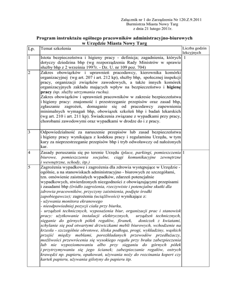 Załącznik nr 1 do Zarządzenia Nr 120.Z.9.2011 Burmistrza Miasta Nowy Targ z dnia 21 lutego 2011r. Program instruktażu ogólnego pracowników administracyjno-biurowych w Urzędzie Miasta Nowy Targ Liczba godzin lekcyjnych Lp. Temat szkolenia 1 Istota bezpieczeństwa i higieny pracy - definicja; zagadnienia, których 1 dotyczy dziedzina bhp (wg rozporządzenia Rady Ministrów w sprawie służby bhp z 2 września 1997r. - Dz. U. nr 109 poz. 704) Zakres obowiązków i uprawnień pracodawcy, kierownika komórki organizacyjnej (wg art. 207 i art. 212 kp), służby bhp, społecznej inspekcji pracy, organizacji związków zawodowych, a także innych komórek organizacyjnych zakładu mających wpływ na bezpieczeństwo i higienę pracy (np. służby utrzymania ruchu). Zakres obowiązków i uprawnień pracowników w zakresie bezpieczeństwa i higieny pracy: znajomość i przestrzeganie przepisów oraz zasad bhp, zgłaszanie zagrożeń, domaganie się od pracodawcy zapewnienia minimalnych wymagań bhp, obowiązek szkoleń bhp i badań lekarskich (wg art. 210 i art. 211 kp). Świadczenia związane z wypadkami przy pracy, chorobami zawodowymi oraz wypadkami w drodze do i z pracy. 2 3 4 5 Odpowiedzialność za naruszenie przepisów lub zasad bezpieczeństwa i higieny pracy wynikająca z kodeksu pracy i regulaminu Urzędu, w tym kary za nieprzestrzeganie przepisów bhp i tryb odwoławczy od nałożonych kar. Zasady poruszania się po terenie Urzędu (place, parkingi, pomieszczenia 1 biurowe, pomieszczenia socjalne, ciągi komunikacyjne zewnętrzne i wewnętrzne, schody, itp.) Zagrożenia wypadkowe i zagrożenia dla zdrowia występujące w Urzędzie ogólnie, a na stanowiskach administracyjno - biurowych ze szczegółami, tzn. omówienie zaistniałych wypadków, zdarzeń potencjalnie wypadkowych, stwierdzonych niezgodności z obowiązującymi przepisami i zasadami bhp (źródło zagrożenia, rzeczywiste i potencjalne skutki dla zdrowia pracowników, przyczyny zaistnienia, podjęte środki zapobiegawcze); zagrożenia (uciążliwości) wynikające z: - używania monitora ekranowego - nieodpowiedniej pozycji ciała przy biurku, - urządzeń technicznych, wyposażenia biur, organizacji prac i stanowisk pracy: użytkowanie instalacji elektrycznych, urządzeń technicznych, sięganie do górnych półek regałów, firanek, doniczek z kwiatami, schylanie się pod otwartymi drzwiczkami mebli biurowych, wchodzenie na krzesła - szczególnie obrotowe, śliska podłoga, progi, wykładziny, wąskich przejść między meblami, porozkładanych przewodów przedłużaczy, możliwości przewrócenia się wysokiego regału przy braku zabezpieczenia lub nie wypoziomowaniu albo przy sięganiu do górnych półek i przytrzymywaniu się jego ścianek; zabezpieczanie regałów, ostrych krawędzi np. papieru, opakowań, używania noży do rozcinania kopert czy kartek papieru, używania gilotyny do papieru itp. Podstawowe środki zapobiegawcze: znajomość i przestrzeganie przepisów i zasad bhp; znajomość ryzyka zawodowego i sposobów jego ograniczania; znajomość obowiązujących instrukcji, procedur regulaminu pracy; normatywy dźwigania dla mężczyzn kobiet młodocianych, wykorzystanie drabinek, schodków do sięgania po materiały z górnych półek regałów, sposób składowania dokumentacji - ciężkie segregatory i dokumenty często używane na środkowych półkach. 6 7 8 9 Podstawowe zasady bezpieczeństwa i higieny pracy związane z obsługą 0,5 urządzeń technicznych, w tym: • instrukcje zakładowe i producenta, • zakaz wykonywania czynności, do których wymagane są szczególne kwalifikacje (np. naprawa urządzeń zasilanych energią elektryczną), • obowiązek wyłączania z sieci wszystkich urządzeń zasilanych energią elektryczną lub mających ruchome elementy przed wykonywaniem jakichkolwiek czynności związanych z usuwaniem zaciąć czy wykonywaniem czynności konserwacyjnych, • obowiązek wyłączania wszystkich odbiorników energii elektrycznej kończąc pracę, • jeżeli stanowisko wyposażone jest w kserokopiarkę, należy zwrócić uwagę na wentylację biura - ze względu na jonizację powietrza, wydzielanie się ozonu oraz wzrost temperatury otoczenia, • jeżeli stanowisko wyposażone jest w niszczarkę dokumentów, występuje zagrożenie wciągnięcia włosów czy luźnej odzieży (np. krawat) przy nieuważne] obsłudze. Zasady przydziału odzieży roboczej i obuwia roboczego oraz środków 0,5 ochrony indywidualnej, okularów korygujących wzrok a także środków czystości wg obowiązujących przepisów, z uwzględnieniem zakładowych normatywów i zasad (jakim grupom pracowników przysługują jakie środki, jaki jest sposób postępowania w sytuacji przedwczesnego zużycia odzieży roboczej lub środków ochrony indywidualnej). Porządek i czystość w miejscu pracy - ich wpływ na zdrowie i bezpieczeństwo pracownika: wpływ sposobu składowania dokumentów i materiałów biurowych, stanowisko komputerowe - kurz osadzający się na ekranie monitora powodujący pogorszenie ostrości obrazu, mokra i śliska podłoga stwarzająca zagrożenie poślizgnięcia i upadku, pozaginane wykładziny - zagrożenie potknięcia i upadku, porozciągane przedłużacze elektryczne - zagrożenie potknięcia i upadku, przedmioty poustawiane na górnych krawędziach szaf, regałów mogące spaść i spowodować uraz itp. Profilaktyczna opieka lekarska - zasady jej sprawowania: badania lekarskie wstępne, okresowe (w tym zalecenia, przeciwwskazania), badania okulistyczne osób pracujących na stanowiskach wyposażonych w monitory ekranowe, terminy badań, obowiązek stosowania się do zaleceń lekarza. 10 11 12 13 14 Podstawowe zasady ochrony przeciwpożarowej oraz postępowania w razie pożaru: - źródła pożarów i materiały łatwopalne: urządzenia elektryczne (uszkodzone gniazdka i przedłużacze), niedopałki papierosów, czajniki, grzejniki, kuchenki elektryczne, źródła światła