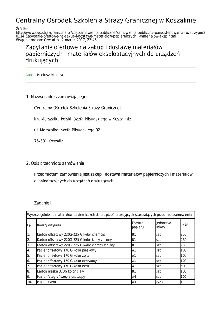Centralny Ośrodek Szkolenia Straży Granicznej w Koszalinie Źródło: http://www.cos.strazgraniczna.pl/cos/zamowienia-publiczne/zamowienia-publiczne-po/postepowania-rozstrzygn/2 0114,Zapytanie-ofertowe-na-zakup-i-dostawe-materialow-papierniczych-i-materialow-eksp.html Wygenerowano: Czwartek, 2 marca 2017, 22:45 Zapytanie ofertowe na zakup i dostawę materiałów papierniczych i materiałów eksploatacyjnych do urządzeń drukujących Autor: Mariusz Makara 1. Nazwa i adres zamawiającego: Centralny Ośrodek Szkolenia Straży Granicznej im. Marszałka Polski Józefa Piłsudskiego w Koszalinie ul. Marszałka Józefa Piłsudskiego 92 75-531 Koszalin 2. Opis przedmiotu zamówienia: Przedmiotem zamówienia jest zakup i dostawa materiałów papierniczych i materiałów eksploatacyjnych do urządzeń drukujących. Zadanie I Wyszczególnienie materiałów papierniczych do urządzeń drukujących stanowiących przedmiot zamówienia Lp. Rodzaj artykułu Format papieru Jednostka miary Ilość 1. Karton offsetowy 220G-225 G kolor chamois B1 szt. 250 2. Karton offsetowy 220G-225 G kolor jasny zielony B1 szt. 250 3. Karton offsetowy 220G-225 G kolor ciemny zielony B1 szt. 250 4. Papier offsetowy 170 G kolor piaskowy A1 szt. 100 5. Papier offsetowy 170 G kolor żółty A1 szt. 100 6. Papier offsetowy 170 G kolor czerwony A1 szt. 100 7. Papier offsetowy 170 G kolor ecru A1 szt. 50 8. Karton alaska 320G kolor biały B1 szt. 100 9. Papier fotograficzny błyszczący A4 szt. 100 10. Papier ksero A3 ryza 1 Zadanie II Wyszczególnienie materiałów papierniczych i eksploatacyjnych do urządzeń drukujących stanowiących przedmiot zamówienia Lp. Rodzaj artykułu Jednostka miary Ilość 1. Etykieta termotransferowa 60x40, 1000 sztuk w rolce rolka 100 2. Etykieta termotransferowa 100x150, 350 sztuk w rolce rolka 70 3. Kalka – taśma termotransferowa woskowo-żywiczna 60 mm, 74 m w rolka rolce 10 4. Taśma Dymo D1 biała 45013, 7 m 3 kasetka 3. Wykaz dokumentów wymaganych przez zamawiającego: Wykonawca ubiegający się o udzielenie zamówienia składa formularz ofertowy, sporządzony i podpisany zgodnie z wzorem określonym w załączniku do zapytania ofertowego. 4. Kryteria oceny oferty: Najniższa cena brutto (cena ofertowa) – 100%. 5. Termin, miejsce, sposób i forma złożenia oferty: Wykonawca składa na każde zadanie odrębną ofertę cenową. Ofertę cenową prosimy przesłać na e-mail [email protected] do dnia 02 grudnia 2016 r. 15:00. 6. Termin realizacji zamówienia: Termin realizacji zamówienia: do 10 dni od dnia złożenia zamówienia. Dostawa do siedziby zamawiającego – jednorazowa. 7. Forma płatności: przelew bankowy z 14-dniowym terminem płatności na podstawie faktury VAT. 8. Termin związania ofertą wynosi 30 dni. 9. Osoby upoważnione przez zamawiąjącego do kontaktu z wykonawcami w niniejszym postepowaniu: st. chor. sztab. SG Agnieszka Dąbrowska, tel. 0-94-3444-087 w godz. 8:00-15:00. 10. Zamawiający zastrzega sobie możliwość zmiany warunków prowadzonego zapytania ofertowego oraz jego odwołania. ZAŁĄCZNIKI DO STRONY Formularz ofertowy (docx, 21.73 KB) Data publikacji 30.11.2016 15:00 Zawiadomienie o wyborze oferty najkorzystniejszej (pdf, 1.94 MB) Data publikacji 08.12.2016 15:18