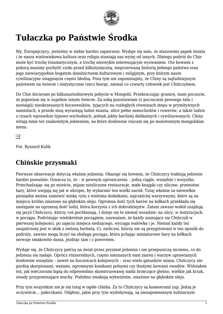 Tułaczka po Państwie Środka My, Europejczycy, jesteśmy w siebie bardzo zapatrzeni. Wydaje się nam, że stanowimy pępek świata i że nasza wielowiekowa kultura oraz religia stawiają nas wyżej od innych. Dlatego podróż do Chin może być trochę traumatycznym, a trochę niezwykle interesującym wyzwaniem. Oto bowiem z pokorą musimy pochylić czoło przed kilkutysięczną, nieprzerwaną historią jednego państwa oraz jego niewiarygodnie bogatym dziedzictwem kulturowym i religijnym, przy którym nasze cywilizacyjne osiągnięcia często bledną. Poza tym nie zapominajmy, że Chiny są najludniejszym państwem na świecie i statystycznie rzecz biorąc, niemal co czwarty człowiek jest Chińczykiem. Do Chin docieram po kilkunastodniowym pobycie w Mongolii. Przekraczając granicę, mam poczucie, że pojawiam się w zupełnie innym świecie. Za sobą pozostawiam (z poczuciem pewnego żalu i nostalgii) nieokrzesanych koczowników, żyjących na rozległych równinach stepu w prymitywnych namiotach, a przede mną wyrastają ludne miasta, ulice pełne samochodów i rowerów, a także ludzie o rysach wprawdzie typowo wschodnich, jednak jakby bardziej delikatnych i cywilizowanych. Chiny witają mnie też znakomitym jedzeniem, na które dosłownie rzucam się po monotonnym mongolskim menu. Fot. Ryszard Kulik Chińskie przysmaki Pierwsze obserwacje dotyczą właśnie jedzenia. Okazuje się bowiem, że Chińczycy traktują jedzenie bardzo poważnie. Oznacza to, że – w pewnym uproszczeniu – jedzą ciągle, wszędzie i wszystko. Przechadzając się po mieście, mijam niezliczone restauracje, małe knajpki czy uliczne, przenośne bary, które uwijają się jak w ukropie, by wykarmić ten wielki naród. Tutaj właśnie za niewielkie pieniądze można zamówić miskę ryżu z wieloma dodatkami, najczęściej warzywnymi, które są na miejscu krótko smażone na głębokim oleju. Ogromna ilość tych barów na kółkach przekłada się następnie na ogromną ilość ludzi, która korzysta z ich dobrodziejstw. Zatem zawsze wokół znajdują się jacyś Chińczycy, którzy coś pochłaniają. I dzieje się to niemal wszędzie: na ulicy, w instytucjach, w pociągu. Podróżując wielokrotnie pociągiem, zauważam, że każdy szanujący się Chińczyk w pierwszej kolejności, po zajęciu miejsca siedzącego, wyciąga wałówkę i je. Niemal każdy też zaopatrzony jest w słoik z zieloną herbatą. Ci, nieliczni, którzy nie są przygotowani w ten sposób do podróży, zawsze mogą liczyć na obsługę pociągu, która pchając miniaturowe bary na kółkach serwuje smakowite dania, jeżdżąc tam i z powrotem. Wydaje się, że Chińczycy patrzą na świat przez pryzmat jedzenia i nie przepuszczą niczemu, co do jedzenia się nadaje. Oprócz różnorodnych, często nieznanych nam ziaren i warzyw uprawianych dosłownie wszędzie – nawet na bocznicach kolejowych – oraz wielu gatunków mięsa, Chińczycy nie gardzą skorpionami, wężami, ogromnymi konikami polnymi czy tłustymi larwami owadów. Widziałem też, jak wieczorami łapią do odpowiednio skonstruowanej siatki brzęczące głośno, wielkie jak kciuk, owady przypominające muchy. Podobno smakują wykwintnie, smażone na głębokim oleju. Przy tym wszystkim nie je się tutaj w ogóle chleba. Za to Chińczycy są koneserami zup. Jedzą je oczywiście… pałeczkami. Odgłosy, jakie przy tym wydobywają, są niezapomnianym kulinarnym Tułaczka po Państwie Środka 1 koncertem. Przyglądając się temu jedzeniowemu spektaklowi, niewiarygodne wydaje się to, że jeszcze w latach 60. Chiny po komunistycznych eksperymentach nie potrafiły się same wyżywić, co spowodowało śmierć wielu milionów ludzi. Wielki mur Sztandarową pozycją w planach każdego turysty odwiedzającego Chiny jest oczywiście Wielki Mur. Również i my decydujemy się zobaczyć to monumentalne dzieło ludzkich rąk, budowane konsekwentnie wiele stuleci przez kolejnych cesarzy. Wybieramy jednak taki odcinek muru, który nie przyciąga zbyt wielu turystów, bowiem mur w okolicach Huanghua pozostawiony jest samemu sobie. Nie ma tutaj biletów wstępu, wszechobecnych kramów z pamiątkami oraz zwiedzających tłumów. Z Pekinu to zaledwie kilkadziesiąt kilometrów, który to dystans pokonujemy autobusem, a później taksówką. W drodze mamy okazję obserwować górskie wioski oraz nieśpieszną egzystencję chińskich chłopów. Fot. Ryszard Kulik W okolice muru dojeżdżamy wieczorem. Wokół wznoszą się mocno stożkowate góry, porośnięte skąpą roślinnością, z mocno wciętymi dolinami – dokładnie jak na starych chińskich malowidłach. To właśnie grzbietami tych gór ciągnie się nitka budowli, przypominająca z daleka ogromnego węża, a może smoka. Sam mur jest nieco zniszczony i zaniedbany; w wielu miejscach zarasta krzakami i innymi roślinami. Ale to dodaje mu tylko uroku. Atmosfera jest rzeczywiście szczególna, bo właśnie zapada zmrok, w powietrzu jest mnóstwo wilgoci, która osiada na wszystkim wokół niczym całun. Słońce z trudem przebija się przez tę zasłonę. Jest zupełnie bezwietrznie i spokojnie. Wdrapujemy się po rozpadających stopniach, a następnie schodzimy w dół, by ponownie, po chwili, znów wspinać się w górę. Po drodze spotykamy kilku Amerykanów, którzy wcześniej zaopatrzyli się w petardy, by w tej szczególnej scenerii dać upust swoim wybuchowym charakterom. Te petardy to podobno taka turystyczna tradycja. Mnie jednak irytują kolejne wybuchy rozdzierające ciszę okolicznych wzgórz. Po niecałej godzinie wspinaczki znajdujemy miejsce do spania na niewielkim skrawku dość dobrze zachowanego płaskiego muru. Tutaj rozkładamy karimaty i śpiwory. Przed snem długo wpatruję się w gasnący dzień, myśląc o burzliwej historii tego miejsca, ambitnych planach władców oraz o cierpieniu i śmierci zwykłych ludzi, którzy do realizacji tych planów byli wykorzystywani. Następnego dnia wcześnie rano wy