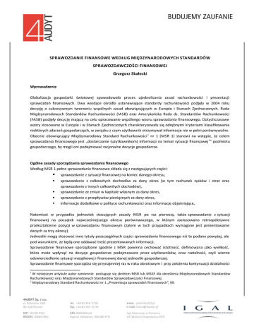 SPRAWOZDANIE F INANSOWE WEDŁUG M IĘDZYNARODOWYCH STANDARDÓW SPRAWOZDAWCZOŚCI F INANSOWEJ Grzegorz Skałecki Wprowadzenie Globalizacja gospodarki światowej spowodowała proces ujednolicania zasad rachunkowości i prezentacji sprawozdań finansowych. Dwa wiodące ośrodki ustanawiające standardy rachunkowości podjęły w 2004 roku decyzję o sukcesywnym tworzeniu wspólnych zasad obowiązujących w Europie i Stanach Zjednoczonych. Rada Międzynarodowych Standardów Rachunkowości (IASB) oraz Amerykańska Rada ds. Standardów Rachunkowości (FASB) podjęły decyzję mającą na celu opracowanie wspólnego wzoru sprawozdania finansowego. Dotychczasowe wzory stosowane w Europie i w Stanach Zjednoczonych charakteryzowały się odrębnymi kryteriami klasyfikowania niektórych zdarzeń gospodarczych, w związku z czym użytkownik otrzymywał informacje nie w pełni porównywalne. Obecnie obowiązujący Międzynarodowy Standard Rachunkowości 1 nr 1 (MSR 1) stanowi na wstępie, że celem sprawozdania finansowego jest „dostarczanie (użytkownikom) informacji na temat sytuacji finansowej 2” podmiotu gospodarczego, by mogli oni podejmować racjonalne decyzje gospodarcze. Ogólne zasady sporządzania sprawozdania finansowego Według M SR 1 pełne sprawozdanie finansowe składa się z następujących części: sprawozdanie z sytuacji finansowej na koniec danego okresu, sprawozdanie z całkowitych dochodów za dany okres (w tym rachunek zysków i strat oraz sprawozdanie z innych całkowitych dochodów), sprawozdanie ze zmian w kapitale własnym za dany okres, sprawozdanie z przepływów pieniężnych za dany okres, informacje dodatkowe o polityce rachunkowości oraz informacje objaśniające, Natomiast w przypadku jednostek stosujących zasady MSR po raz pierwszy, także sprawozdanie z sytuacji finansowej na początek najwcześniejszego okresu porównawczego, w którym zastosowano retrospektywne przekształcenie pozycji w sprawozdaniu finansowym (zatem w tych przypadkach wymagane jest prezentowanie danych za trzy okresy). Jednostki mogą stosować inne tytuły poszczególnych części sprawozdania finansowego niż te podane powyżej, ale pod warunkiem, że będą one oddawać treść prezentowanych informacji. Sprawozdanie finansowe sporządzone zgodnie z MSR powinna cechować istotność, definiowana jako wielkość, która może wpłynąć na decyzje gospodarcze podejmowane przez użytkowników, oraz rzetelność, czyli wierne odzwierciedlenie sytuacji majątkowej i finansowej danej jednostki gospodarczej. Sprawozdanie finansowe sporządza się przynajmniej raz w roku obrotowym i przy założeniu kontynuacji działalności 1 W niniejszym artykule autor zamiennie posługuje się skrótem M SR lub M SSF dla określenia Międzynarodowych Standardów Rachunkowości oraz Międzynarodowych Standardów Sprawozdawczości Finansowej. 2 Międzynarodowy Standard Rachunkowości nr 1 „Prezentacja sprawozdań finansowych”, §9. w dającej się przewidzieć przyszłości, co najmniej przez kolejnych 12 miesięcy. Każde sprawozdanie finansowe powinno być sporządzone zgodnie z zasadą memoriału (wyjątkiem jest sprawozdanie z przepływów pieniężnych, sporządzane zgodnie z zasadą kasową) i nie jest dopuszczalne kompensowanie aktywów ze zobowiązaniami, przychodów z kosztami, chyba że jest to dozwolone przez MSR. Informacje porównawcze muszą być ujawnione w stosunku do wszystkich zaprezentowanych danych liczbowych. Ważną kwesSą jest także zachowanie ciągłości prezentacji informacji w niezmienionej formie w kolejnych latach. Na początku sporządzanego dokumentu należy dokładnie określić prezentowane sprawozdanie finansowe, a więc nazwę jednostki, okres sprawozdawczy, czy jest to jednostkowe czy skonsolidowane sprawozdanie finansowe, walutę prezentacji i poziom zaokrągleń 3. Zasady zamieszczone w M SR 1 nie określają wzoru sprawozdania finansowego, według którego jednostka powinna dokonywać jego prezentacji. Poniżej wymienione pozycje należą do minimalnych wymogów informacyjnych, poza sprawozdaniem z przepływów pieniężnych, które prezentuje się według zasad określonych w M SR 7 4. Sprawozdanie z sytuacji finansowej W sprawozdaniu z sytuacji finansowej powinny zostać zaprezentowane informacje o składnikach majątku oraz o źródłach ich finansowania z podziałem na następujące pozycje: rzeczowe aktywa trwałe, nieruchomości inwestycyjne, wartości niematerialne, aktywa finansowe, inwestycje rozliczane zgodnie z metodą praw własności, aktywa biologiczne, zapasy, należności z tytułu dostaw i usług oraz pozostałe należności, środki pieniężne i ich ekwiwalenty, sumę aktywów zaklasyfikowanych jako przeznaczone do sprzedaży, zobowiązania z tytułu dostaw i usług oraz pozostałe zobowiązania, rezerwy, zobowiązania finansowe, zobowiązania i aktywa dotyczące podatku bieżącego, rezerwy oraz aktywa z tytułu odroczonego podatku dochodowego, zobowiązania wchodzące w skład grup przeznaczonych do sprzedaży, udziały niekontrolujące zaprezentowane w kapitale własnym, wyemitowany kapitał podstawowy oraz kapitały rezerwowe przynależne udziałowcom jednostki dominującej. Jednostka w sprawozdaniu z sytuacji finansowej dokonuje podziału aktywów i zobowiązań na krótkoterminowe i długoterminowe, którego kryterium stanowi okres 12 miesięcy od dnia, na który sporządzane jest sprawozdanie finansowe. Osobnej prezentacji wymagają natomiast pozycje aktywów przeznaczone do sprzedaży i związane z nimi zobowiązania. 3 Międzynarodowy Standard Rachunkowości nr 1 „Prezentacja sprawozdań finansowych”, §51. Międzynarodowy Standard Rachunkowości nr 7 „Sprawozdanie z przepływów pieniężnych”. 4 Sprawozdanie z całkowitych dochodów Pozycje należące do sprawozdania z całkowitych dochodów dana jednostka może prezentować w dwojaki sposób (do wyboru przez jednostkę): w pojedynczym sprawozdaniu z całkowitych dochodów, l