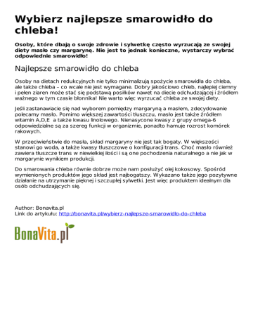 Wybierz najlepsze smarowidło do chleba! Osoby, które dbają o swoje zdrowie i sylwetkę często wyrzucają ze swojej diety masło czy margarynę. Nie jest to jednak konieczne, wystarczy wybrać odpowiednie smarowidło! Najlepsze smarowidło do chleba Osoby na dietach redukcyjnych nie tylko minimalizują spożycie smarowidła do chleba, ale także chleba – co wcale nie jest wymagane. Dobry jakościowo chleb, najlepiej ciemny i pełen ziaren może stać się podstawą posiłków nawet na diecie odchudzającej i źródłem ważnego w tym czasie błonnika! Nie warto więc wyrzucać chleba ze swojej diety. Jeśli zastanawiacie się nad wyborem pomiędzy margaryną a masłem, zdecydowanie polecamy masło. Pomimo większej zawartości tłuszczu, masło jest także źródłem witamin A,D,E a także kwasu linolowego. Nienasycone kwasy z grupy omega-6 odpowiedzialne są za szereg funkcji w organizmie, ponadto hamuje rozrost komórek rakowych. W przeciwieństwie do masła, skład margaryny nie jest tak bogaty. W większości stanowi go woda, a także kwasy tłuszczowe o konfiguracji trans. Choć masło również zawiera tłuszcze trans w niewielkiej ilości i są one pochodzenia naturalnego a nie jak w margarynie wynikiem produkcji. Do smarowania chleba równie dobrze może nam posłużyć olej kokosowy. Spośród wymienionych produktów jego skład jest najbogatszy. Wykazano także jego pozytywne działanie na utrzymanie pięknej i szczupłej sylwetki. Jest więc produktem idealnym dla osób odchudzających się. Author: Bonavita.pl Link do artykułu: http://bonavita.pl/wybierz-najlepsze-smarowidlo-do-chleba