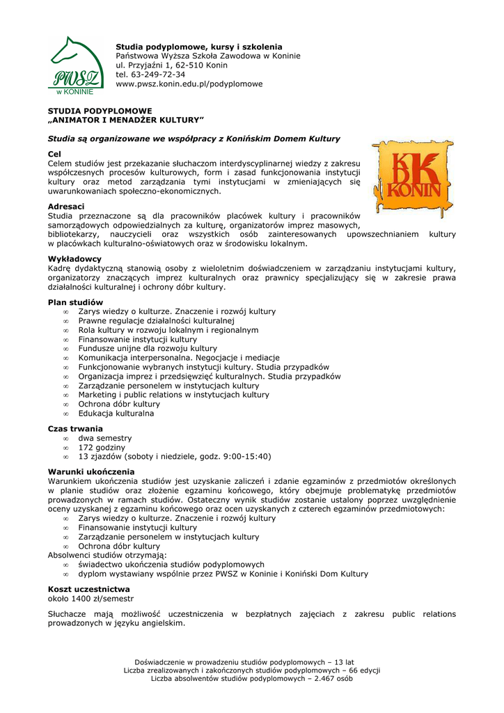 Studia podyplomowe, kursy i szkolenia Państwowa WyŜsza Szkoła Zawodowa w Koninie ul. Przyjaźni 1, 62-510 Konin tel. 63-249-72-34 www.pwsz.konin.edu.pl/podyplomowe STUDIA PODYPLOMOWE „ANIMATOR I MENADśER KULTURY” Studia są organizowane we współpracy z Konińskim Domem Kultury Cel Celem studiów jest przekazanie słuchaczom interdyscyplinarnej wiedzy z zakresu współczesnych procesów kulturowych, form i zasad funkcjonowania instytucji kultury oraz metod zarządzania tymi instytucjami w zmieniających się uwarunkowaniach społeczno-ekonomicznych. Adresaci Studia przeznaczone są dla pracowników placówek kultury i pracowników samorządowych odpowiedzialnych za kulturę, organizatorów imprez masowych, bibliotekarzy, nauczycieli oraz wszystkich osób zainteresowanych upowszechnianiem w placówkach kulturalno-oświatowych oraz w środowisku lokalnym. kultury Wykładowcy Kadrę dydaktyczną stanowią osoby z wieloletnim doświadczeniem w zarządzaniu instytucjami kultury, organizatorzy znaczących imprez kulturalnych oraz prawnicy specjalizujący się w zakresie prawa działalności kulturalnej i ochrony dóbr kultury. Plan studiów • Zarys wiedzy o kulturze. Znaczenie i rozwój kultury • Prawne regulacje działalności kulturalnej • Rola kultury w rozwoju lokalnym i regionalnym • Finansowanie instytucji kultury • Fundusze unijne dla rozwoju kultury • Komunikacja interpersonalna. Negocjacje i mediacje • Funkcjonowanie wybranych instytucji kultury. Studia przypadków • Organizacja imprez i przedsięwzięć kulturalnych. Studia przypadków • Zarządzanie personelem w instytucjach kultury • Marketing i public relations w instytucjach kultury • Ochrona dóbr kultury • Edukacja kulturalna Czas trwania • dwa semestry • 172 godziny • 13 zjazdów (soboty i niedziele, godz. 9:00-15:40) Warunki ukończenia Warunkiem ukończenia studiów jest uzyskanie zaliczeń i zdanie egzaminów z przedmiotów określonych w planie studiów oraz złoŜenie egzaminu końcowego, który obejmuje problematykę przedmiotów prowadzonych w ramach studiów. Ostateczny wynik studiów zostanie ustalony poprzez uwzględnienie oceny uzyskanej z egzaminu końcowego oraz ocen uzyskanych z czterech egzaminów przedmiotowych: • Zarys wiedzy o kulturze. Znaczenie i rozwój kultury • Finansowanie instytucji kultury • Zarządzanie personelem w instytucjach kultury • Ochrona dóbr kultury Absolwenci studiów otrzymają: • świadectwo ukończenia studiów podyplomowych • dyplom wystawiany wspólnie przez PWSZ w Koninie i Koniński Dom Kultury Koszt uczestnictwa około 1400 zł/semestr Słuchacze mają moŜliwość uczestniczenia prowadzonych w języku angielskim. w bezpłatnych zajęciach z zakresu Doświadczenie w prowadzeniu studiów podyplomowych – 13 lat Liczba zrealizowanych i zakończonych studiów podyplomowych – 66 edycji Liczba absolwentów studiów podyplomowych – 2.467 osób public relations