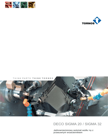 T H I N K PA R T S T H I N K T O R N O S DECO SIGMA 20 / SIGMA 32 Jednowrzecionowy automat wzdłużny z przesuwnym wrzeciennikiem INNOWACYJNE I WYDAJNE ROZWIĄZANIE DO PRODUKCJI CZĘŚCI ŚREDNIEJ ZŁOŻONOŚCI Przemysł motoryzacyjny Technika medyczna Elektronika Różne branże DECO SIGMA 20 / SIGMA 32 3 DECO SIGMA 20 / SIGMA 32 KINEMATYKA UKIERUNKOWANA NA PROSTOTĘ I WYDAJNOŚĆ Wszechstronność Wygoda ? Wszystkie oprawki narzędziowe i osprzęt ? Programowanie do wyboru w standardzie ISO lub TB- można stosować w obu systemach narzędziowych. ? Duży wybór oprawek narzędziowych do wszystkich zabiegów obróbkowych spotykanych na automatach tokarskich. ? 22 pozycje narzędziowe. 4 DECO (Opcja). ? Bardzo proste programowanie w standardzie ISO- dzięki wzajemnie w pełni niezależnej koncepcji 2 kanałowej. ? Optymalna ergonomia do wygodnej wymiany i nastawiania narzędzi. ? Nastawianie narzędzi poza obrabiarką (Opcja). DECO SIGMA 20 / SIGMA 32 W połączeniu z magazynem prętów SBF-532, automaty tokarskie DECO Sigma 20 / Sigma 32 tworzą wydajne i kompletne rozwiązania produkcyjne. Sztywność ? Nadzwyczaj sztywna konstrukcja, sprawdzona metodą elementów skończonych (FEM). ? Z rozmachem zwymiarowane wrzeciona. DECO SIGMA 20 / SIGMA 32 Wydajność Wysoka wydajność skrawania. ? Możliwość zastosowania w każdym przypadku ? jednocześnie dwóch narzędzi. 5 DECO SIGMA 20 / SIGMA 32 KINEMATYKA UKIERUNKOWANA NA PROSTOTĘ I WYDAJNOŚĆ! S41 S11 Z1 Y1 Y4 X1 S1/C1 X4 S4/C4 Z4 Kinematyka z 2 całkowicie niezależnymi systemami narzędziowymi Duża przstrzeń obróbkowa do optymalnego odprowadzania wiórów. Niezależne przeciwwrzeciono. Jednoczesna (1:1) obróbka z wrzeciona głównego i przeciwwrzeciona. Najlepsza dostępność narzędzi. 6 DECO SIGMA 20 / SIGMA 32 AUTOMAT TOKARSKI DECO SIGMA 20 / SIGMA 32 I JEGO 6 OSI LINIOWYCH Z1 C1 S1 Przesuwny wrzeciennik Oś C przesuwnego wrzeciennika (Opcja) Główne wrzeciono X1 / Y1 S11 1 suport narzędziowy (Obróbka przy tulejce prowadzącej) Napęd narzędzi do operacji z wrzeciona głównego X4 / Y4 S41 2 suport narzędziowy (Obróbka drugiej strony) Napęd narzędzi do operacji z przeciwwrzeciona Z4 C4 S4 Przeciwwrzeciono Oś C przeciwwrzeciona (Opcja) Przeciwwrzeciono Y1 X4 S11 Y4 S41 Z1 S11 C1 S1 X1 C4 Z4 DECO SIGMA 20 / SIGMA 32 S4 7 DECO SIGMA 20 / SIGMA 32 WSZECHSTRONNOŚĆ GWARANCJĄ WYSOKIEJ ELASTYCZNOŚCI! Toczenie z zastosowaniem narzędzi z oprawkami HSK Obróbka drugiej strony Frezowanie poprzeczne Z4 Obróbka drugiej strony Wiercenie czołowe System oprawek narzędzi dobrano pod kątem uzyskania dużej wszechstronności i bardzo dużej elastyczności. Wszystkie oprawki narzędziowe można stosować zarówno do zabiegów z wrzeciona głównego jak i przeciwwrzeciona. Dotyczy to również także toczenia wielościanów jak i łuszczenia gwintów. Razem 22 pozycje narzędziowe do najwszechstronniejszych obróbek. Wszystkie typy oprawek wyposażone są w jeden system szybkomocujący. 8 Obróbka drugiej strony Toczenie DECO SIGMA 20 / SIGMA 32 Y1 Obróbka w tulejce prowadzącej Toczenie X4 S11 Y4 S41 Z1 S11 C1 Obróbka w tulejce prowadzącej Frezowanie poprzeczne S1 X1 C4 S4 Obróbka w tulejce prowadzącej Wiercenie czołowe Odprowadzanie gotowych części DECO SIGMA 20 / SIGMA 32 Odcinanie Obróbka w tulejce prowadzącej Wiercenie poprzeczne 9 DECO SIGMA 20 / SIGMA 32 PROSTOTA BUDOWY GWARANTEM OBSŁUGI MASZYNY PRZYJAZNEJ DLA OPERATORA! Kombinacja rozwiązań innowacyjnych ze sprawdzonymi w praktyce pozwala operatorowi na bardzo szybkie opanowanie obsługi automatów tokarskich DECO Sigma 20 & Sigma 32. Szybkowymienne systemy narzędziowe. W pełni numeryczne ustawianie i nastawianie narzędzi (wszystkie narzędzia skonstruowano jako 3 osiowe). Bardzo łatwe programowanie w języku programowania ISO dzięki koncepcji kinematycznej z 2 całkowicie niezależnymi systemami narzędziowymi. Asystent makr firmy TORNOS do operacji odcinania, przesuwu pręta, końca pręta, itd., 2 kanałowe programowanie ISO i TB-DECO (Opcjonalnie) Elektroniczne kółko ręczne (Nastawianie narzędzi + przebieg programu). 10 DECO SIGMA 20 / SIGMA 32 DECO SIGMA 20 / SIGMA 32 SZTYWNOŚĆ GWARANTEM JAKOŚĆ PRECYZYJNYCH OBRÓBEK ? Żeliwne łoże z żeliwa w celu zapewnienia bardzo dużej sztywności. Wrzecino główne i przeciwwrzeciono usytuowane ? tylko w jednej osi (Z). ? Z rozmachem zwymiarowane śruby toczne i prowadnice liniowe. System amortyzatorów do kompensacji wysokich ? przyspieszeń. Ta budowa umożliwia optymalną zabudowę ? wrzeciona. Oddziaływania dynamiczne i termiczne są mocno zredukowane. DECO SIGMA 20 / SIGMA 32 11 DECO SIGMA 20 / SIGMA 32 WYDAJNOŚĆ: GWARANTEM OPTYMALNEJ PRODUKTYWNOŚCI! Z rozmachem zwymiarowane wrzeciona i silniki ? napędowe. Taka sama moc wrzecina głównego i ? przeciwwrzeciona. Wszystkie zabiegi obróbkowe jak toczenie, ? poprzeczne frezowanie i wiercenie, wiercenie osiowe można wykonywać podczas obróbki drugiej strony. Wysokie prędkości obrotowe i wysoka dynamika ? wrzecion. Równoczesna obróbka drugiej strony . ? Wysoka wydajność obróbki dzięki specyficznym ? właściwościom wrzecion w połączeniu z wysoką sztywnością strukturalną maszyny. Stal nierdzewna 303 Ø 15 mm 90 Sek. 12 42 CR MO S4 Ø 22 mm 101 Sek. Stal nierdzewna 303 Ø 20 mm 100 Sek. Mosiądz Ø 30 mm 100 Sek. Mosiądz Ø 27 mm 56 Sek. Inox 303 Ø 32 mm 2,5 Min. DECO SIGMA 20 / SIGMA 32 DECO SIGMA 20 / SIGMA 32 DANE TECHNICZNE OPERACJE Z WRZECIONA GŁÓWNEGO SIGMA 20 SIGMA 32 Przesuw osi Z1 (Przesuwny wrzeciennik) mm 230 230 Przelot wrzeciona mm 20 (25,4) 32 Maks. prędkość obrotowa wrzeciona. obr./min. 10’000 0-8’000 Moc napędu wrzeciona głównego kW 3,7 / 5,5 3,7 / 5,5 F20; F25; F30 Stała; obrotowa Habegger F25; F30; F37 Stała; obrotowa Habegger Tulejki zaciskowe Tulejka prowadząca 14 14 Prędkość obrotowa narzędzi obrotowych S11 obr./min. 10’000 10’000 Przekrój trzonka narzędzi tokarskich mm 16 x 16 16 