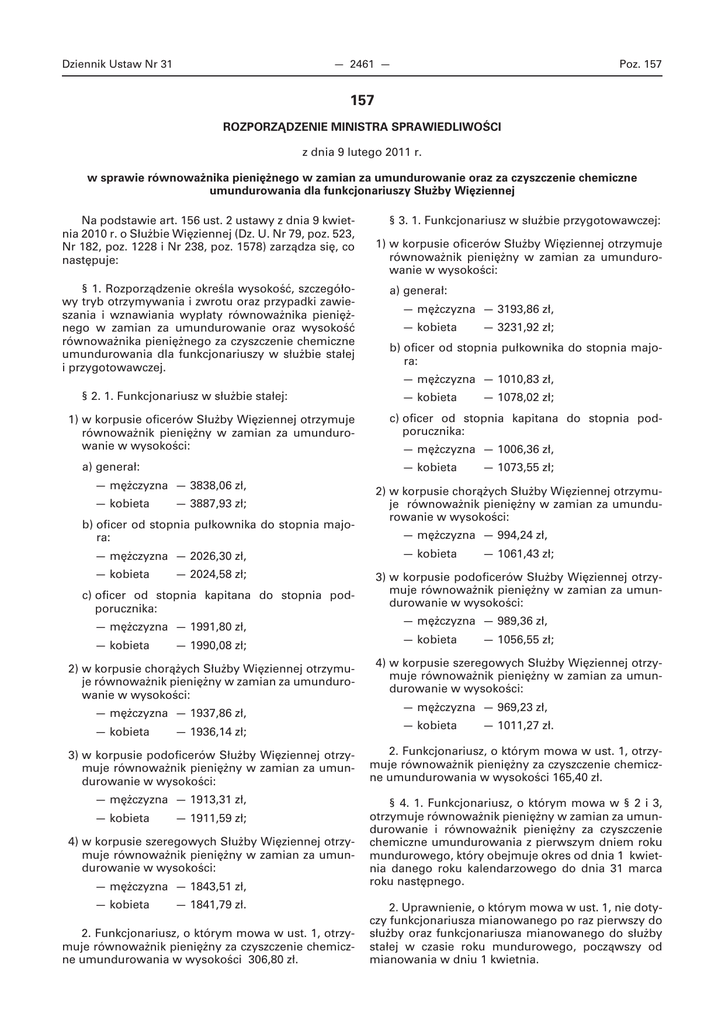 Dziennik Ustaw Nr 31 — 2461 — Poz. 157 157 ROZPORZĄDZENIE MINISTRA SPRAWIEDLIWOŚCI z dnia 9 lutego 2011 r. w sprawie równoważnika pieniężnego w zamian za umundurowanie oraz za czyszczenie chemiczne umundurowania dla funkcjonariuszy Służby Więziennej Na podstawie art. 156 ust. 2 ustawy z dnia 9 kwietnia 2010 r. o Służbie Więziennej (Dz. U. Nr 79, poz. 523, Nr 182, poz. 1228 i Nr 238, poz. 1578) zarządza się, co następuje: § 1. Rozporządzenie określa wysokość, szczegółowy tryb otrzymywania i zwrotu oraz przypadki zawieszania i wznawiania wypłaty równoważnika pieniężnego w zamian za umundurowanie oraz wysokość równoważnika pieniężnego za czyszczenie chemiczne umundurowania dla funkcjonariuszy w służbie stałej i przygotowawczej. § 3. 1. Funkcjonariusz w służbie przygotowawczej: 1) w korpusie oficerów Służby Więziennej otrzymuje równoważnik pieniężny w zamian za umundurowanie w wysokości: a) generał: — mężczyzna — 3193,86 zł, — kobieta — 3231,92 zł; b) oficer od stopnia pułkownika do stopnia majora: — mężczyzna — 1010,83 zł, § 2. 1. Funkcjonariusz w służbie stałej: 1) w korpusie oficerów Służby Więziennej otrzymuje równoważnik pieniężny w zamian za umundurowanie w wysokości: a) generał: — 3887,93 zł; b) oficer od stopnia pułkownika do stopnia majora: — mężczyzna — 2026,30 zł, — kobieta — 2024,58 zł; c) oficer od stopnia kapitana do stopnia podporucznika: — 1078,02 zł; c) oficer od stopnia kapitana do stopnia podporucznika: — mężczyzna — 1006,36 zł, — kobieta — mężczyzna — 3838,06 zł, — kobieta — kobieta — 1073,55 zł; 2) w korpusie chorążych Służby Więziennej otrzymuje równoważnik pieniężny w zamian za umundurowanie w wysokości: — mężczyzna — 994,24 zł, — kobieta — 1061,43 zł; 3) w korpusie podoficerów Służby Więziennej otrzymuje równoważnik pieniężny w zamian za umundurowanie w wysokości: — mężczyzna — 1991,80 zł, — mężczyzna — 989,36 zł, — kobieta — kobieta — 1990,08 zł; 2) w korpusie chorążych Służby Więziennej otrzymuje równoważnik pieniężny w zamian za umundurowanie w wysokości: — mężczyzna — 1937,86 zł, — kobieta — 1936,14 zł; 3) w korpusie podoficerów Służby Więziennej otrzymuje równoważnik pieniężny w zamian za umundurowanie w wysokości: — mężczyzna — 1913,31 zł, — kobieta — 1911,59 zł; 4) w korpusie szeregowych Służby Więziennej otrzymuje równoważnik pieniężny w zamian za umundurowanie w wysokości: — mężczyzna — 1843,51 zł, — kobieta — 1841,79 zł. 2. Funkcjonariusz, o którym mowa w ust. 1, otrzymuje równoważnik pieniężny za czyszczenie chemiczne umundurowania w wysokości 306,80 zł. — 1056,55 zł; 4) w korpusie szeregowych Służby Więziennej otrzymuje równoważnik pieniężny w zamian za umundurowanie w wysokości: — mężczyzna — 969,23 zł, — kobieta — 1011,27 zł. 2. Funkcjonariusz, o którym mowa w ust. 1, otrzymuje równoważnik pieniężny za czyszczenie chemiczne umundurowania w wysokości 165,40 zł. § 4. 1. Funkcjonariusz, o którym mowa w § 2 i 3, otrzymuje równoważnik pieniężny w zamian za umundurowanie i równoważnik pieniężny za czyszczenie chemiczne umundurowania z pierwszym dniem roku mundurowego, który obejmuje okres od dnia 1 kwietnia danego roku kalendarzowego do dnia 31 marca roku następnego. 2. Uprawnienie, o którym mowa w ust. 1, nie dotyczy funkcjonariusza mianowanego po raz pierwszy do służby oraz funkcjonariusza mianowanego do służby stałej w czasie roku mundurowego, począwszy od mianowania w dniu 1 kwietnia. Dziennik Ustaw Nr 31 — 2462 — 3. Funkcjonariusz przeniesiony z innej jednostki organizacyjnej Służby Więziennej otrzymuje równoważnik pieniężny w zamian za umundurowanie i równoważnik pieniężny za czyszczenie chemiczne umundurowania w jednostce, w której pełni służbę. 4. Funkcjonariusz, o którym mowa w ust. 1, otrzymuje równoważnik pieniężny w zamian za umundurowanie i równoważnik pieniężny za czyszczenie chemiczne umundurowania w terminie do 60 dni od dnia powstania uprawnienia do równoważnika. § 5. 1. Funkcjonariusz w służbie stałej zwolniony ze służby na podstawie art. 96 ust. 2 pkt 1, 5 i 6 ustawy z dnia 9 kwietnia 2010 r. o Służbie Więziennej, zwanej dalej „ustawą”, lub któremu wygasł stosunek służbowy na podstawie art. 97 ust. 1 pkt 2—8 ustawy, a także funkcjonariusz w służbie przygotowawczej zwolniony ze służby na podstawie art. 96 ustawy, lub któremu wygasł stosunek służbowy na podstawie art. 97 ust. 1 pkt 2—8 ustawy, przed upływem okresu, za który wypłacono równoważnik pieniężny w zamian za umundurowanie, jest obowiązany zwrócić proporcjonalną część równoważnika, liczoną w pełnych miesiącach, za okres niepozostawania w służbie. 2. Równoważnik pieniężny w zamian za umundurowanie nie przysługuje funkcjonariuszowi korzystającemu z urlopu wychowawczego lub bezpłatnego, trwającego dłużej niż 6 miesięcy, za okres tych urlopów, liczonych łącznie w ciągu roku mundurowego. 3. W przypadku wypłaty równoważnika pieniężnego w zamian za umundurowanie przed rozpoczęciem urlopów, o których mowa w ust. 2, funkcjonariusz jest obowiązany zwrócić część pobranego równoważnika w wysokości proporcjonalnej do okresu trwania tych urlopów (liczonych w pełnych miesiącach). § 6. 1. Wypłatę równoważnika pieniężnego w zamian za umundurowanie zawiesza się funkcjonariuszowi w przypadku zawieszenia go w czynnościach służbowych, na okres tego zawieszenia (liczonego w pełnych miesiącach). Poz. 157 2. Wznowienie wypłaty równoważnika pieniężnego, o którym mowa w ust. 1, następuje po zakończeniu okresu zawieszenia funkcjonariusza w czynnościach służbowych, chyba że wygasł stosunek służbowy na podstawie art. 97 ust. 1 pkt 2—5 ustawy. 3. W przypadku wypłaty równo