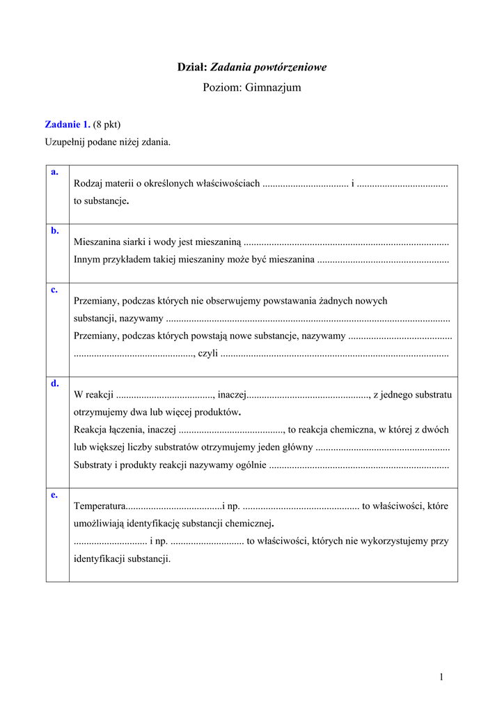 Dział: Zadania powtórzeniowe Poziom: Gimnazjum Zadanie 1. (8 pkt) Uzupełnij podane niżej zdania. a. Rodzaj materii o określonych właściwościach .................................. i .................................... to substancje. b. Mieszanina siarki i wody jest mieszaniną ................................................................................. Innym przykładem takiej mieszaniny może być mieszanina .................................................... c. Przemiany, podczas których nie obserwujemy powstawania żadnych nowych substancji, nazywamy ................................................................................................................ Przemiany, podczas których powstają nowe substancje, nazywamy ......................................... ..............................................., czyli .......................................................................................... d. W reakcji ......................................, inaczej................................................, z jednego substratu otrzymujemy dwa lub więcej produktów. Reakcja łączenia, inaczej ........................................., to reakcja chemiczna, w której z dwóch lub większej liczby substratów otrzymujemy jeden główny ..................................................... Substraty i produkty reakcji nazywamy ogólnie ....................................................................... e. Temperatura......................................i np. .............................................. to właściwości, które umożliwiają identyfikację substancji chemicznej. ............................. i np. ............................. to właściwości, których nie wykorzystujemy przy identyfikacji substancji. 1 Zadanie 2. (12 pkt) Wykonaj poniżej zapisane polecenia. a. Dokończ podane schematyczne zapisy. 1. srebro + siarka → ................................................................................................................. 2. piasek + woda → .................................................................................................................. 3. ....................................+.......................................... → tlenek magnezu 4. .....................................+.......................................... → mieszanina jednorodna 5. .................................................................................. → tlen + rtęć 6. olej + woda → ...................................................................................................................... b. Schematyczne zapisy podane w podpunkcie a podziel na dwie grupy. Grupa I – zapisy nr: .............................................................. Grupa II – zapisy nr: .............................................................. c. Napisz krótko, dlaczego można dokonać takiego podziału. ..................................................................................................................................................... ..................................................................................................................................................... ..................................................................................................................................................... ..................................................................................................................................................... .................................................................................................................................................... .................................................................................................................................................... d. W wybranym jednym równaniu wskaż substraty i produkty reakcji. Równanie nr ...................... Substraty: ................................................................... Produkty: .................................................................... 2 Zadanie 3. (8 pkt) Dane są mieszaniny: woda morska, woda wodociągowa (z kranu), piasek z wodą, woda z octem, siarka z opiłkami magnezu, mętna woda z rzeki, piana wodospadu, mosiądz, spirytus salicylowy, mgła. a. Podane mieszaniny podziel na dwie grupy. Grupa I: .................................................................................................................................................... ..................................................................................................................................................... Grupa II: ..................................................................................................................................................... ................................................................................................................................................. b. Uzasadnij krótko kryterium podziału na dwie grupy. ..................................................................................................................................................... ..................................................................................................................................................... ..................................................................................................................................................... ..................................................................................................................................................... ..................................................................................................................................................... .................................................................................................................................................... c. Wybierz po jednej dowolnej mieszaninie z grupy I i II, a następnie omów po jednej metodzie r