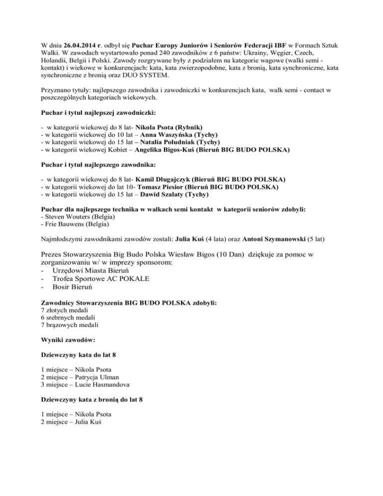 W dniu 26.04.2014 r. odbył się Puchar Europy Juniorów i Seniorów Federacji IBF w Formach Sztuk Walki. W zawodach wystartowało ponad 240 zawodników z 6 państw: Ukrainy, Węgier, Czech, Holandii, Belgii i Polski. Zawody rozgrywane były z podziałem na kategorie wagowe (walki semi kontakt) i wiekowe w konkurencjach: kata, kata zwierzopodobne, kata z bronią, kata synchroniczne, kata synchroniczne z bronią oraz DUO SYSTEM. Przyznano tytuły: najlepszego zawodnika i zawodniczki w konkurencjach kata, walk semi - contact w poszczególnych kategoriach wiekowych. Puchar i tytuł najlepszej zawodniczki: - w kategorii wiekowej do 8 lat- Nikola Psota (Rybnik) - w kategorii wiekowej do 10 lat – Anna Waszyńska (Tychy) - w kategorii wiekowej do 15 lat – Natalia Południak (Tychy) - w kategorii wiekowej Kobiet – Angelika Bigos-Kuś (Bieruń BIG BUDO POLSKA) Puchar i tytuł najlepszego zawodnika: - w kategorii wiekowej do 8 lat- Kamil Długajczyk (Bieruń BIG BUDO POLSKA) - w kategorii wiekowej do lat 10- Tomasz Piesior (Bieruń BIG BUDO POLSKA) - w kategorii wiekowej do 15 lat – Dawid Szalaty (Tychy) Puchar dla najlepszego technika w walkach semi kontakt w kategorii seniorów zdobyli: - Steven Wouters (Belgia) - Frie Bauwens (Belgia) Najmłodszymi zawodnikami zawodów zostali: Julia Kuś (4 lata) oraz Antoni Szymanowski (5 lat) Prezes Stowarzyszenia Big Budo Polska Wiesław Bigos (10 Dan) dziękuje za pomoc w zorganizowaniu w/ w imprezy sponsorom: - Urzędowi Miasta Bieruń - Trofea Sportowe AC POKALE - Bosir Bieruń Zawodnicy Stowarzyszenia BIG BUDO POLSKA zdobyli: 7 złotych medali 6 srebrnych medali 7 brązowych medali Wyniki zawodów: Dziewczyny kata do lat 8 1 miejsce – Nikola Psota 2 miejsce – Patrycja Ulman 3 miejsce – Lucie Hasmandova Dziewczyny kata z bronią do lat 8 1 miejsce – Nikola Psota 2 miejsce – Julia Kuś Dziewczyny kata zwierzopodobne do lat 8 1 miejsce – Nikola Psota 2 miejsce – Żaneta Misiarz Chłopcy kata do lat 8 1 miejsce – Kamil Długajczyk 2 miejsce- Sascha Pener 3 miejsce – Matej Basanda Chłopcy kata z bronią do lat 8 1 miejsce – Kamil Długajczyk 2 miejsce – Artur Snela 3 miejsce – Antoni Szymanowski Chłopcy kata zwierzopodobne do lat 8 1 miejsce – Kamil Długajczyk 2 miejsce – Artur Snela 3 miejsce- Rafał Tkaczewski Dziewczyny kata do lat 10 1 miejsce- Anna Waszyńska 2 miejsce- Yasmijn Oskam 3 miejsce- Karolina Mlcakova Dziewczyny kata z bronią do lat 10 1 miejsce – Martyna Lisowicz 2 miejsce- Anna Waszyńska 3 miejsce – Eliska Krivankova Dziewczyny kata zwierzopodobne do lat 10 1 miejsce – Anna Waszyńska 2 miejsce – Martyna Lisowicz 3 miejsce- Marcelina Fitz Chłopcy kata do lat 10 1 miejsce – Danyyil Yevtushenko 2 miejsce- Maksymilian Pepke 3 miejsce – Vitalii Oliynik Chłopcy kata z bronią do lat 10 1 miejsce – Tomasz Piesior 2 miejsce – Maksymilian Pepke 3 miejsce –Jakub Kuś Chłopcy kata zwierzopodobne do lat 10 1 miejsce – Paweł Szarlej 2 miejsce – Rafał Ignacy 3 miejsce- Tomasz Piesior Dziewczyny kata do lat 15 1 miejsce – Natalia Południak 2 miejsce – Linda Zuijderduijn 3 miejsce – Jessica Psota Dziewczyny kata z bronią do lat 15 1 miejsce- Natalia Południak 2 miejsce – Jessica Psota 3 miejsce – Natalia Wajda Dziewczyny kata zwierzopodobne do lat 15 1 miejsce- Justyna Wojtala 2 miejsce – Jessica Psota 3 miejsce – Aleksandra Świergolik Chłopcy kata do lat 15 1 miejsce – Dawid Szalaty 2 miejsce- Denis Filipek 3 miejsce – Filip Kowalczyk Chłopcy kata z bronią do lat 15 1 miejsce – Dawid Szalaty 2 miejsce – Mateusz Saternus 3 miejsce – Jakub Volak Chłopcy kata zwierzopodobne do lat 15 1 miejsce – Ondrej Cajan 2 miejsce - Filip Filipek 3 miejsce – Jakub Volak Kobiety-seniorki kata 1 miejsce - Angelika Bigos - Kuś 2 miejsce – Ksenia Psota 3 miejsce – Maria Zegar Kobiety seniorki kata z bronią 1 miejsce – Angelika Bigos - Kuś 2 miejsce –Hanna Ćmiel 3 miejsce – Marketa Hricovova Kobiety seniorki kata zwierzopodobne 1 miejsce – Hanna Ćmiel 2 miejsce – Marketa Hricovova 3 miejsce – Ksenia Psota Mężczyźni seniorzy kata 1 miejsce – Valentyn Avramenko 2 miejsce – Richard Pet 3 miejsce – Michał Krajewski Mężczyźni seniorzy kata z bronią 1 miejsce – Patryk Szalaty 2 miejsce – Kamil Solecki 3 miejsce – Zygfryd Szymik Synchron kata dzieci 1 miejsce – Joshua Grὔnwald, Vladimir Pener, Sascha Pener 2 miejsce – Vitalii Oliynik, Danyyil Yevtushenko, Andrii Dubrivnyi 3 miejsce – Paweł Szarlej, Marcelina Fitz, Rafał Ignacy Synchron kata z bronią dzieci 1 miejsce - – Vitalii Oliynik, Danyyil Yevtushenko, Andrii Dubrivnyi Synchron kata juniorzy 1 miejsce – Zuzanna Mamok, Adrianna Solecka, Filip Kowalczyk 2 miejsce – Sandra Michno, Aleksandra Michno, Justyna Wojtala 3 miejsce – Denis Filipek, Filip Filipek, Jan Vlasek Synchron kata z bronią juniorzy 1 miejsce – Zuzanna Mamok, Adrianna Solecka, Filip Kowalczyk 2 miejsce – Sandra Michno, Aleksandra Michno, Justyna Wojtala 3 miejsce – Magdalena Skotnicka, Martyna Krzanowska, Julia Baczewska Synchron kata seniorzy 1 miejsce – Richard Pet, Bastiaan van Ommen, Luka Lekovic 2 miejsce – Marietta Sandor, Klaudia Dios, Balint Balazs 3 miejsce – Patrycja Wiśniewska, Bartosz Wiśniewski, Jarosław Krzeszowiak Synchron kata z bronią seniorzy 1 miejsce – Daniel Rohonczy, Zoltan Sandor, Oliver Tallacz 2 miejsce – Maria Zegar, Magdalena Skotnicka, Martyna Krzanowska DUO SYSTEM do lat 10 1 miejsce – Olivier Urbański, Szymon Gaca 2 miejsce – Kacper Wojciechowski, Kordian Magiera DUO SYSTEM do lat 15 1 miejsce – Ondrej Cajan, Jana Krivkova 2 miejsce – Wojciech Kasprzyk, Dominik Lech 3 miejsce – Denis Filipek, Filip Filipek DUO SYSTEM seniorzy 1 miejsce – Ryszard Bochm, Tomasz Kołeczko 2 miejsce – Rene Kaniok, Lukas Novak 3 miejsce – Paweł Ryguła, Patryk Szalaty Walki semi-contakt: Kategoria 10-11 lat Dziewczyny – 30 kg 1 miejsce– Klaudia Potok 2 