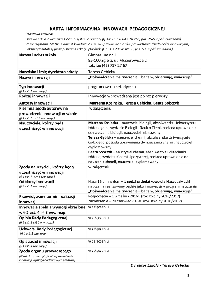 KARTA INFORMACYJNA INNOWACJI PEDAGOGICZNEJ Podstawa prawna: Ustawa z dnia 7 września 1991r. o systemie oświaty (tj. Dz. U. z 2004 r. Nr 256, poz. 2572 z póź. zmianami) Rozporządzenie MENiS z dnia 9 kwietnia 2002r. w sprawie warunków prowadzenia działalności innowacyjnej i eksperymentalnej przez publiczne szkoły i placówki (Dz. U. z 2002r. Nr 56, poz. 506 z póź. zmianami) Nazwa i adres szkoły Nazwisko i imię dyrektora szkoły Nazwa innowacji Typ innowacji Gimnazjum nr 1 95-100 Zgierz, ul. Musierowicza 2 tel./fax (42) 717 27 67 Teresa Gębicka „Doświadczenie ma znaczenie – badam, obserwuję, wnioskuję” programowo - metodyczna (§ 1 ust. 1 ww. rozp.) Rodzaj innowacji Innowacja wprowadzana jest po raz pierwszy Autorzy innowacji Pisemna zgoda autorów na prowadzenie innowacji w szkole Marzena Kosińska, Teresa Gębicka, Beata Sobczyk w załączeniu (§ 4 ust. 2 pkt 3 ww. rozp.) Nauczyciele, którzy będą uczestniczyć w innowacji Marzena Kosińska – nauczyciel biologii, absolwentka Uniwersytetu Łódzkiego na wydziale Biologii i Nauk o Ziemi, posiada uprawnienia do nauczania biologii, nauczyciel mianowany Teresa Gębicka – nauczyciel chemii, absolwentka Uniwersytetu Łódzkiego, posiada uprawnienia do nauczania chemii, nauczyciel dyplomowany Beata Sobczyk – nauczyciel chemii, absolwentka Politechniki Łódzkiej wydziału Chemii Spożywczej, posiada uprawnienia do nauczania chemii, nauczyciel dyplomowany Zgody nauczycieli, którzy będą uczestniczyć w innowacji w załączeniu (§ 4 ust. 2 pkt 1 ww. rozp.) Klasa 1B gimnazjum – 1 godzina dodatkowo dla klasy; cały cykl nauczania realizowany będzie jako innowacyjny program nauczania „Doświadczenie ma znaczenie – badam, obserwuję, wnioskuję” Rozpoczęcie – 1 września 2016r. (rok szkolny 2016/2017) Przewidywany termin realizacji Zakończenie – 20 czerwiec 2019r. (rok szkolny 2016/2017) innowacji Innowacja spełnia wymogi określone w załączeniu Odbiorcy innowacji (§ 2 ust. 1 ww. rozp.) w § 2 ust. 4 i § 3 ww. rozp. Opinia Rady Pedagogicznej w załączeniu (§ 4 ust. 2 pkt 2 ww. rozp.) Uchwała Rady Pedagogicznej w załączeniu (§ 4 ust. 1 ww. rozp.) Opis zasad innowacji w załączeniu (§ 4 ust. 3 ww. rozp.) Zgoda organu prowadzącego w załączeniu §2 ust. 1 (załączyć, jeżeli wprowadzenie innowacji wymaga dodatkowych środków) Dyrektor Szkoły - Teresa Gębicka 1 OPIS ZASAD INNOWACJI I. Programy, na których oparta jest innowacja „Program nauczania biologii w gimnazjum. Ciekawa biologia” – Ewa Kłos, Wawrzyniec Kofta, Mariola Kikier-Wyrwicka, Hanna Werblan-Jakubiec „Program nauczania chemii w gimnazjum. Chemia Nowej Ery” Jan Kulawik, Teresa Kulawik, Maria Litwin, Grażyna Francuz-Ornat II. Diagnoza wstępna Dla wielu uczniów przedmioty przyrodnicze z założenia są przedmiotami trudnymi. Uczą się jednokierunkowo, nie dostrzegają powiązania między przedmiotami ścisłymi, nie potrafią użyć wiedzy zdobytej np. na chemii do opisania zagadnień z biologii. Znaczącą rolę w procesie edukacji w zakresie przedmiotów przyrodniczych odgrywa eksperyment, któremu towarzyszyć powinno poznawanie nowoczesnych metod badawczych oraz technik eksponowania wyników badań. Na lekcjach jednak wykonuje się tylko te doświadczenia, które związane są ściśle z tematem lekcji. Uczniowie bardzo często wyrażają opinię, iż czują wielki niedosyt eksperymentów. Czas lekcji nie pozwala na przeprowadzenie większej liczby doświadczeń, co powoduje, że umiejętność obserwacji, opisu oraz wyciągania wniosków z przeprowadzonego eksperymentu nie jest na wysokim poziomie. Uczniowie kończący Gimnazjum nr 1 najczęściej wybierają szkoły techniczne lub klasy w liceach o profilach przyrodniczych. Rodzice oczekują od szkoły właściwego przygotowania ich dziecka do następnych etapów edukacji, w szczególności z przedmiotów przyrodniczych. Ważnym czynnikiem warunkującym sposoby i kierunki kształcenia są zmiany na polskim rynku pracy. Liczne badania wskazują na rosnące zapotrzebowania na osoby z wykształceniem ścisłym. Wykształcenie techniczne sprzyja zarówno karierze zawodowej jak i radzeniu sobie z problemami dnia powszedniego. Niezbędne stają się umiejętności właściwego planowania i wnioskowania w rozmaitych sytuacjach od selekcji i analizy informacji, po rozwiązywanie złożonych interdyscyplinarnych problemów. Biorąc pod uwagę wszystkie czynniki, postanowiłyśmy wyjść z propozycją utworzenia klasy, w której realizowana będzie innowacja pedagogiczna „Doświadczenie ma znaczenie – badam, obserwuję, wnioskuję”. Została ona opracowana w oparciu o podstawę programową kształcenia ogólnego na III etapie edukacyjnym, ze szczególnym uwzględnieniem zagadnień dotyczących zastosowania zdobytej wiedzy w życiu codziennym. Program zakłada rozbudzanie i pogłębianie zainteresowania uczniów przedmiotami ścisłymi, rozwijanie ich kompetencji badawczych, naukowo – technicznych, matematycznych, informatycznych oraz wykorzystywania zdobytej wiedzy i umiejętności w sytuacjach praktycznych. Proponowana innowacja zakłada uzmysłowienie uczniom korelacji między chemią i biologią oraz realizowanie treści programowych w oparciu o eksperyment i obserwację. Eksperyment spełnia ważną funkcję w rozwijaniu zainteresowania uczniów procesami występującymi wokół nich wówczas, gdy wyjaśnia on mechanizmy, które uczniowie dostrzegali wcześniej, ale nie mogli zrozumieć ich istoty z braku odpowiedniej wiedzy. Właściwe zastosowanie 2 eksperymentu spowoduje, iż będą oni szukać tych procesów w otoczeniu. Sprzyja to kształtowaniu uważnej, dociekliwej postawy uczniów w stosunku do obiektów najbliższego środowiska. Zwiększona liczba godzin chemii i biologii przeznaczona będzie głównie na poszerzanie zakresu ich wiedzy oraz praktyczne i twórcze działania uczniów. Do realizacji programu przewidziałyśmy stosowanie różnorodnyc