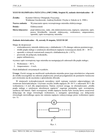 37OF_II_D KOOF Szczecin: www.of.szc.pl XXXVII OLIMPIADA FIZYCZNA (1987/1988). Stopień II, zadanie doświadczalne – D Źródło: Komitet Główny Olimpiady Fizycznej; Waldemar Gorzkowski, Andrzej Kotlicki: Fizyka w Szkole nr 4, 1988 r. Nazwa zadania: Wyznaczanie oporu wewnętrznego miernika elektrycznego. Działy: Elektryczność Słowa kluczowe: prąd elektryczny, stały, siła elektromotoryczna, napięcie, natężenie, opór, prawa Kirchhoffa. miernik elektryczny, woltomierz, amperomierz, oporniki, opór wewnętrzny miernika Zadanie doświadczalne – D, zawody II stopnia, XXXVII OF. Mając do dyspozycji: − wielozakresowy miernik elektryczny o dokładności 1,5% danego zakresu pomiarowego, − źródło prądu stałego o ustalonym określonym napięciu wynoszącym około 20 - 30 V, − oporniki o różnych wartościach znanych z dokładnością do ± 10 %, − przewody do połączeń, krokodylki, − papier milimetrowy, wyznacz opór wewnętrzny tego miernika na następujących zakresach dla prądu stałego:. 1. Woltomierz - 30 V, 2. Amperomierz - 6 mA. Oceń dokładność otrzymanych wyników. Uwaga: Zwróć uwagę na możliwość uszkodzenia miernika przez jego niewłaściwe włączenie do źródła (szczególnie na zakresie prądowym); przed przystąpieniem do pomiarów konieczne jest zwrócenie się do asystenta o sprawdzenie obwodu. W miejscach wykropkowanych zawodnicy mieli wpisane wartości odpowiadające ich zestawom doświadczalnym. Używano zwykle źródła napięcia 20-30 V o zakresach 30 V dla woltomierza i 6 mA dla amperomierza. Należy zwrócić uwagę, że sformułowanie „źródła prądu stałego o ustalonym określonym napięciu” sugeruje pomijalny opór wewnętrzny zasilacza lub baterii. Opór wewnętrzny źródła napięcia można było zresztą łatwo oszacować dołączając do niego równolegle woltomierz, a następnie sprawdzając czy dołączenie równoległe niewielkiego oporu nie zmienia napięcia wskazywanego przez woltomierz (patrz rys. 1). E Rys. 1. Oprac. PDFiA US, 2006, red. T.M.Molenda - 1/4 - www.dydaktyka.fizyka.szc.pl 37OF_II_D KO OF Szczecin: www.of.szc.pl Rozwiązanie Opór wewnętrzny woltomierza RV wyznaczamy stosując obwód z rys. 2 z oporem R o różnych wartościach R E RV Rys. 2. Z drugiego prawa Kirchhoffa mamy E = (R + RV) · I, gdzie I jest natężeniem prądu w obwodzie. (Zakładamy, że opór wewnętrzny źródła r « R + RV). Ponadto napięcie na woltomierzu wynosi U = RV · I. Z powyższych równań znajdujemy związek 1 1 = ⋅ ( R + R V ), U E ⋅ RV który umożliwi nam wyznaczenie RV na podstawie pomiarów U dla różnych wartości oporu R. W tym celu sporządzamy wykres 1 ( R) , prowadzimy prostą jak na rys. 3 i wyznaczamy RV U na podstawie punktu przecięcia prostej z osią odciętych. 1/U -RV 0 R Rys. 3. Oprac. PDFiA US, 2006, red. T.M.Molenda - 2/4 - www.dydaktyka.fizyka.szc.pl 37OF_II_D KO OF Szczecin: www.of.szc.pl Opór wewnętrzny amperomierza RA można w zasadzie wyznaczyć tą samą metodą, co RV. Metoda ta jednak daje sensowne wyniki, jeśli wartość E jest zbliżona do wartości spadku napięcia na mierniku przy pełnym jego wychyleniu (odpowiadało to zakresowi woltomierza). Spadek ten w przypadku amperomierza jest bardzo mały (tutaj rzędu 0,1 V) -wielokrotnie niższy od napięcia źródła E. Skorzystamy z tego, by uzyskać źródło w przybliżeniu stałego prądu: łączymy w tym celu szeregowo ze źródłem opornik R ' o wartości takiej, aby prąd I ' = E / R ' był równy lub nieco niższy od zakresu amperomierza. Zestawiamy obwód wg rys. 4 stosując opór R o różnych wartościach. R’ E R RA Rys. 4. Jeśli prąd pobierany ze źródła oznaczymy I ', a prąd płynący przez amperomierz przez I, to z równań Kirchhoffa dla tego obwodu otrzymamy związek: 1 RA = I I' ⎛1 1 ⋅ ⎜⎜ + ⎝ R RA ⎞ ⎟⎟. ⎠ Widzimy, że doświadczalna zależność 1 ⎛⎜ 1 ⎞⎟ umożliwi nam, podobnie jak w poprzednim I ⎝R⎠ przypadku, wyznaczenie wartości RA na podstawie wykresu - rys. 5. Punkt przecięcia prostej wykresu 1 ⎛⎜ 1 ⎞⎟ z osią odciętych ma współrzędną - 1 . RA Zadanie to dawało się rozwiązać równie poprawnie bez stosowania wykresu, tylko wyliczając RV i RA ze wzorów dla każdego R i biorąc wartość średnią. Należy tu jednak zwrócić uwagę, że zależnie od wartości R opory RV i RA wyznaczone są z różną dokładnością. Na przykład dla obwodu z rys. 2 pomiar RV dla małych wartości R « RV obarczony jest bardzo dużym błędem. Należało, więc dokonać wyboru wyników na RV i RA pod kątem dokładności i do obliczenia średniej użyć jedynie wyniki obarczone niewielkim błędem (co zrobiła większość zawodników wykonujących poprawnie zadanie), lub też skorzystać ze średniej ważonej. I ⎝R⎠ Oprac. PDFiA US, 2006, red. T.M.Molenda - 3/4 - www.dydaktyka.fizyka.szc.pl 37OF_II_D KO OF Szczecin: www.of.szc.pl 1/I -1/RA 1/R Rys. 5. Uwagi Niewielka część uczestników radziła sobie z poprawnym rachunkiem błędu. W tym zadaniu warto było zauważyć, że tolerancja oporników 10% nie oznacza 10% błędu uzyskanego wyniku na RV czy RA. Jeśli bowiem dokonano pomiarów dla różnych R to otrzymana na RV czy RA wartość średnia obarczona była błędem średnim kwadratowym średniej znacznie mniejszym od 10%. Wynika to z faktu, że jest rzeczą niesłychanie mało prawdopodobną, by wszystkie opory różniły się od swoich wartości nominalnych o 10% w górę lub wszystkie o 10% w dół. Natomiast, ponieważ mieliśmy do dyspozycji jeden miernik o klasie np. 1,5%, to błąd tego miernika jest dla wszystkich pomiarów taki sam. Poprawnie ocenili więc błąd ci zawodnicy, którzy wpływ tolerancji R uwzględnili na podstawie błędu średniego kwadratowego średniej lub z możliwego błędu współczynnika odczytanego z wykresu i dodali do tego wpływ klasy miernika. Ogólnie zadanie wypadło dobrze. 54-rech zawodników uzyskało 15 i więcej pu