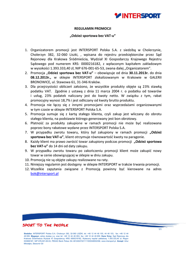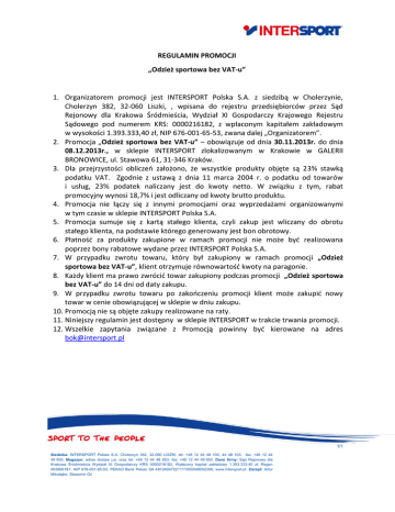 REGULAMIN PROMOCJI „Odzież sportowa bez VAT-u” 1. Organizatorem promocji jest INTERSPORT Polska S.A. z siedzibą w Cholerzynie, Cholerzyn 382, 32-060 Liszki, , wpisana do rejestru przedsiębiorców przez Sąd Rejonowy dla Krakowa Śródmieścia, Wydział XI Gospodarczy Krajowego Rejestru Sądowego pod numerem KRS: 0000216182, z wpłaconym kapitałem zakładowym w wysokości 1.393.333,40 zł, NIP 676-001-65-53, zwana dalej „Organizatorem”. 2. Promocja „Odzież sportowa bez VAT-u” – obowiązuje od dnia 30.11.2013r. do dnia 08.12.2013r., w sklepie INTERSPORT zlokalizowanym w Krakowie w GALERII BRONOWICE, ul. Stawowa 61, 31-346 Kraków. 3. Dla przejrzystości obliczeo założono, że wszystkie produkty objęte są 23% stawką podatku VAT. Zgodnie z ustawą z dnia 11 marca 2004 r. o podatku od towarów i usług, 23% podatek naliczany jest do kwoty netto. W związku z tym, rabat promocyjny wynosi 18,7% i jest odliczany od kwoty brutto produktu. 4. Promocja nie łączy się z innymi promocjami oraz wyprzedażami organizowanymi w tym czasie w sklepie INTERSPORT Polska S.A. 5. Promocja sumuje się z kartą stałego klienta, czyli zakup jest wliczany do obrotu stałego klienta, na podstawie którego generowany jest bon obrotowy. 6. Płatnośd za produkty zakupione w ramach promocji nie może byd realizowana poprzez bony rabatowe wydane przez INTERSPORT Polska S.A. 7. W przypadku zwrotu towaru, który był zakupiony w ramach promocji „Odzież sportowa bez VAT-u”, klient otrzymuje równowartośd kwoty na paragonie. 8. Każdy klient ma prawo zwrócid towar zakupiony podczas promocji „Odzież sportowa bez VAT-u” do 14 dni od daty zakupu. 9. W przypadku zwrotu towaru po zakooczeniu promocji klient może zakupid nowy towar w cenie obowiązującej w sklepie w dniu zakupu. 10. Promocją nie są objęte zakupy realizowane na raty. 11. Niniejszy regulamin jest dostępny w sklepie INTERSPORT w trakcie trwania promocji. 12. Wszelkie zapytania związane z Promocją powinny byd kierowane na adres [email protected] 1/1 Siedziba: INTERSPORT Polska S.A. Cholerzyn 382, 32-060 LISZKI, tel: +48 12 44 48 100, 44 48 103, fax: +48 12 44 48 000, Magazyn: adres dostaw j.w. oraz tel: +48 12 44 48 853, fax: +48 12 44 48 850. Dane firmy: Sąd Rejonowy dla Krakowa Śródmieścia Wydział XI Gospodarczy KRS 0000216182, Wpłacony kapitał zakładowy 1.393.333,40 zł; Regon 003900187, NIP 676-001-65-53, PEKAO Bank Pekao SA 48124047221111000048552358, www.intersport.pl. Zarząd: Artur Mikołajko, Sławomir Gil