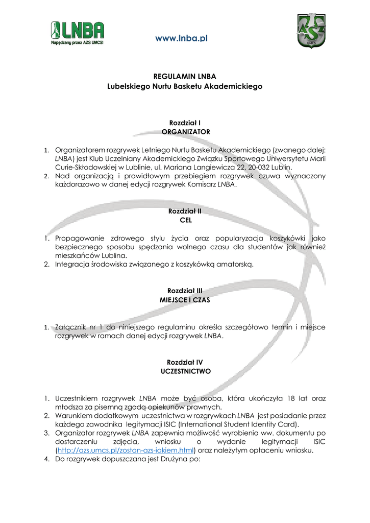 www.lnba.pl REGULAMIN LNBA Lubelskiego Nurtu Basketu Akademickiego Rozdział I ORGANIZATOR 1. Organizatorem rozgrywek Letniego Nurtu Basketu Akademickiego (zwanego dalej: LNBA) jest Klub Uczelniany Akademickiego Związku Sportowego Uniwersytetu Marii Curie-Skłodowskiej w Lublinie, ul. Mariana Langiewicza 22, 20-032 Lublin. 2. Nad organizacją i prawidłowym przebiegiem rozgrywek czuwa wyznaczony każdorazowo w danej edycji rozgrywek Komisarz LNBA. Rozdział II CEL 1. Propagowanie zdrowego stylu życia oraz popularyzacja koszykówki jako bezpiecznego sposobu spędzania wolnego czasu dla studentów jak również mieszkańców Lublina. 2. Integracja środowiska związanego z koszykówką amatorską. Rozdział III MIEJSCE I CZAS 1. Załącznik nr 1 do niniejszego regulaminu określa szczegółowo termin i miejsce rozgrywek w ramach danej edycji rozgrywek LNBA. Rozdział IV UCZESTNICTWO 1. Uczestnikiem rozgrywek LNBA może być osoba, która ukończyła 18 lat oraz młodsza za pisemną zgodą opiekunów prawnych. 2. Warunkiem dodatkowym uczestnictwa w rozgrywkach LNBA jest posiadanie przez każdego zawodnika legitymacji ISIC (International Student Identity Card). 3. Organizator rozgrywek LNBA zapewnia możliwość wyrobienia ww. dokumentu po dostarczeniu zdjęcia, wniosku o wydanie legitymacji ISIC (http://azs.umcs.pl/zostan-azs-iakiem.html) oraz należytym opłaceniu wniosku. 4. Do rozgrywek dopuszczana jest Drużyna po: www.lnba.pl a) dostarczeniu Komisarzowi LNBA oryginału formularza zgłoszenia Drużyny lub zrejestrowaniu zgłoszenia Drużyny na stronie www.lnba.azs.umcs.pl (Załącznik nr 2 do niniejszego Regulaminu), b) przedłożeniu Komisarzowi LNBA ważnej legitymacji ISIC każdego zawodnika Drużyny w formie kopii lub skanu (lub wniosku o jej wydanie wraz z jego należytym opłaceniem), c) opłaceniu przez kapitana Drużyny kwoty wpisowego, którego wysokość każdorazowo zostanie ustalona przez organizatora.. 5. Drużyna biorąca udział w rozgrywkach musi składać się z minimum 8 uczestników rozgrywek LNBA (zawodników). 6. Zawodnik występujący w LNBA może w ciągu jednej edycji grać tylko w jednej Drużynie. 7. Za zgodą Komisarza LNBA możliwy jest transfer zawodnika do innej Drużyny po spełnieniu łącznie następujących warunków: a) zawodnik nie wystąpił w żadnym meczu w danej edycji rozgrywek LNBA (przez występ rozumiemy wpisanie do protokołu meczowego), b) transfer przed rozegraniem V kolejki spotkań w danej edycji rozgrywek LNBA. 8. W trakcie rozgrywek danej edycji rozgrywek LNBA można dopisać nowych zawodników tylko przed rozegraniem V kolejki spotkań w danej edycji. 9. Zgłoszenie nowego zawodnika do Drużyny następuje drogą elektroniczną do Komisarza LNBA najpóźniej do ostatniej środy przed planowanym terminem meczu, w którym zawodnik ma wystąpić po raz pierwszy. 10. Zgłoszenie nowego zawodnika odbywa się poprzez: a) dostarczeniu Komisarzowi LNBA oryginału lub przesłaniu skanu zgłoszenia zawodnika stanowiącego Załącznik nr 3 do niniejszego Regulaminu. b) przedłożeniu Komisarzowi LNBA ważnej legitymacji ISIC zawodnika (lub wniosku o jej wydanie wraz z jego należytym opłaceniem) w formie kopii lub skanu (patrz pkt 4 lit. b). 11. Drużyna zostanie zakwalifikowana do rozgrywek po spełnieniu wszystkich wymogów organizatora określonych w niniejszym Regulaminie. 12. Do meczu musi przystąpić, co najmniej pięciu zawodników w danej Drużynie. Oznacza to, że w momencie rozpoczęcia zawodów obecnych jest minimum pięciu zawodników gotowych do gry. 13. Każda Drużyna LNBA musi posiadać komplet jednolitych kolorystycznie strojów z numerami. W przypadku braku stroju (jednolitego z Drużyną), arbiter nie dopuszcza zawodnika lub zespołu do gry. 14. Na 5 minut przed rozpoczęciem meczu kapitan Drużyny zobowiązany jest do podania arbitrowi stolikowemu składu Drużyny wraz z numeracją koszulek. 15. Dodatkowe informacje można uzyskać na stronie internetowej http://lnba.azs.umcs.pl . 16. Ostateczną listę Drużyn uczestniczących, systemem rozgrywek i terminarz zostanie podany na stronie internetowej http://lnba.azs.umcs.pl, po zamknięciu listy zgłoszeniowej. www.lnba.pl Rozdział V SYSTEM ROZGRYWEK ORAZ ZASADY GRY 1. W rozgrywkach LNBA obowiązują przepisy gry FIBA z następującymi zmianami: a) mecz składa się z 4 kwart gry, każda kwarta trwa 7 min czasu zatrzymywanego, b) przerwa między 1-2 oraz 3-4 kwartą wynosi 2min, przerwa w połowie meczu wynosi 3min, c) Drużyna dopuszczona jest do meczu w przypadku obecności co najmniej 5 zawodników, d) w przypadku remisu zarządza się dogrywkę, która będzie trwała 5 min. czasu zatrzymywanego, e) każdej drużynie przysługuje jedna przerwa na żądanie w jednej kwarcie/dogrywce ( bez względu na liczbę dogrywek). 2. Drużyny uczestniczące w rozgrywkach zostaną podzielone na trzy Konferencje (A, B,C). 3. Rozgrywki LNBA odbywają się w dwóch rundach: a) faza zasadnicza – Drużyny rozgrywają mecze systemem „każdy z każdym” w ramach każdej Konferencji, b) faza play-off – Drużyny rozgrywają mecze zgodnie ze schematem stanowiącym Załącznik nr 4 do niniejszego Regulaminu. c) Faza play - out – Drużyny rozgrywają spotkania miedzy sobą zgodnie ze schematem stanowiącym Załącznik nr 4 do niniejszego Regulaminu 4. W fazie zasadniczej za każde wygrane spotkanie Drużynie zalicza się 2 punkty, za porażkę 1 punkt a za porażkę walkowerem 0 punktów (w koszach 0:20). Jeśli Drużyna wycofa się z rozgrywek lub zostanie zdyskwalifikowana - mecze rozegrane zostają zaliczone, natomiast nie rozegrane wpisane będą jako walkowery dla Drużyn przeciwnych. 5. Kolejność Drużyn w tabeli każdej z grup ustala się wg ilości zdobytych punktów. 6. W przypadku uzyskania równej ilości punktów o miejscu decydują: a) przy dwóch Drużynach - zwycięstwo w bezpośrednim spotkaniu, b) przy więcej niż dwóch Drużynach - należy dokonać oddzielnej klasyf