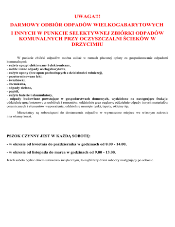 UWAGA!!! DARMOWY ODBIÓR ODPADÓW WIELKOGABARYTOWYCH I INNYCH W PUNKCIE SELEKTYWNEJ ZBIÓRKI ODPADÓW KOMUNALNYCH PRZY OCZYSZCZALNI ŚCIEKÓW W DRZYCIMIU W punkcie zbiórki odpadów można oddać w ramach płaconej opłaty za gospodarowanie odpadami komunalnymi: - zużyty sprzęt elektryczny i elektroniczny, - meble i inne odpady wielogabarytowe, - zużyte opony (bez opon pochodzących z działalności rolniczej), - przeterminowane leki, - świetlówki, - chemikalia, - odpady zielone, - popiół, - zużyte baterie i akumulatory, - odpady budowlane powstające w gospodarstwach domowych, wydzielone na następujące frakcje: oddzielnie gruz betonowy z rozbiórek i remontów; oddzielnie gruz ceglany; oddzielnie odpady innych materiałów ceramicznych i elementów wyposażenia; oddzielnie usunięte tynki, tapety, okleiny itp. Mieszkańcy są zobowiązani do dostarczenia odpadów w wyznaczone miejsce we własnym zakresie i na własny koszt. PSZOK CZYNNY JEST W KAŻDĄ SOBOTĘ: - w okresie od kwietnia do października w godzinach od 8.00 - 14.00, - w okresie od listopada do marca w godzinach od 9.00 - 13.00. Jeżeli sobota będzie dniem ustawowo świątecznym, to najbliższy dzień roboczy następujący po sobocie.