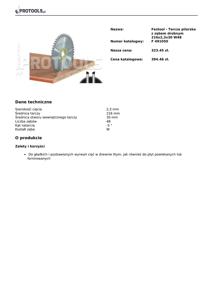 Nazwa: Numer katalogwy: Festool - Tarcza pilarska z zębem drobnym 216x2,3x30 W48 F 491050 Nasza cena: 323.45 zł. Cena katalogowa: 394.46 zł. Dane techniczne Szerokość cięcia Średnica tarczy Średnica otworu wewnętrznego tarczy Liczba zębów Kąt natarcia Kształt zęba 2,3 mm 216 mm 30 mm 48 -5 ° W O produkcie Zalety i korzyści Do gładkich i pozbawionych wyrwań cięć w drewnie litym, jak również do płyt powlekanych lub fornirowanych Powered by TCPDF (www.tcpdf.org)