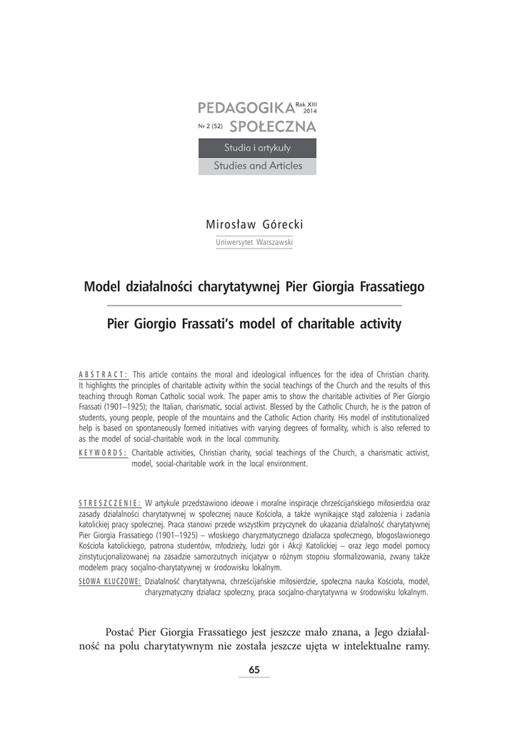 0LURVïDZ *öUHFNL 8QLZHUV\WHW :DUV]DZVNL 0RGHO G]LDïDOQRĂFL FKDU\WDW\ZQHM 3LHU *LRUJLD )UDVVDWLHJR 3LHU *LRUJLR )UDVVDWLijV PRGHO RI FKDULWDEOH DFWLYLW\ $ % 6 7 5 $ & 7 7KLV DUWLFOH FRQWDLQV WKH PRUDO DQG LGHRORJLFDO LQĠXHQFHV IRU WKH LGHD RI &KULVWLDQ FKDULW\ ,WbKLJKOLJKWVWKHSULQFLSOHVRIFKDULWDEOHDFWLYLW\ZLWKLQWKHVRFLDOWHDFKLQJVRIWKH&KXUFKDQGWKHUHVXOWVRIWKLV WHDFKLQJWKURXJK5RPDQ&DWKROLFVRFLDOZRUN7KHSDSHUDPLVWRVKRZWKHFKDULWDEOHDFWLYLWLHVRI3LHU*LRUJLR )UDVVDWLļWKH,WDOLDQFKDULVPDWLFVRFLDODFWLYLVW%OHVVHGE\WKH&DWKROLF&KXUFKKHLVbWKHSDWURQRI VWXGHQWV\RXQJSHRSOHSHRSOHRIWKHPRXQWDLQVDQGWKH&DWKROLF$FWLRQFKDULW\+LVPRGHORIbLQVWLWXWLRQDOL]HG KHOS LV EDVHG RQ VSRQWDQHRXVO\ IRUPHG LQLWLDWLYHV ZLWK YDU\LQJ GHJUHHV RI IRUPDOLW\ ZKLFK LV DOVR UHIHUUHG WR DV WKH PRGHO RI VRFLDOFKDULWDEOH ZRUN LQ WKH ORFDO FRPPXQLW\ . ( < : 2 5 ' 6 &KDULWDEOH DFWLYLWLHV &KULVWLDQ FKDULW\ VRFLDO WHDFKLQJV RI WKH &KXUFK Db FKDULVPDWLF DFWLYLVW PRGHO VRFLDOFKDULWDEOH ZRUN LQ WKH ORFDO HQYLURQPHQW 6 7 5 ( 6 = & = ( 1 , ( :bDUW\NXOHSU]HGVWDZLRQRLGHRZHLbPRUDOQHLQVSLUDFMHFKU]HĂFġDñVNLHJRPLïRVLHUG]LDRUD] ]DVDG\ G]LDïDOQRĂFL FKDU\WDW\ZQHM Zb VSRïHF]QHM QDXFH .RĂFLRïD Db WDNĝH Z\QLNDMÈFH VWÈG ]DïRĝHQLD Lb ]DGDQLD NDWROLFNLHMSUDF\VSRïHF]QHM3UDFDVWDQRZLSU]HGHZV]\VWNLPSU]\F]\QHNGRXND]DQLDG]LDïDOQRĂÊFKDU\WDW\ZQHM 3LHU *LRUJLD )UDVVDWLHJR ļ ļ ZïRVNLHJR FKDU\]PDW\F]QHJR G]LDïDF]D VSRïHF]QHJR EïRJRVïDZLRQHJR .RĂFLRïD NDWROLFNLHJR SDWURQD VWXGHQWöZ PïRG]LHĝ\ OXG]L JöU Lb $NFML .DWROLFNLHM ļ RUD] -HJR PRGHO SRPRF\ ]LQVW\WXFMRQDOL]RZDQHM QD ]DVDG]LH VDPRU]XWQ\FK LQLFMDW\Z Rb UöĝQ\P VWRSQLX VIRUPDOL]RZDQLD ]ZDQ\ WDNĝH PRGHOHP SUDF\ VRFMDOQRFKDU\WDW\ZQHM Zb ĂURGRZLVNX ORNDOQ\P 62:$ ./8&=2:( ']LDïDOQRĂÊ FKDU\WDW\ZQD FKU]HĂFġDñVNLH PLïRVLHUG]LH VSRïHF]QD QDXND .RĂFLRïD PRGHO FKDU\]PDW\F]Q\ G]LDïDF] VSRïHF]Q\ SUDFD VRFMDOQRFKDU\WDW\ZQD Zb ĂURGRZLVNX ORNDOQ\P Postać Pier Giorgia Frassatiego jest jeszcze mało znana, a Jego działalność na polu charytatywnym nie została jeszcze ujęta w intelektualne ramy. 65 0LURVïDZ *öUHFNL 3LHU *LRUJLR )UDVVDWL )RW ]H ]ELRUöZ URG]LQQ\FK Przez wiele lat pracowałem przy archiwizowaniu i opracowywaniu pozostałych po Nim rozproszonych pism, notatek i wspomnień oraz materiałów źródłowych związanych z Jego osobą i powstawaniem kultu Jego świętości. ,GHRZH Lb PRUDOQH LQVSLUDFMH FKU]HĂFġDñVNLHJR PLïRVLHUG]LD RUD] ]DVDG\ G]LDïDOQRĂFL FKDU\WDW\ZQHM Zb VSRïHF]QHM QDXFH .RĂFLRïD Do niedawna cała sfera działalności społecznej realizowanej przez ochotników nazywana była filantropią lub dobroczynnością. Filantropia nawiązuje do mitu prometejskiego wyrażającego bezgraniczne poświęcenie dla dobra ludzkości. Dobroczynność natomiast jest określeniem związanym z chrześcijańskim ideałem miłości bliźniego, który uosabia biblijna postać miłosiernego Samarytanina, i ewangeliczną cnotą miłosierdzia, które zobowiązuje do roztaczania opieki nad najsłabszymi członkami wspólnoty. Toteż wszelkie przedsięwzięcia prowadzone przez Kościół nazywa się działalnością charytatywną. Dobroczynność tym różni się od filantropii, że nie jest chwilowym odruchem, działaniem opartym na litości i łasce, „łasce dobrych chęci”. Z kolei to, co łączy filantropię z dobroczynnością, bez względu na rodzaj podejmowanych czynności, to jest ich ukierunkowanie na pomnażanie dobra wspólnego. Pedagogika społeczna dopiero odkrywa ten teren badań. Istnieje bardzo obfita literatura dotycząca dobroczynności, miłosierdzia. Ostatnio do znanych opracowań z tego zakresu należą następujące prace: ks. Jana Niewęgłowskiego o działalności wychowawczo-społecznej salezjanów, ze szczególnym uwzględnieniem działalności wychowawczej ks. Giovanniego Bosco (Niewęgłowski 66 ']LDïDOQRĂÊ FKDU\WDW\ZQD 3LHU *LRUJLD )UDVVDWLHJR 2000, 2011); ks. Aleksandra Wóycickiego o pracy społecznej w parafii (Wóycicki 1937); Wiesława Theissa o działalności społeczno-wychowawczej ks. Henryka Szumana (Theiss 2012); ks. Zbigniewa Babickiego o społeczno-wychowawczej działalności Księży Pallotynów w Polsce (Babicki 2009). Nie ulega wątpliwości, że uwzględnienie dorobku katolickiego nurtu pracy społecznej wzbogaci, rozszerzy i pogłębi zarówno stronę aksjologiczno-teoretyczną, diagnostyczno-metodyczną oraz praktyczną dyscypliny, której mocne podwaliny zbudowała swego czasu Helena Radlińska. Wyróżnia się trzy główne źródła pracy społecznej: chrześcijańskie miłosierdzie, demokrację i solidarność w rozumieniu krytycznej przebudowy społecznej. Pierwsze podejście opiera się na idei miłosierdzia i pomocy bliźniemu, rozumianych w duchu chrześcijańskim, jako bezwarunkowy imperatyw moralny, drugie – na idei demokracji i demokratyzacji życia społecznego oraz niezbywalnych prawach człowieka do rozwoju, zaś trzecie – na zasadzie wolności, równości i międzyludzkim braterstwie, walce z wyzyskiem i nędzą społeczną, prowadzoną w imię równości i sprawiedliwości społecznej (Smolińska-Theiss 1994). Uczestnicząc w budowie określonego porządku opartego na sprawiedliwości i miłości społecznej należy przestrzegać następujących podstawowych zasad społecznych: a) zasady respektowania podmiotowości człowieka – nakaz traktowania człowieka jak osoby, a nie jak danego przypadku. Nie może w związku z tym dochodzić do ubezwłasnowolnienia człowieka ani ograniczania w jakikolwiek sposób jego prawa do samostanowienia; b) zasady dobra wspólnego – wszystkie podmioty życia społecznego, czyli osoby, grupy społeczne i wszelkie społeczności (np. rodzina, społeczeństwo, państwo) są zobowiązane do wnoszenia własnego wkładu w tworzenie odpowiednich warunków życia społecznego; c) zasady solidaryzmu społecznego – współzależność i współodpowiedzialność „wszystkich za wszystkich”; d) zasady pomocniczości (subsydiarności) – podmioty państwowe powinny przej